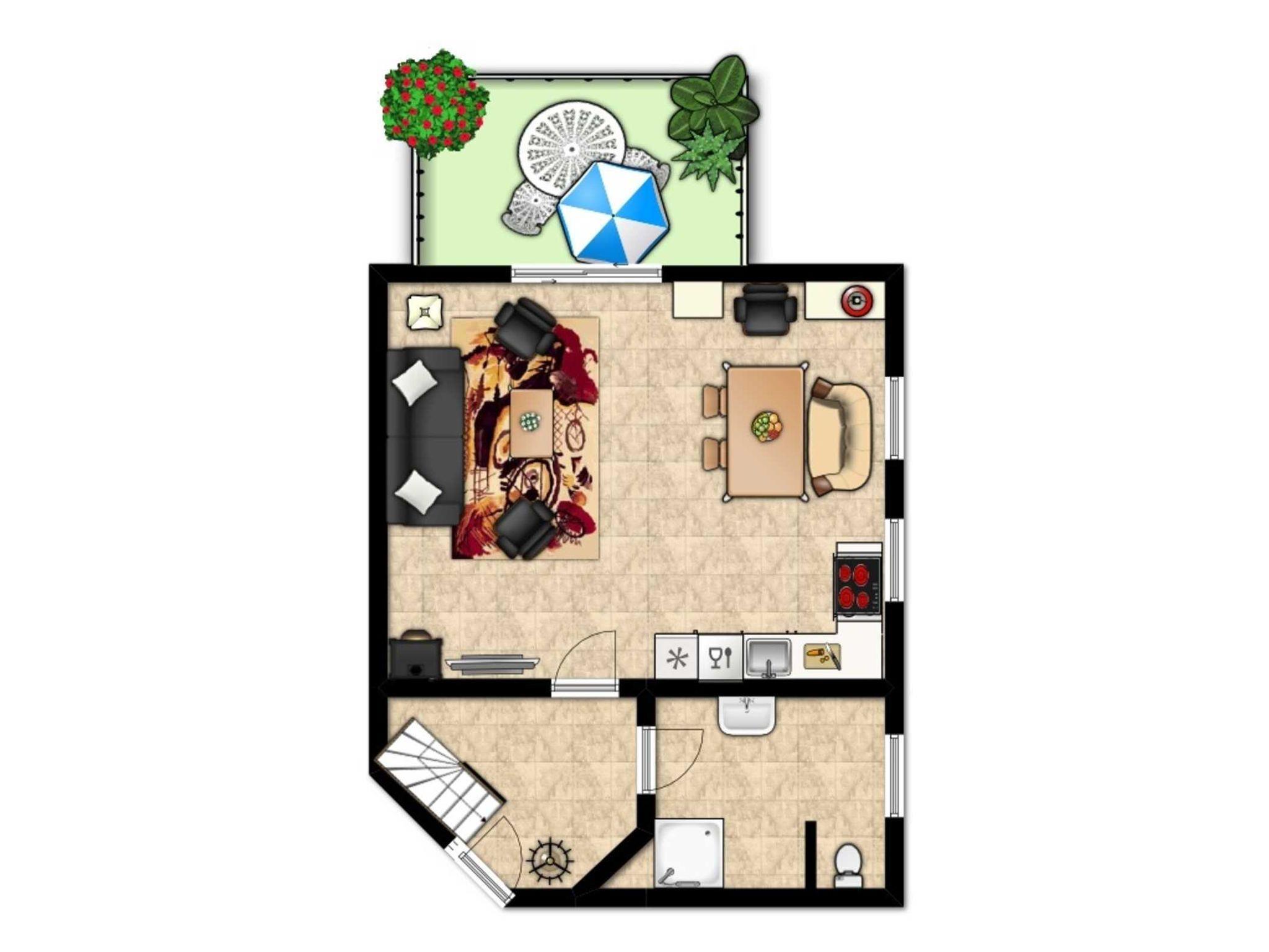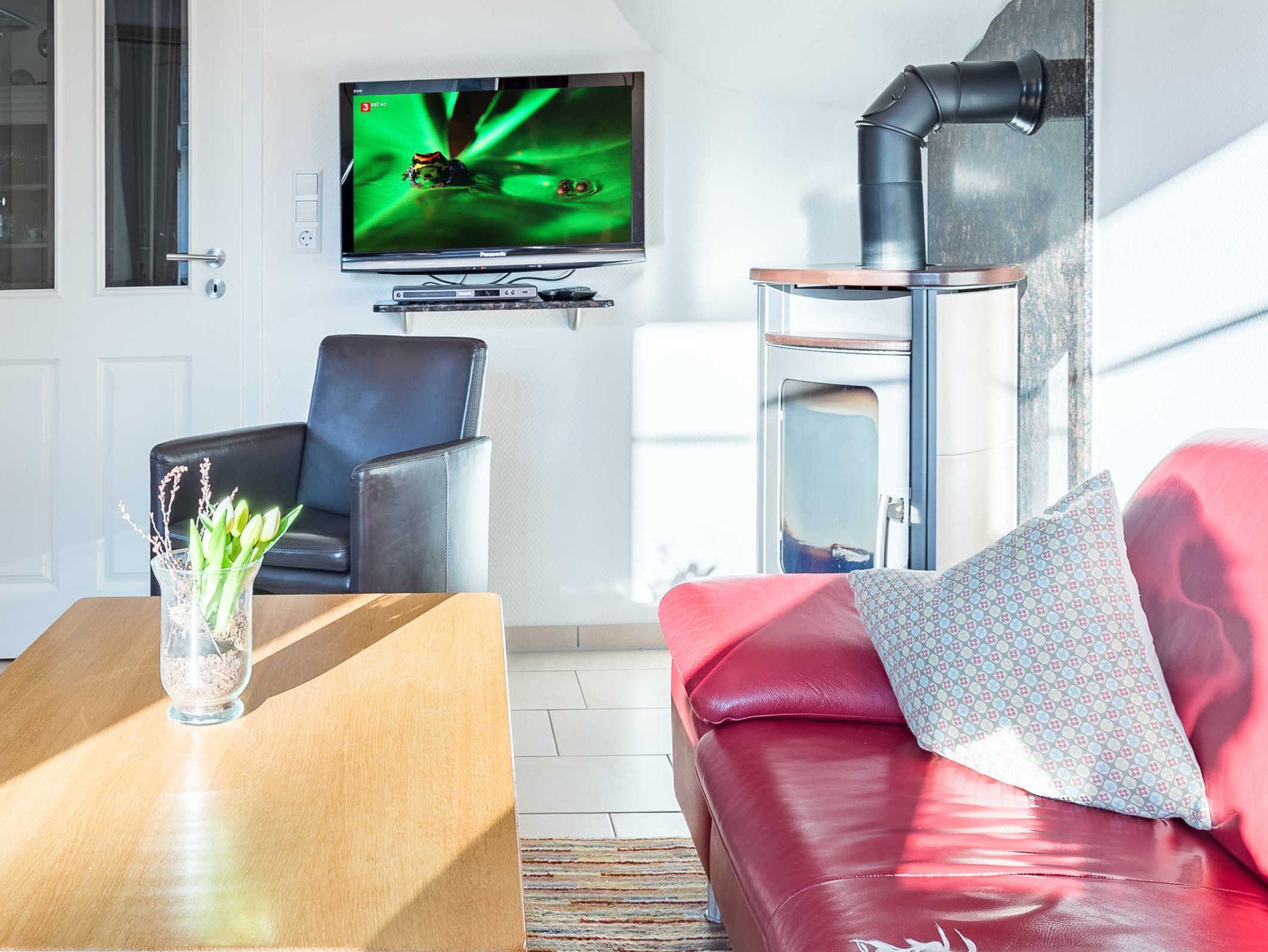 Das lichtdurchflutete Wohnzimmer in der ersten Wohnebene bietet neben der großen modernen Couch einen Kamin, der an kühlen Abenden zu gemütlichem Beisammensein einlädt. Ein Flatscreen-TV sorgt auf Wunsch für Unterhaltung. Die Couch ist ausziehbar und bietet somit den 5. Schlafplatz.