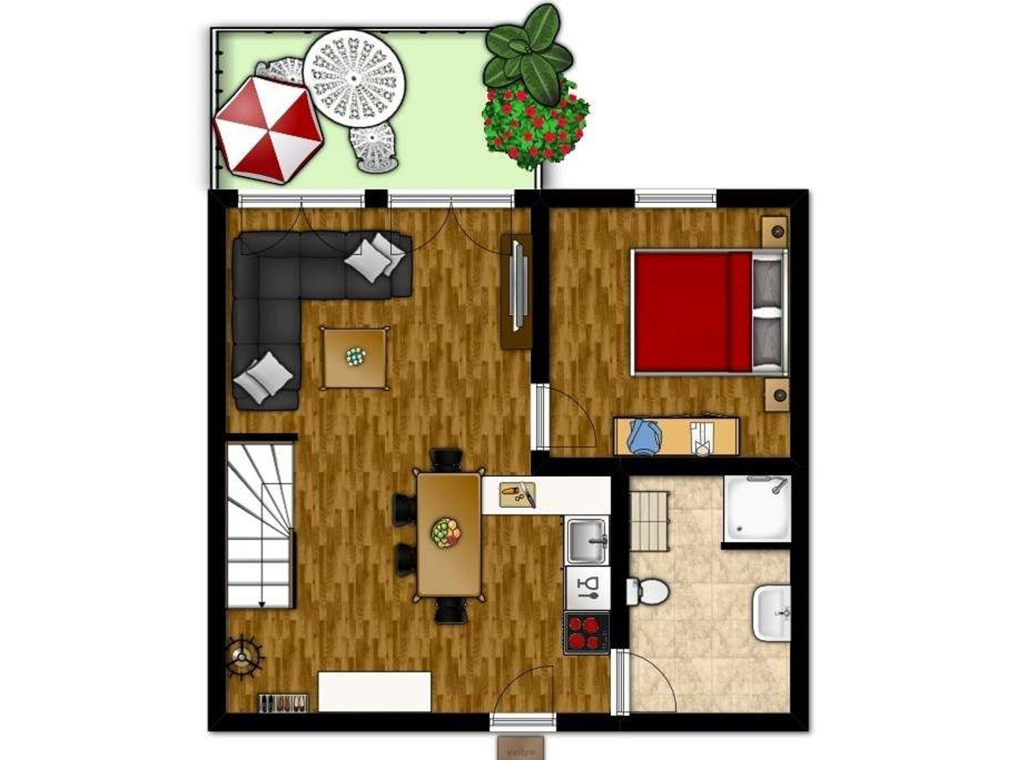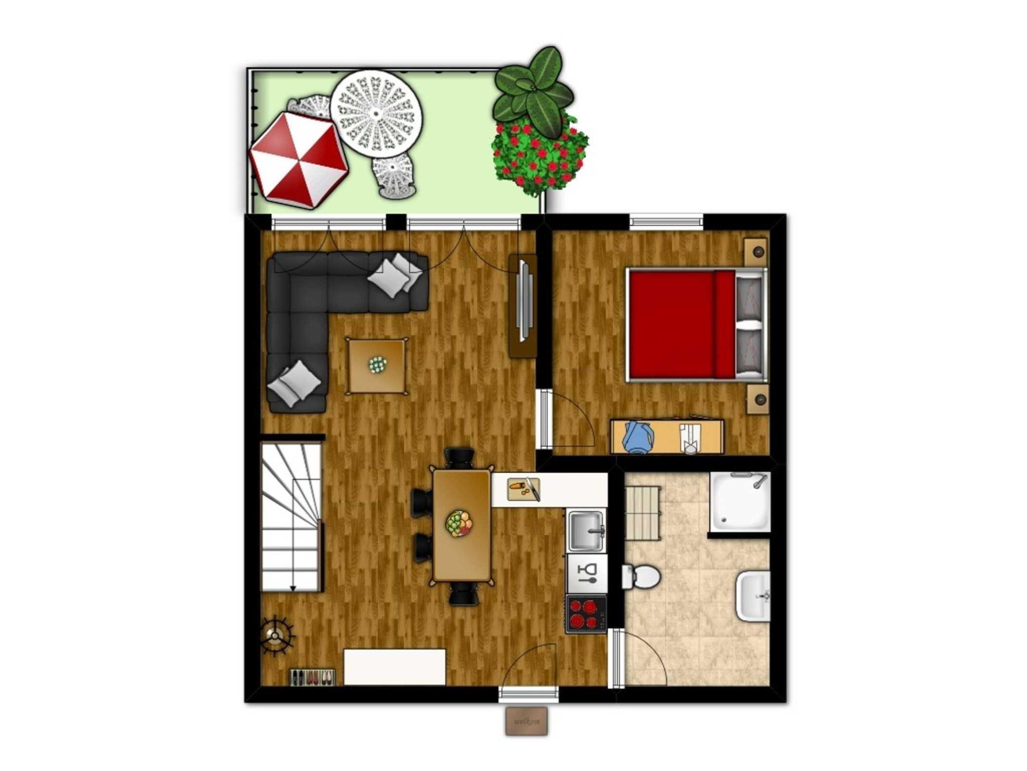 In einem rundum geschmackvollen Ambiente genießen die Gäste zeitgemäßen Komfort. Der offene Wohn- und Essbereich in der 1. Wohnebene enthält u.a. eine hervorragend bestückte Küchenzeile sowie eine strapazierfähige Polsterlandschaft, die zu gemütlichen Gesprächsrunden und entspannenden Lesestunden einlädt. Für Unterhaltung sorgen hier ein großer moderner Flatscreen SAT-TV und ein DVD-Player.