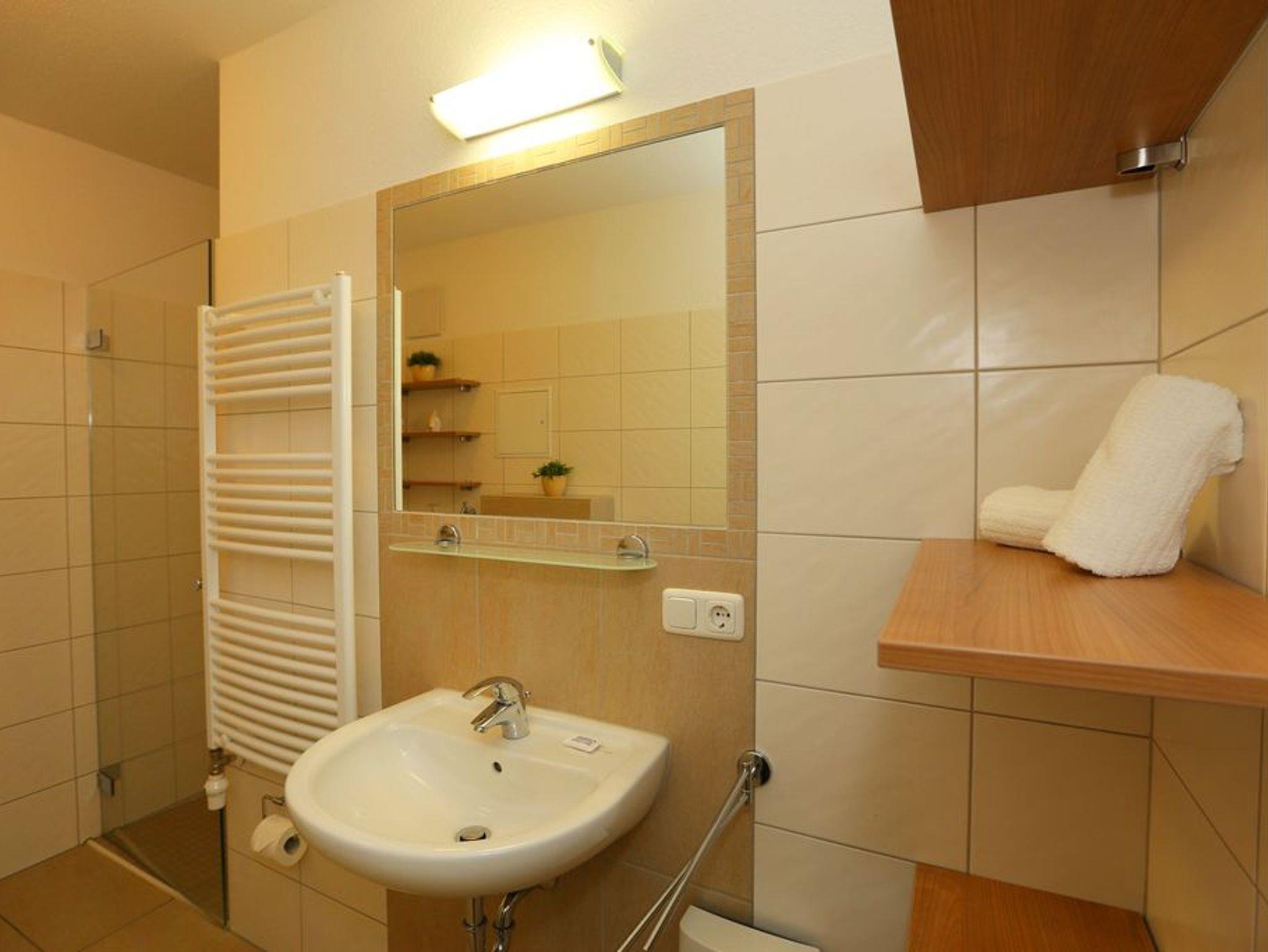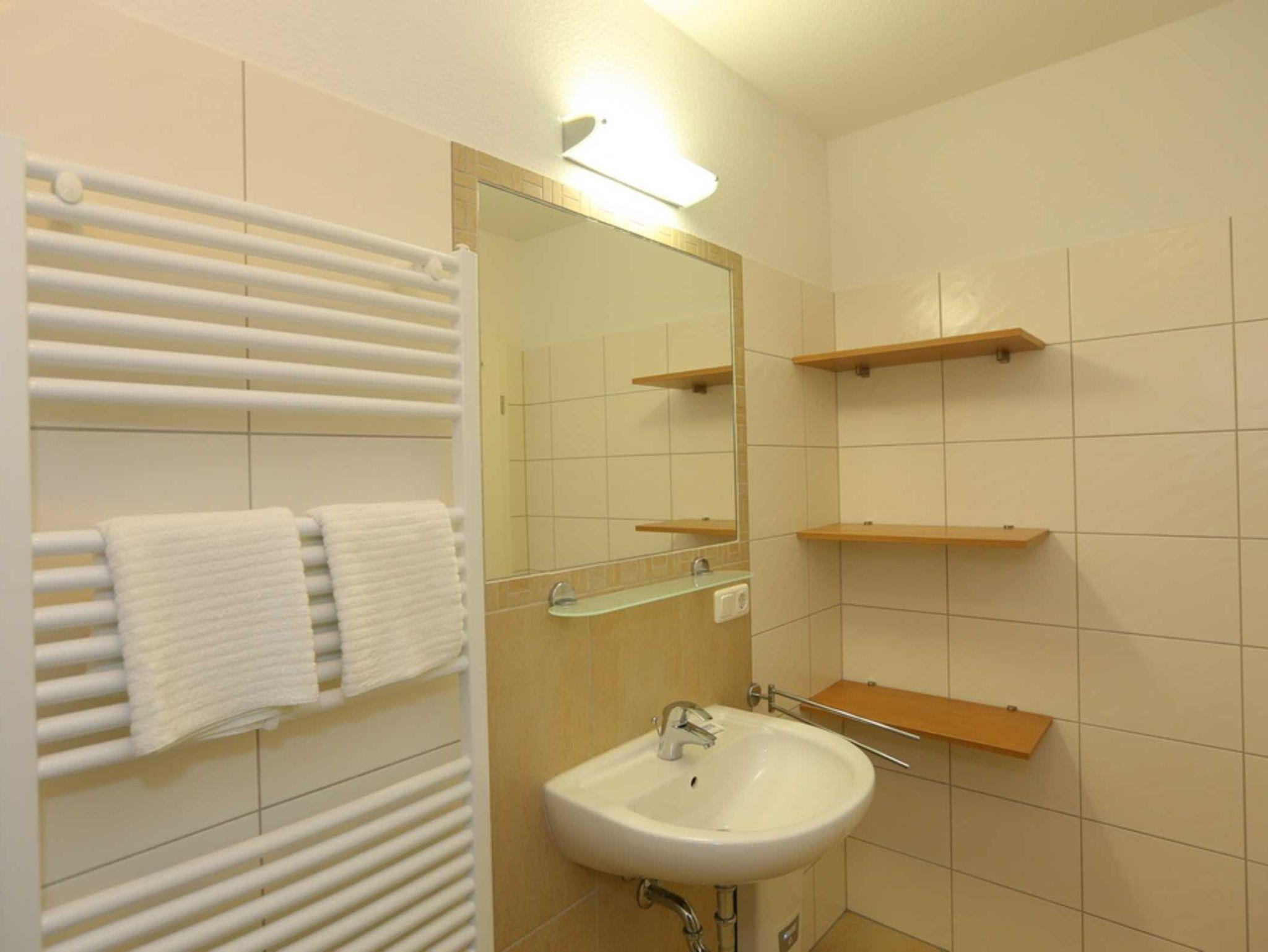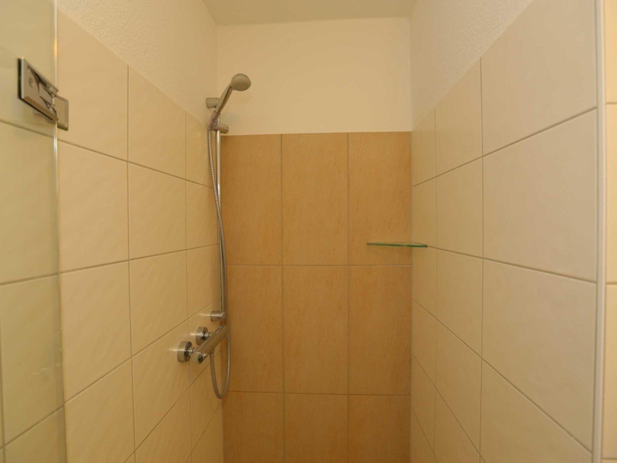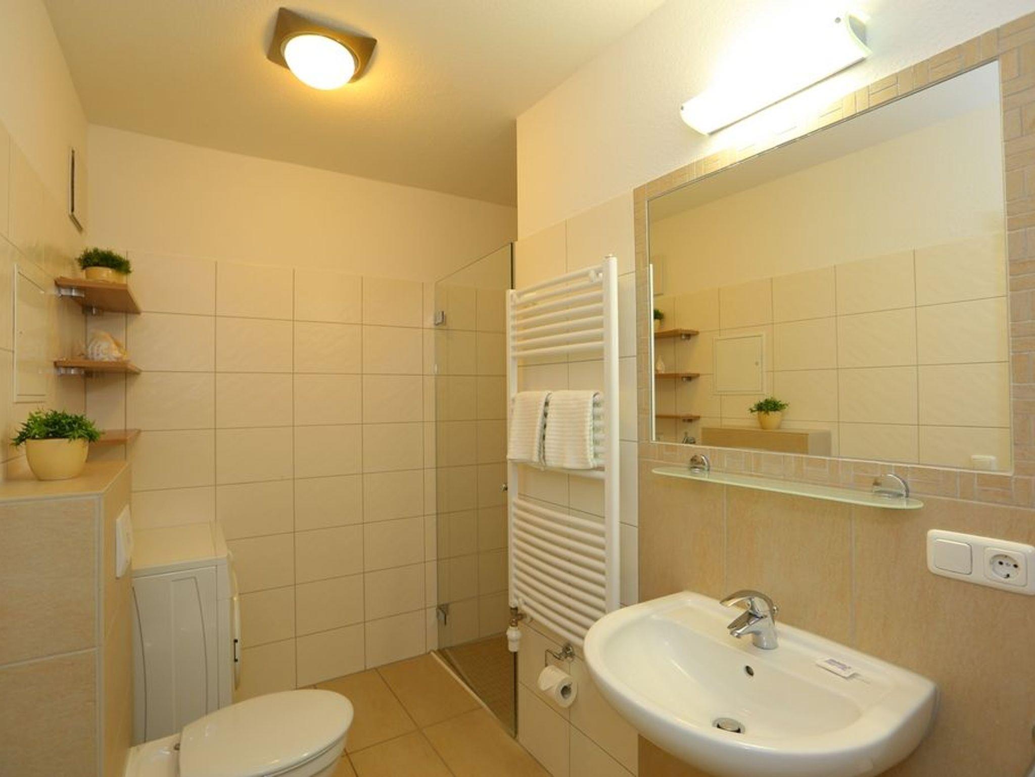 Im praktischen Bad mit ebenerdiger Dusche befinden sich auch eine Waschmaschine und ein Handtuchtrockner.
