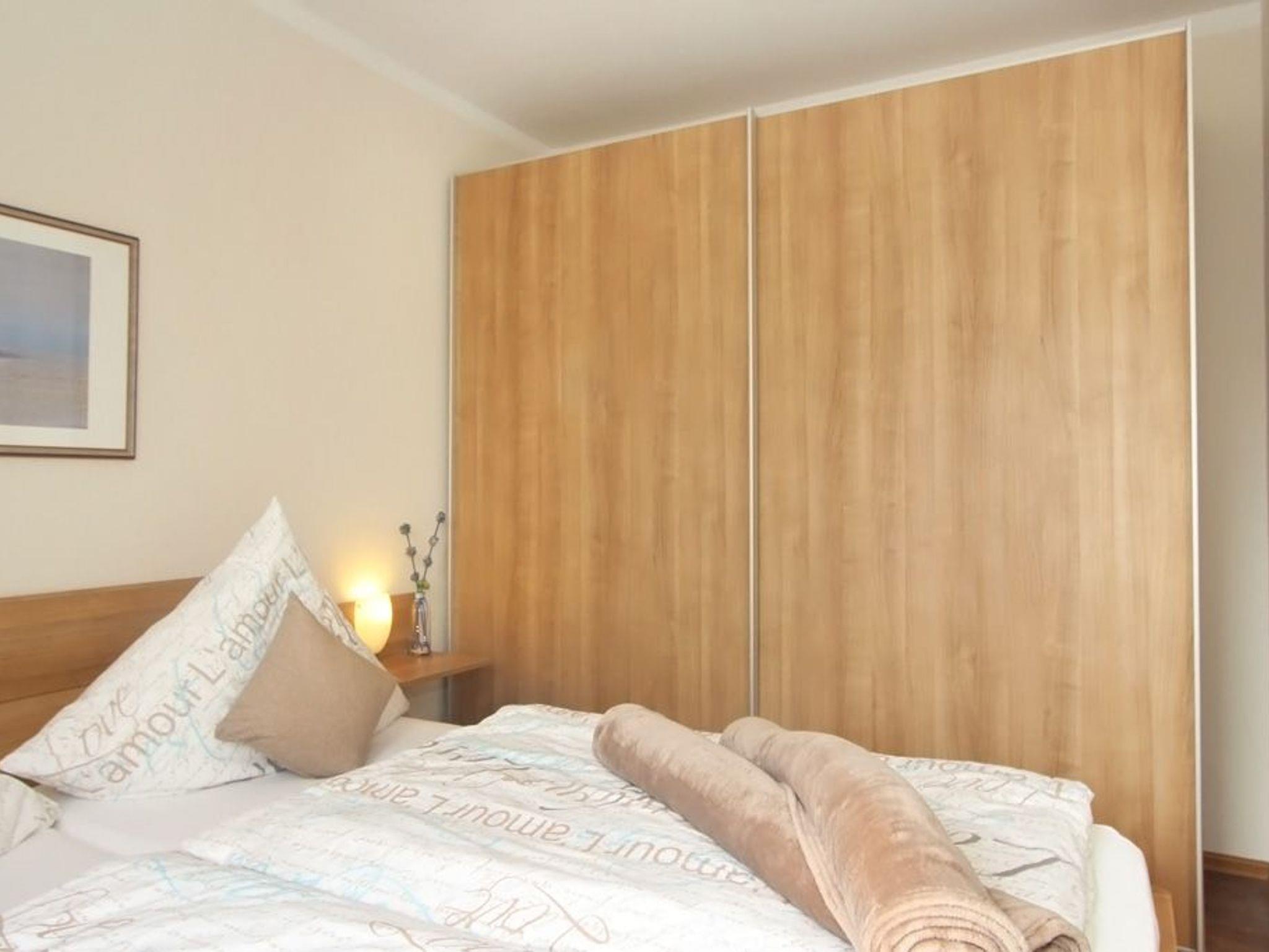 Des Weiteren befindet sich auf dieser Ebene das Schlafzimmer mit dem Doppelbett, einem großen Kleiderschrank sowie einem weiteren Flatscreen-TV.