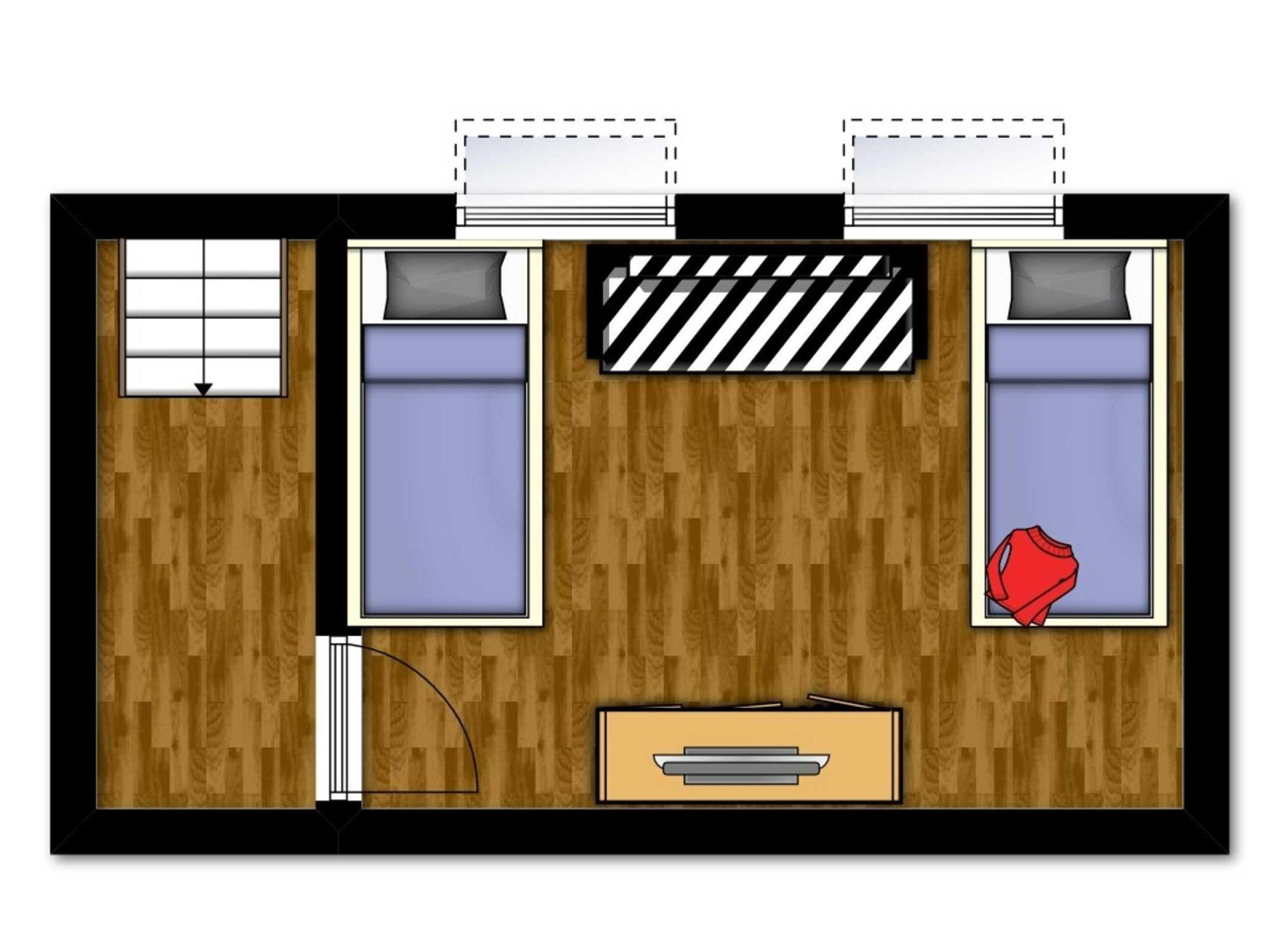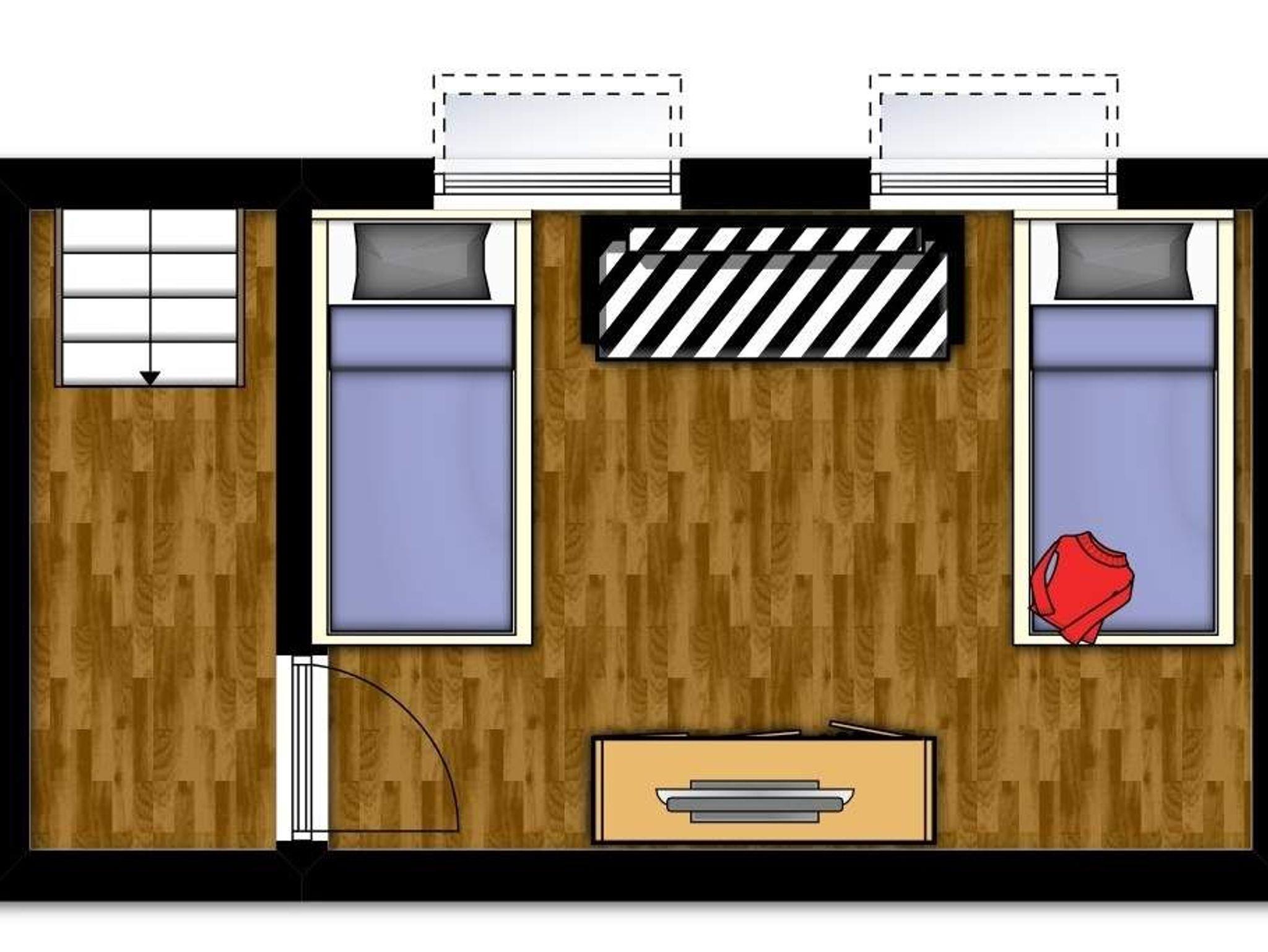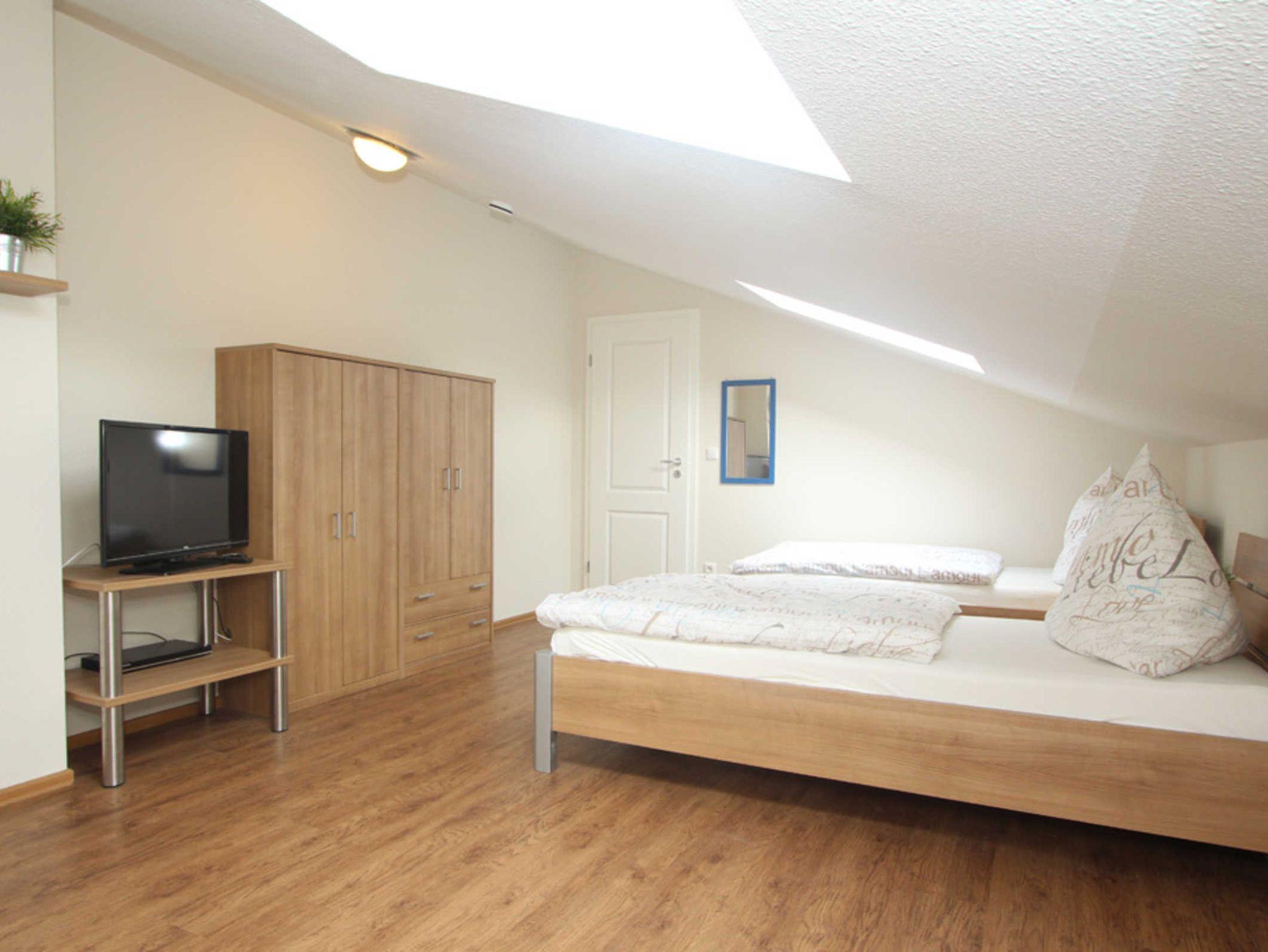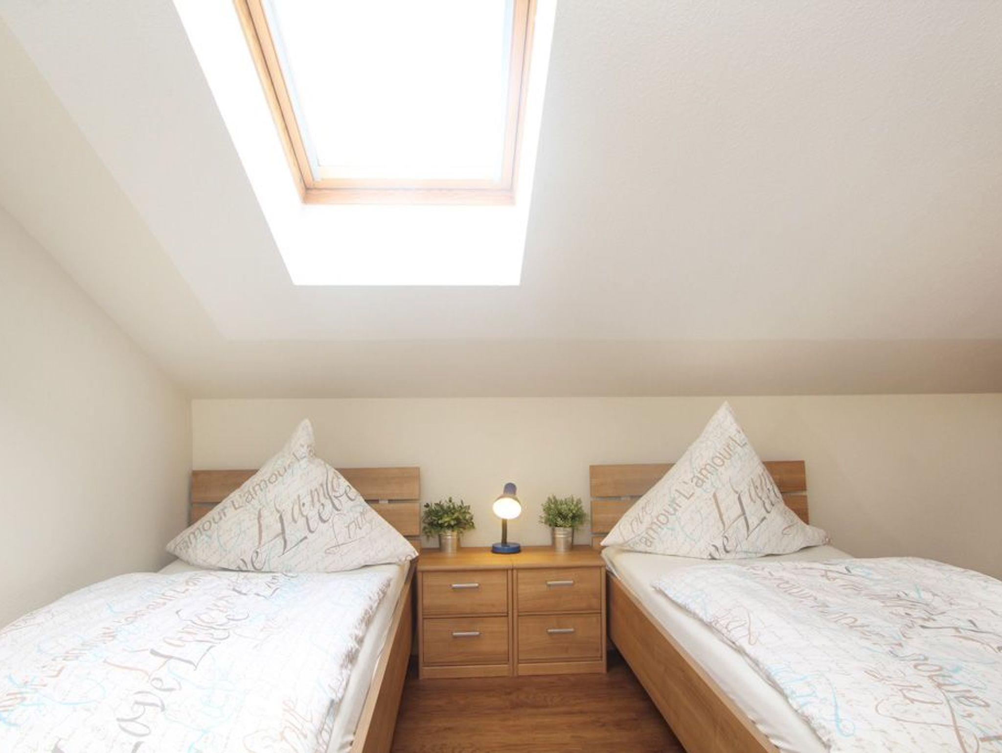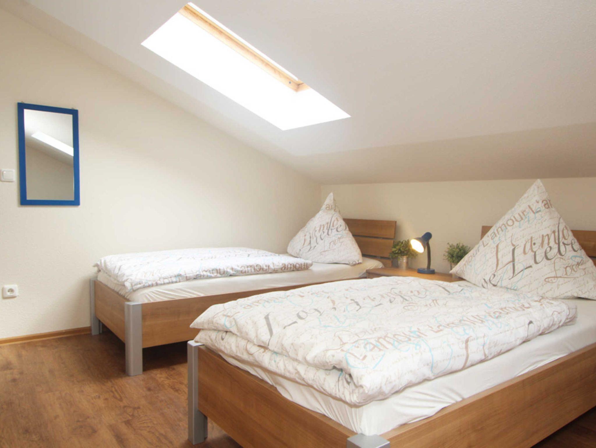 Das zweite Schlafzimmer/ Kinderzimmer in der 2. Ebene, im DG ist mit zwei Einzelbetten und zusätzlicher Schlafcouch sowie ebenfalls einem eigenen Flatscreen-TV ausgestattet.