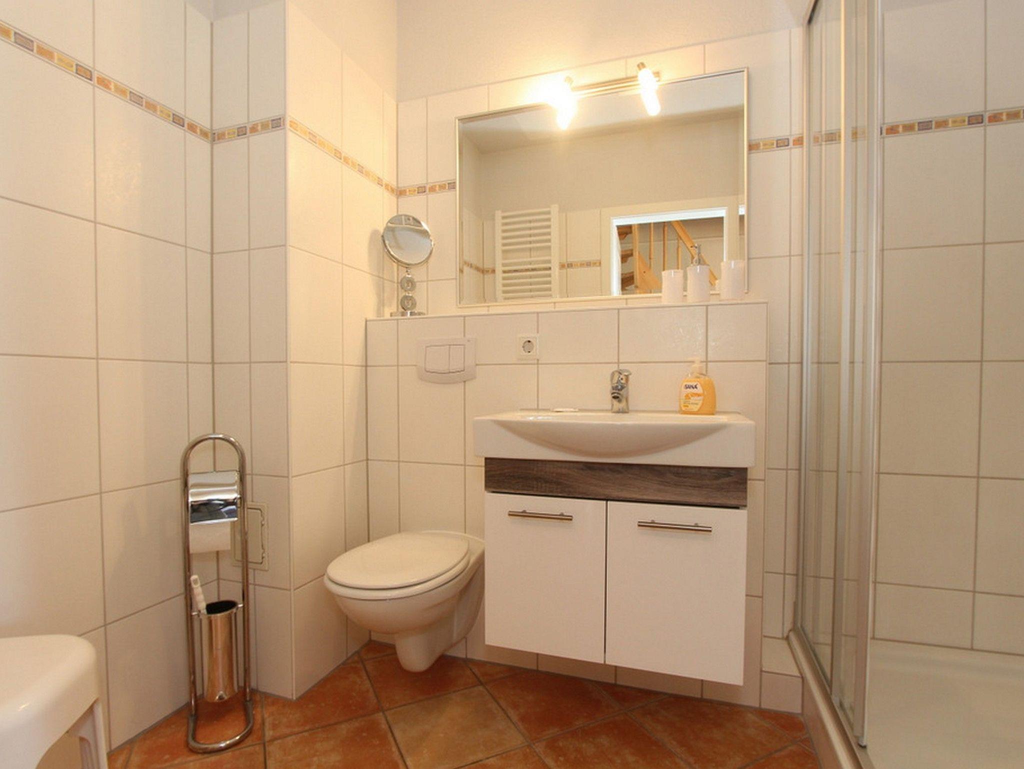 Im Badezimmer finden Sie neben Dusche und WC auch einen Handtuchtrockner und eine Waschmaschine.