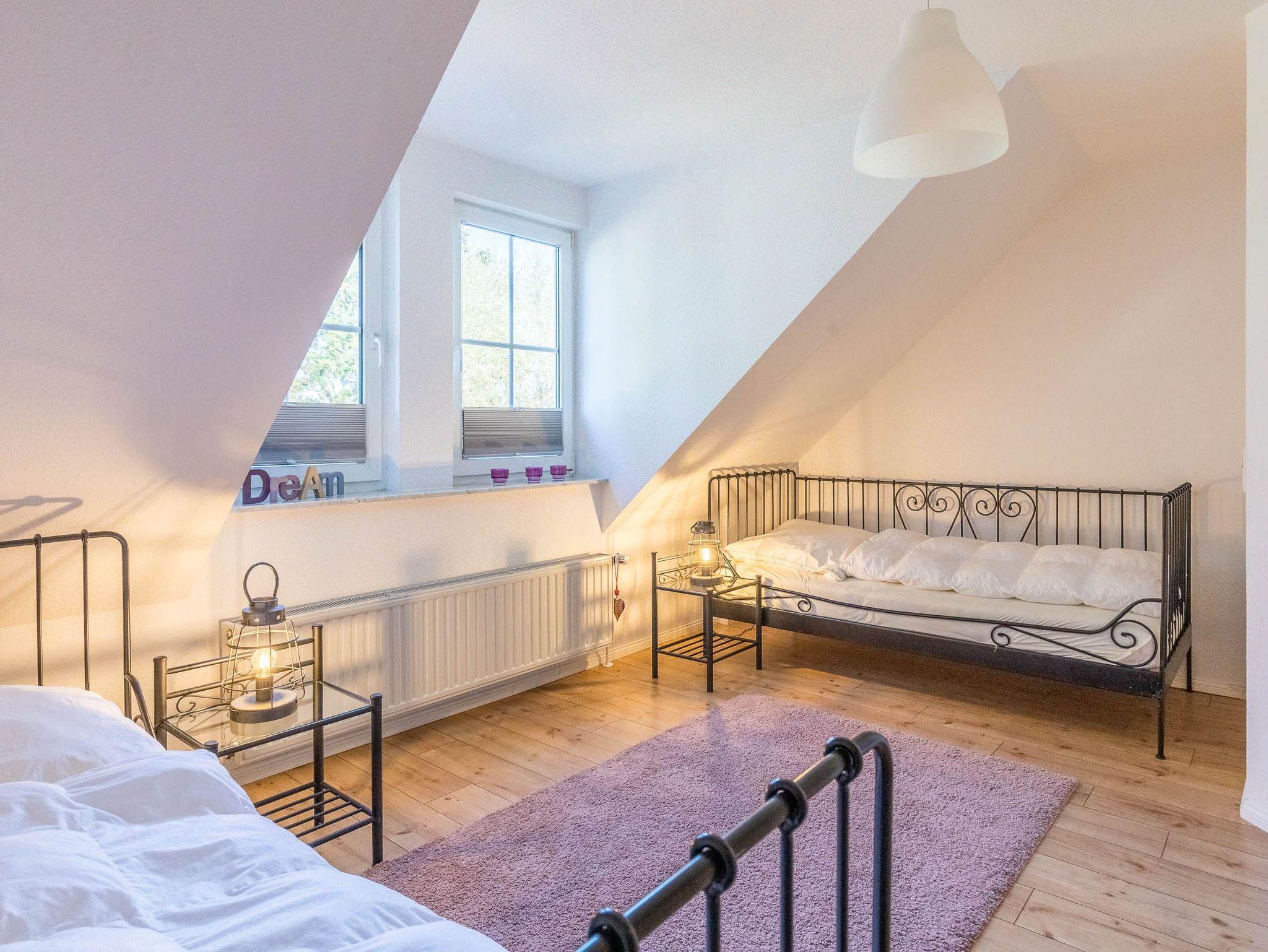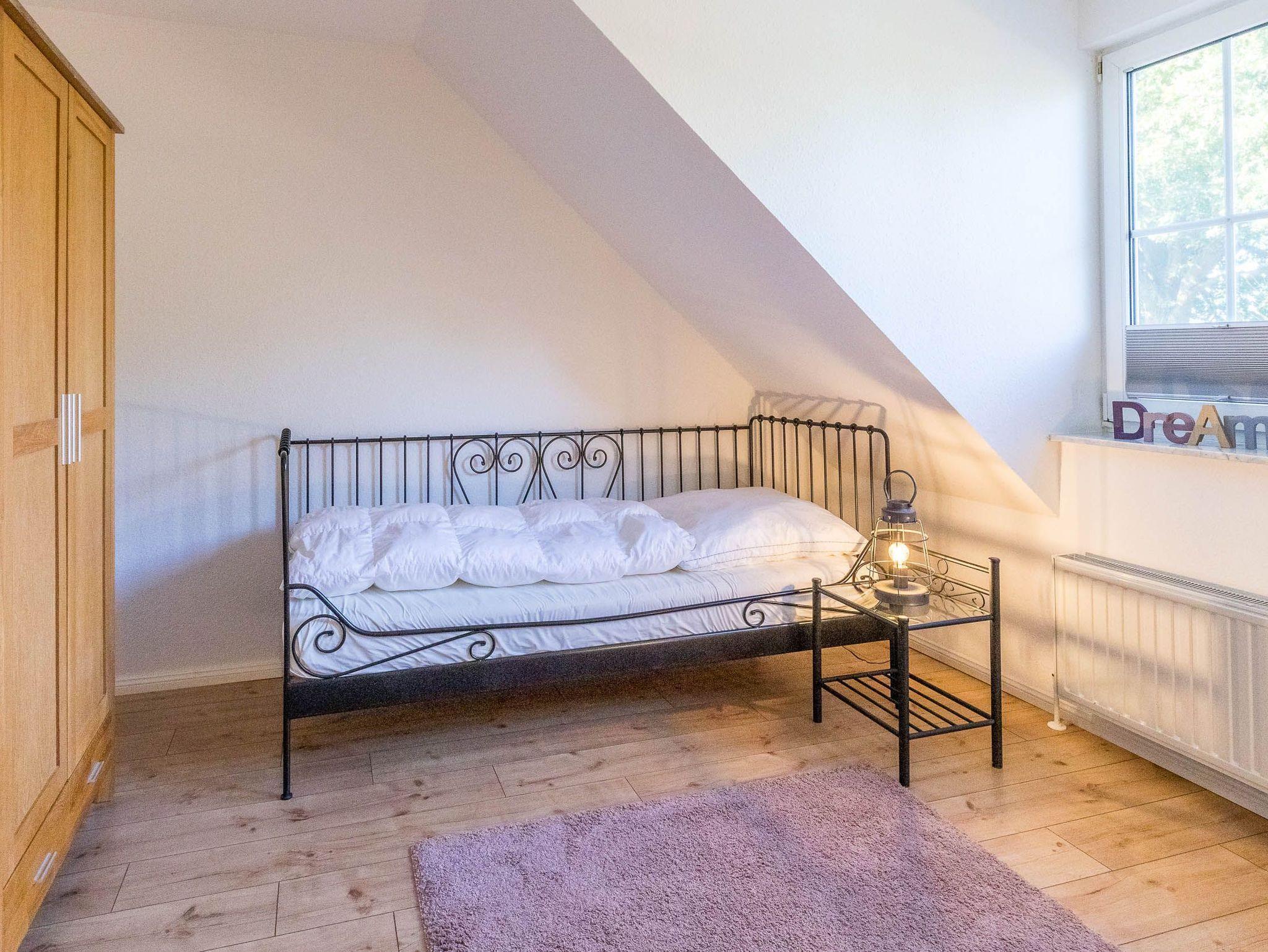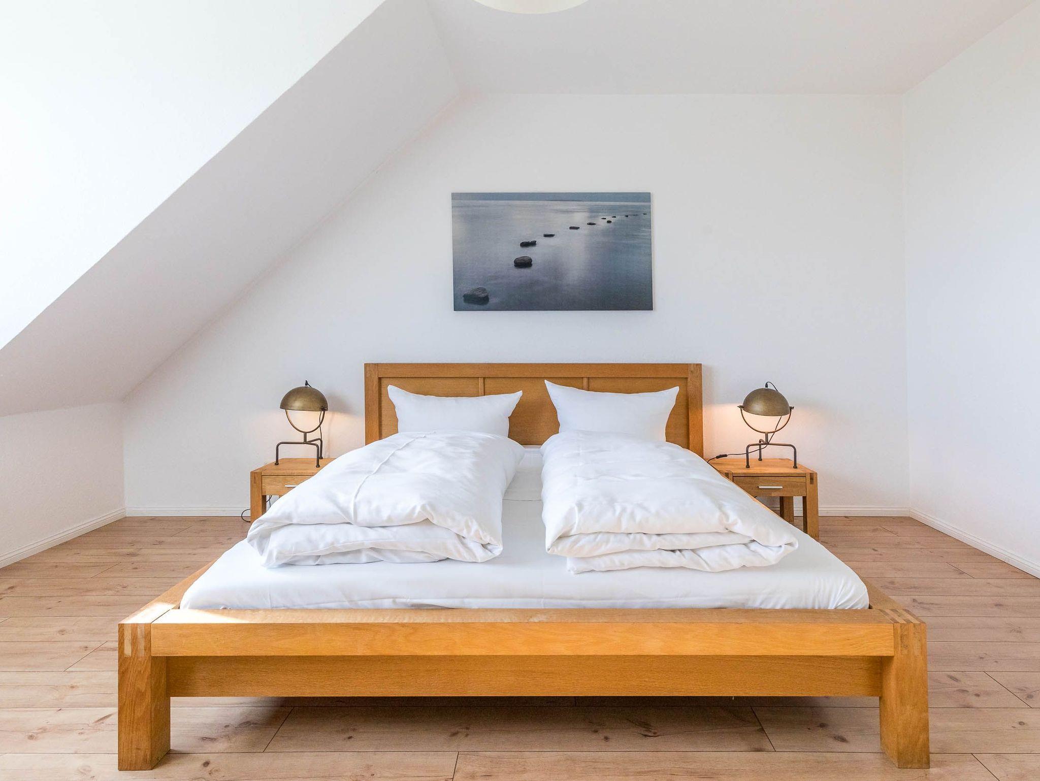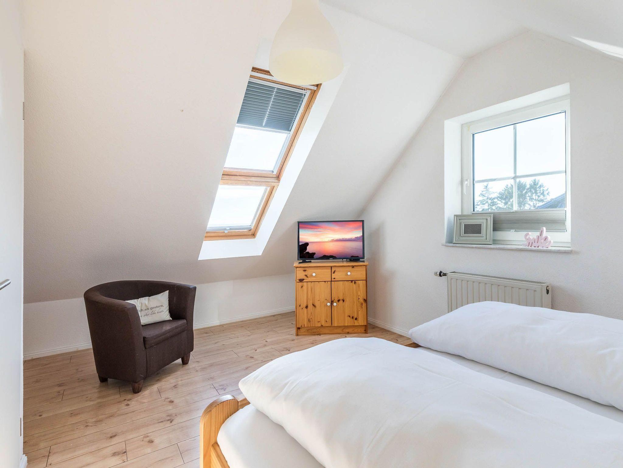 Vom Flur aus führt Sie die Treppe weiter hinauf ins Dachgeschoss, wo sich die dritte Schlafmöglichkeit befindet. Auch dieses Zimmer ist mit einem gemütlichen Doppelbett und einer kleinen Sitzecke ausgestattet.