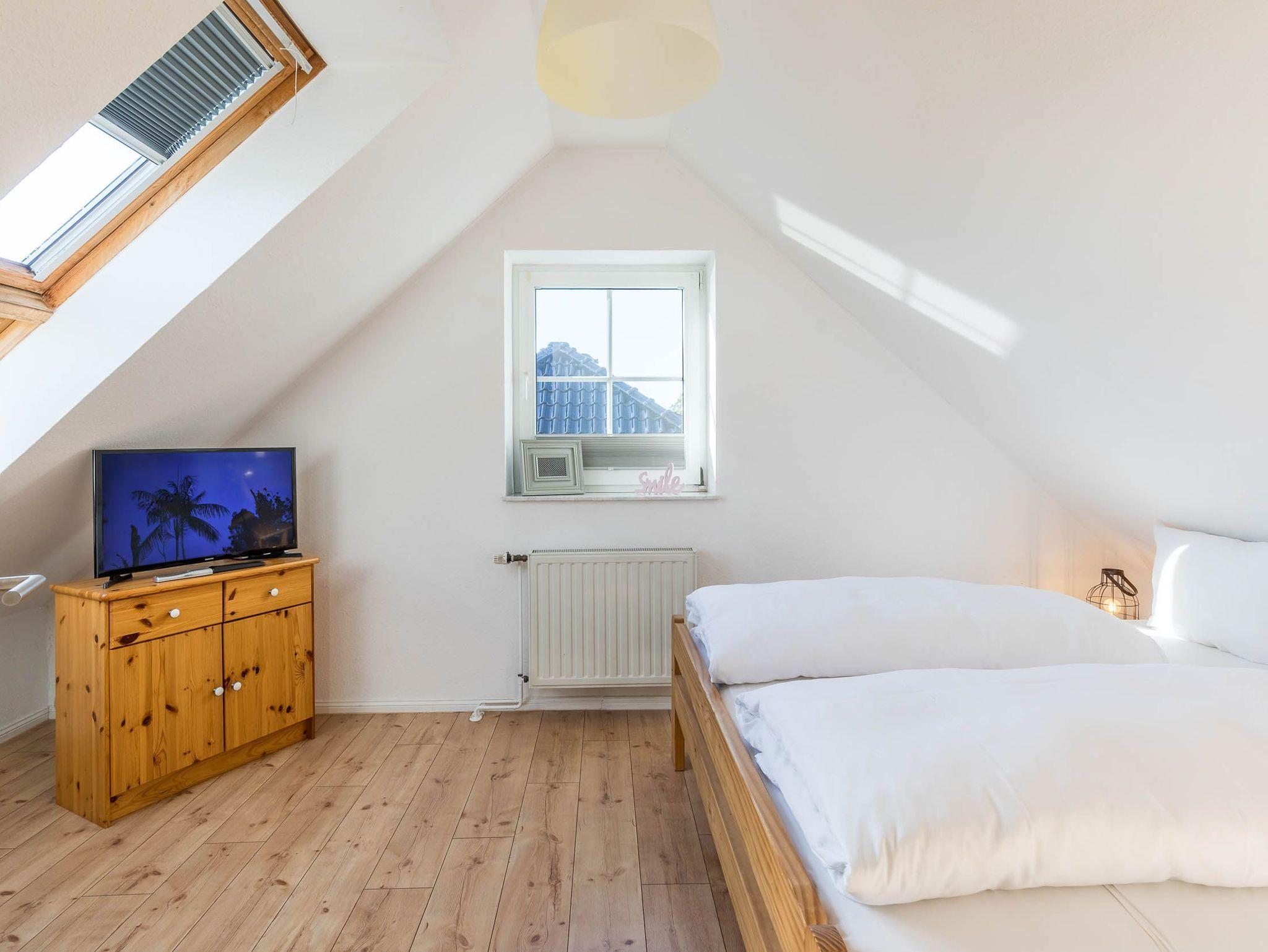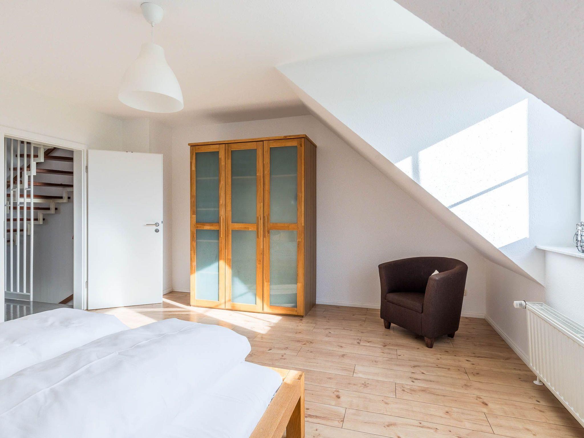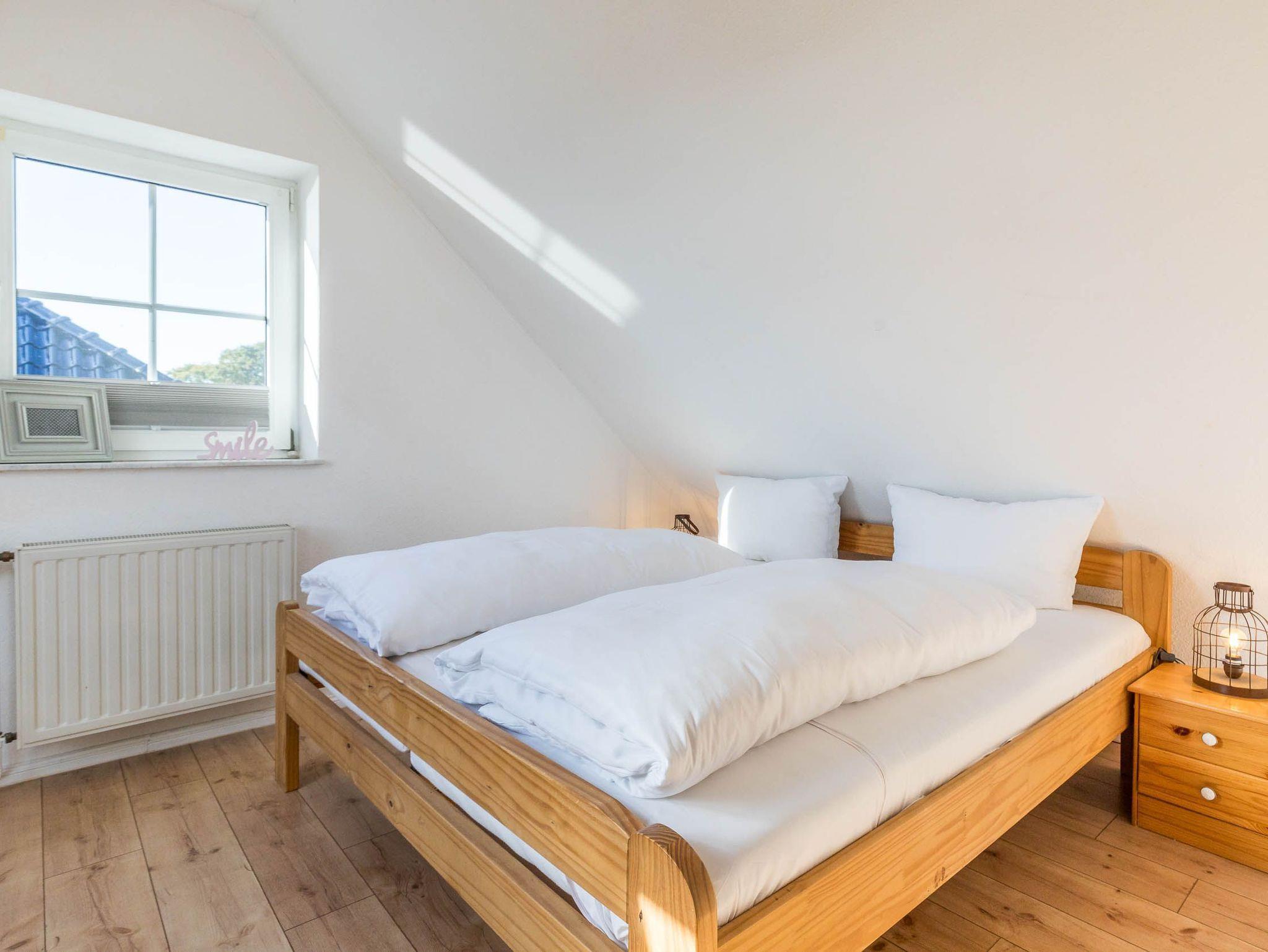 Vom Flur aus führt Sie die Treppe weiter hinauf ins Dachgeschoss, wo sich die dritte Schlafmöglichkeit befindet. Auch dieses Zimmer ist mit einem gemütlichen Doppelbett und einer kleinen Sitzecke ausgestattet.
