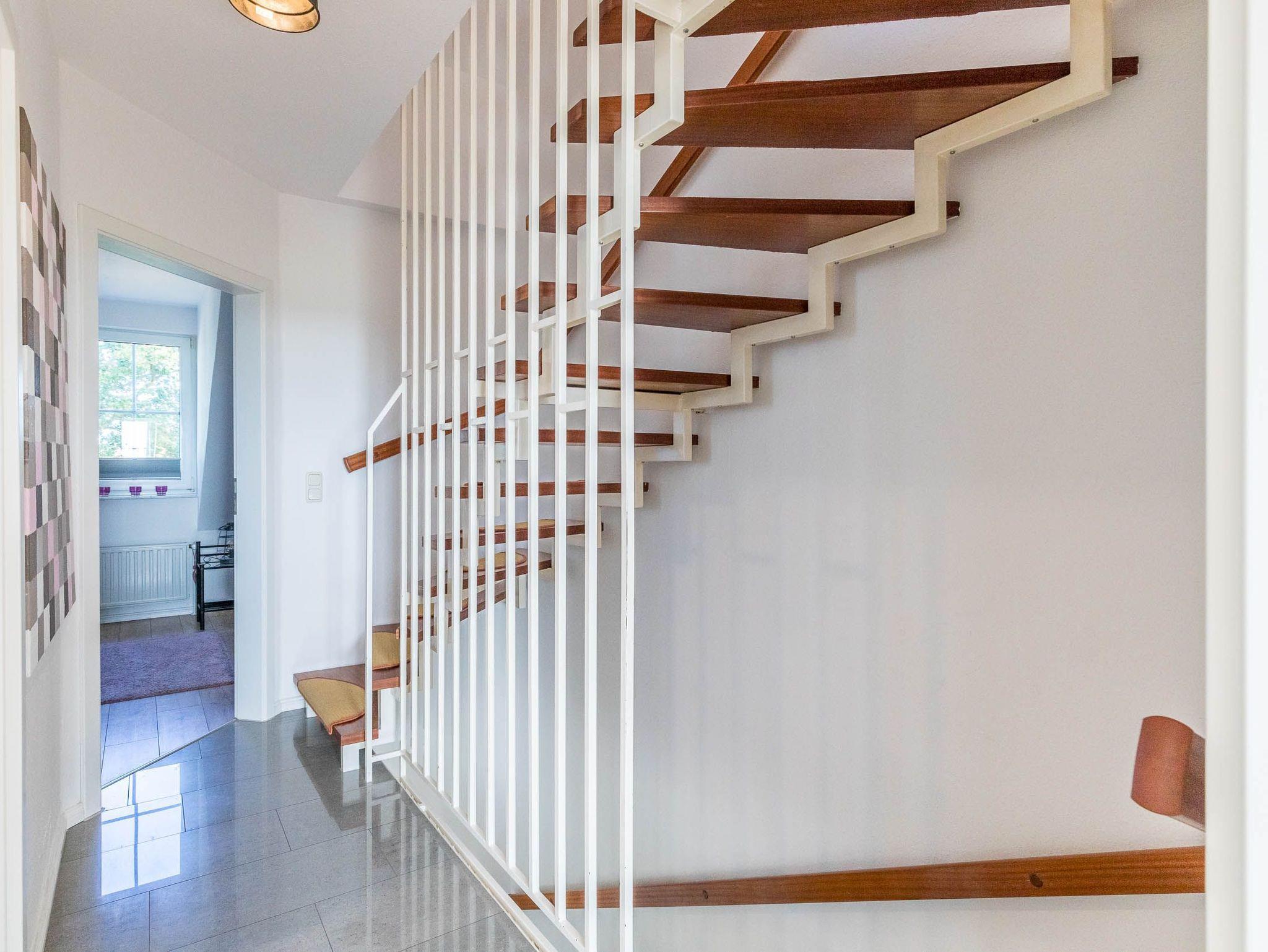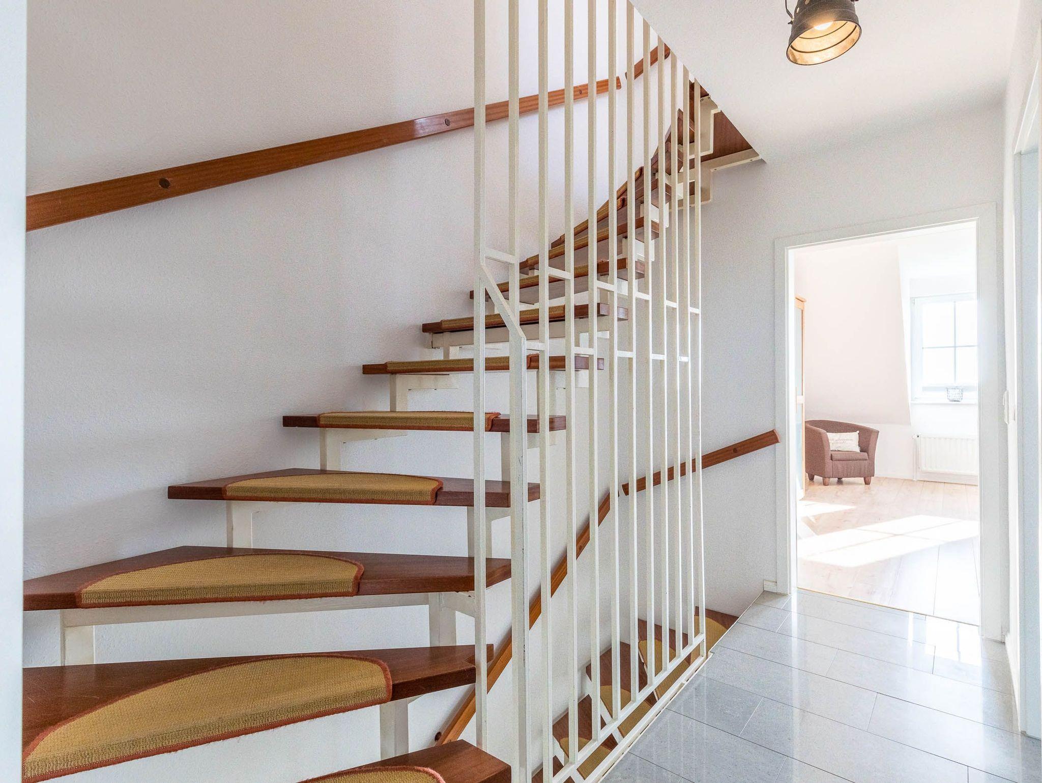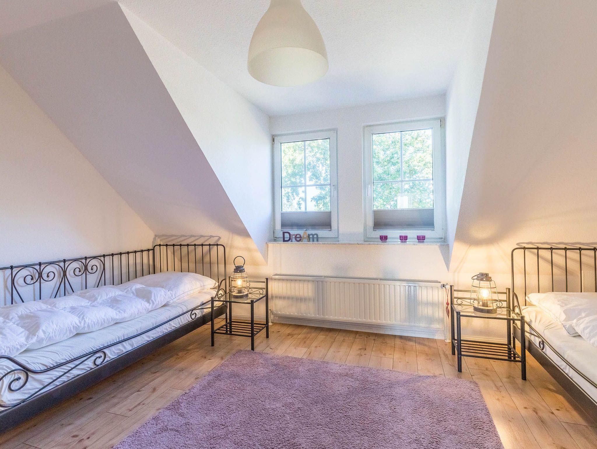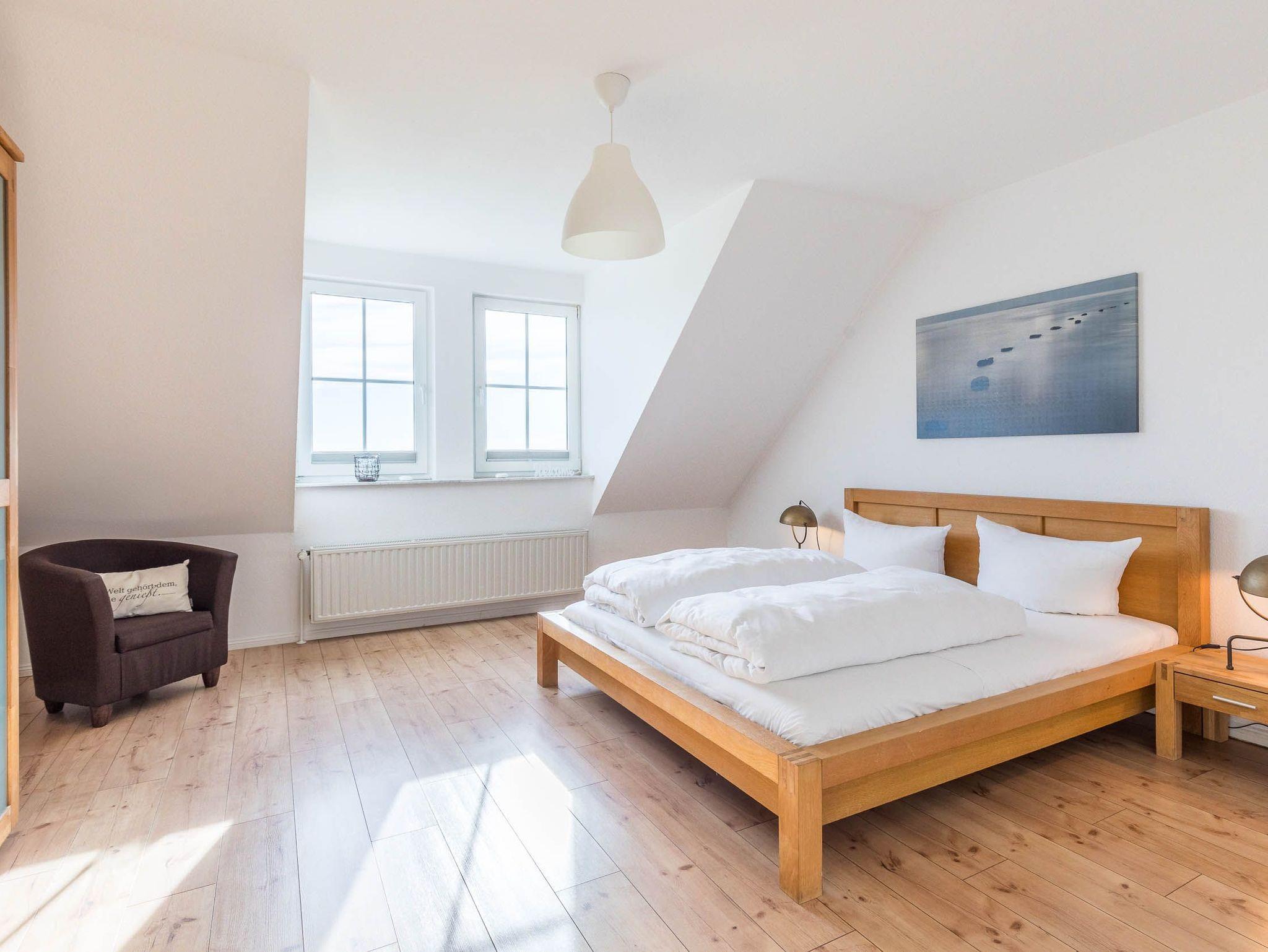 Vom Flur aus führt Sie die Treppe weiter hinauf ins Dachgeschoss, wo sich die dritte Schlafmöglichkeit befindet. Auch dieses Zimmer ist mit einem gemütlichen Doppelbett und einer kleinen Sitzecke ausgestattet.