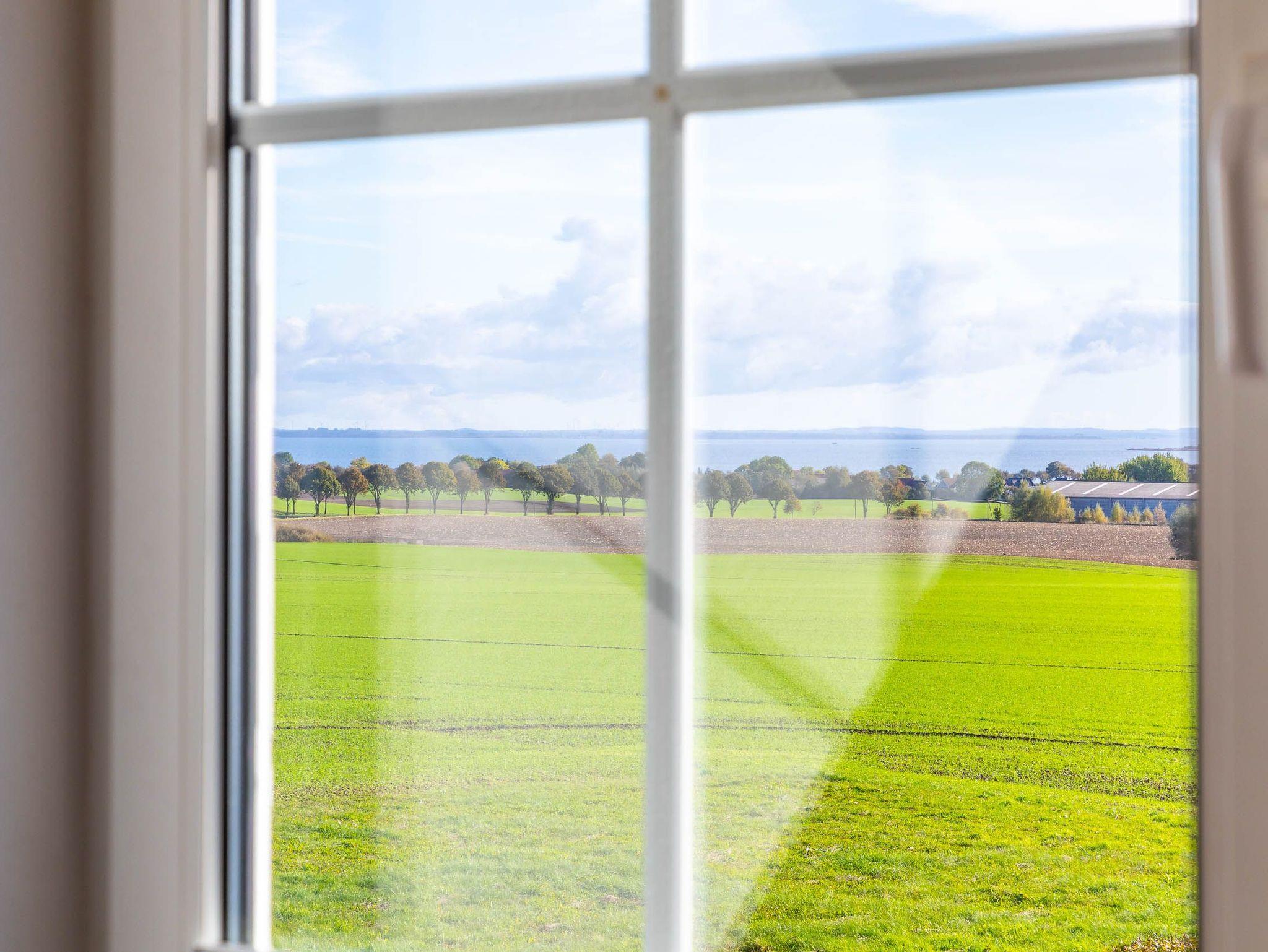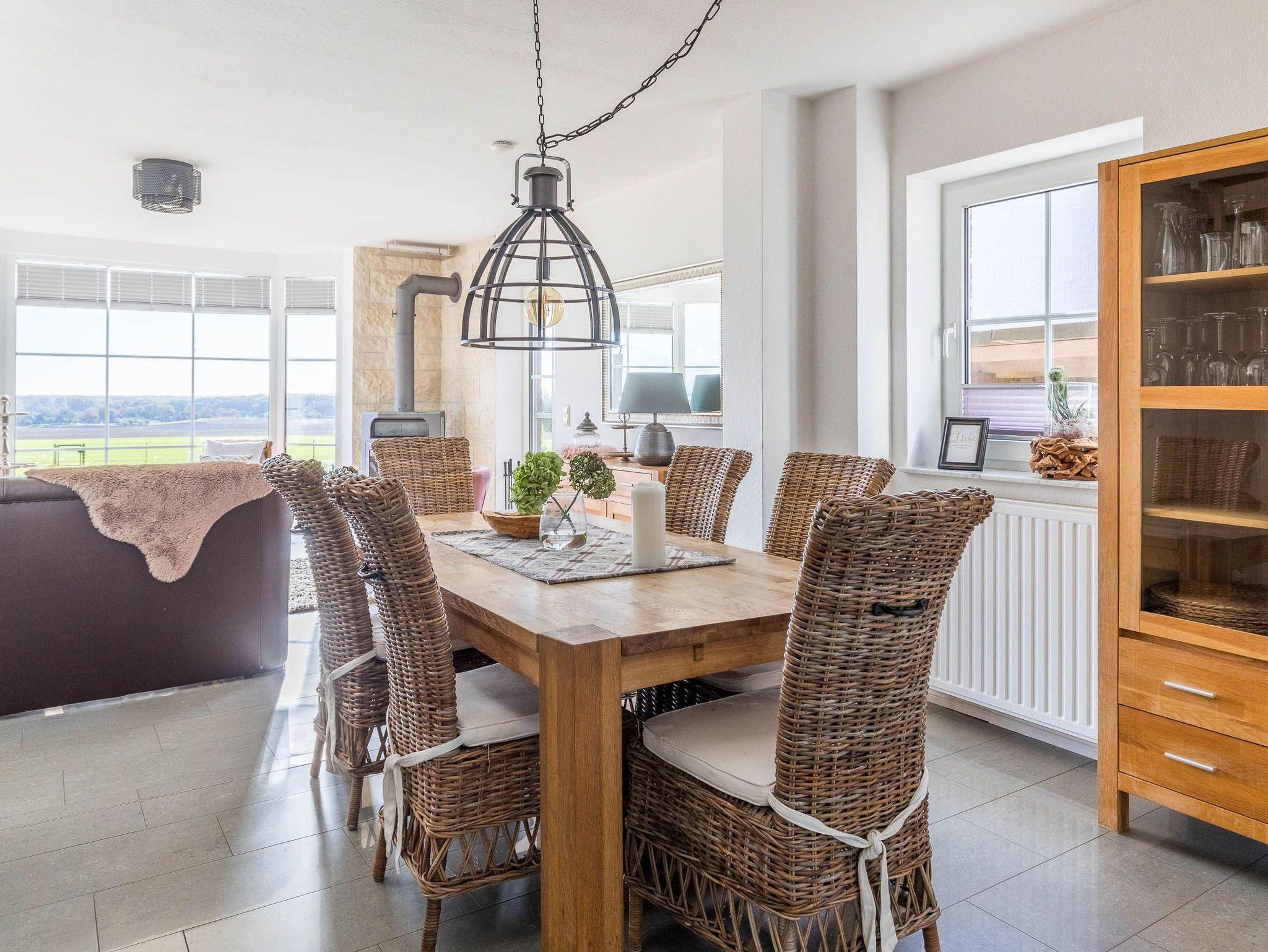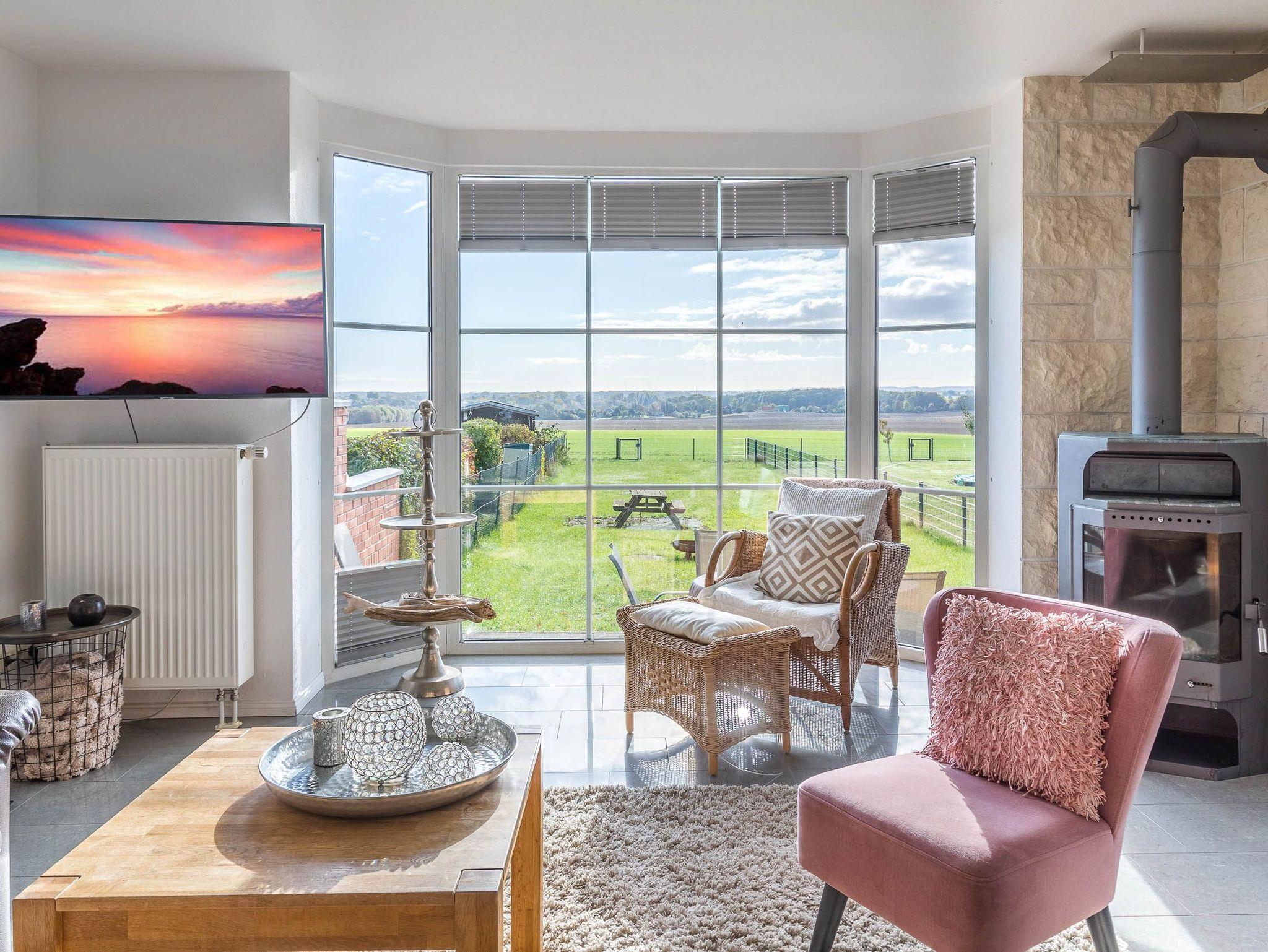 Ein großzügiger Wohn- und Essbereich befindet sich im Erdgeschoss und ist Mittelpunkt des Hauses. Das Panoramafenster mit Blick auf die Mecklenburgische Landschaft und die Boltenhagener Wiek ist eines von vielen Highlights. Ein Esstisch mit passenden Stühlen bietet ausreichend Platz für die Familie. Hier können alles sitzen, essen spielen und schnacken. Für die Multimediaunterhaltung sorgt der große TV mit Satelliten Fernsehen.