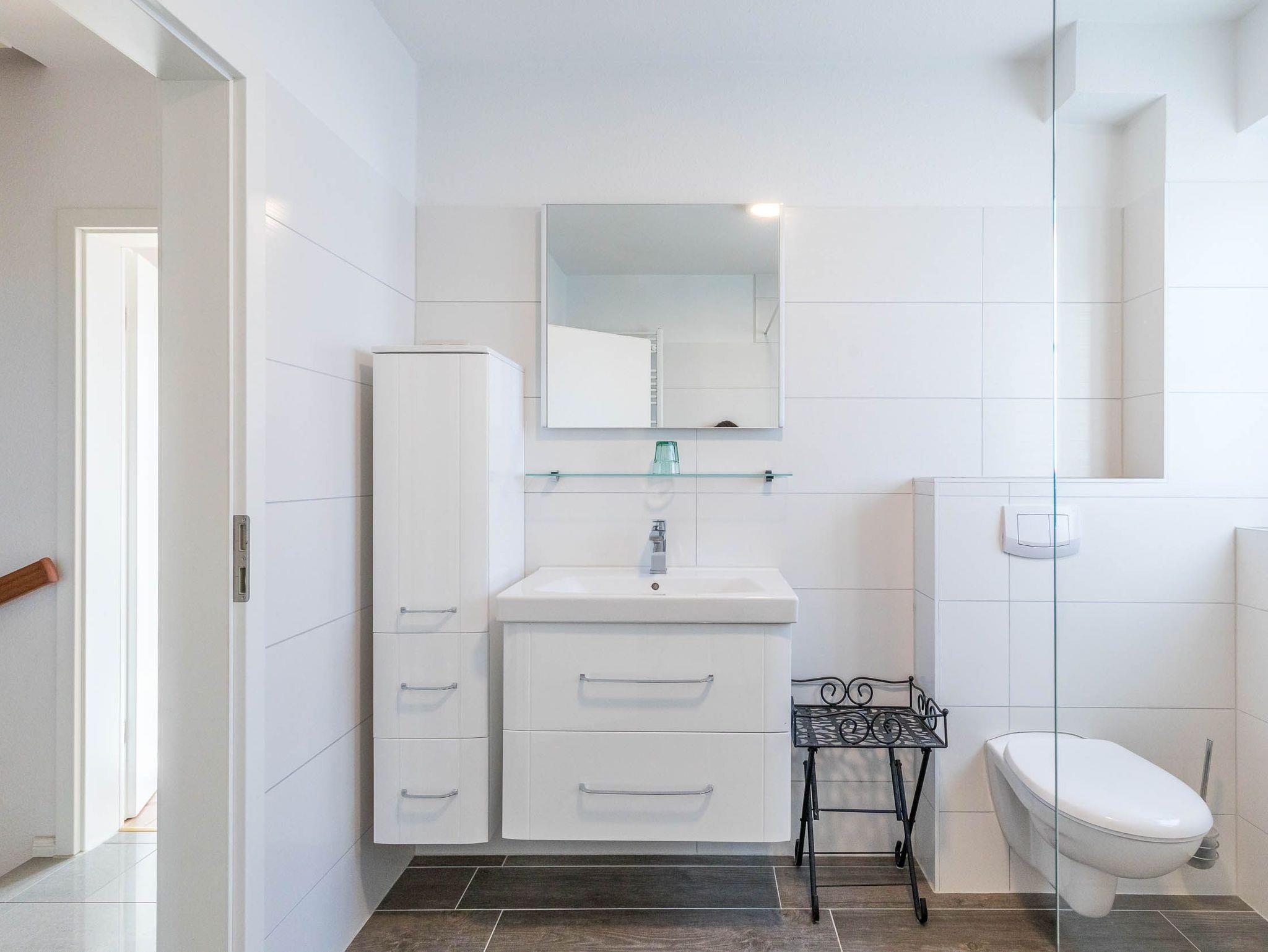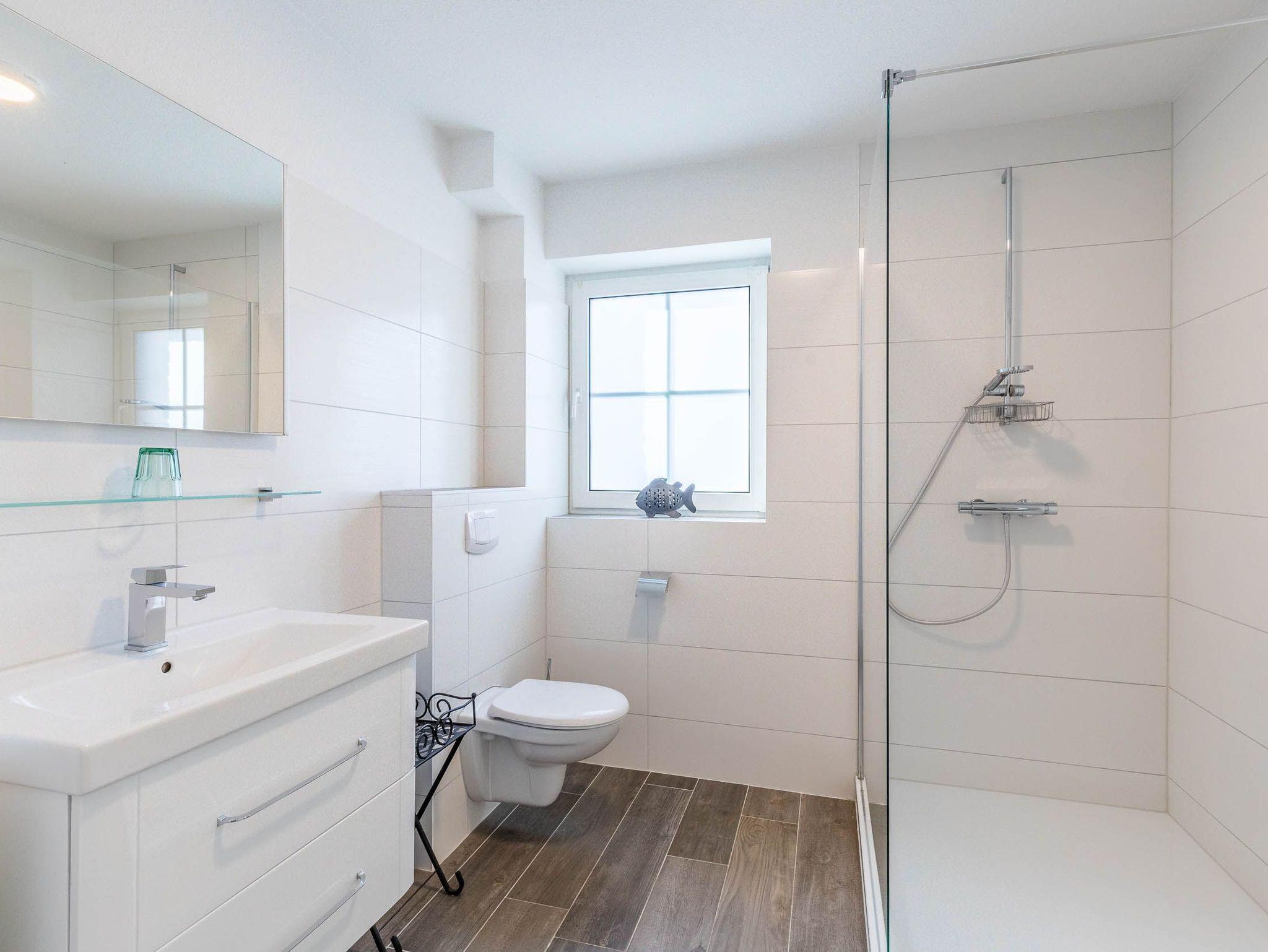 Das helle und moderne Badezimmer mit großer Dusche, Waschtisch und WC erwartet Sie im 1.Obergeschoss. Das Fenster spendet zusätzliches Tageslicht und erleichtert das Lüften nach dem Duschen.