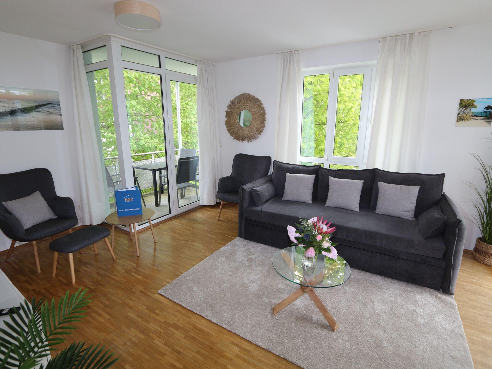 Helle und moderne Ferienwohnung in Boltenhagen mit zwei Balkonen und Meerblick, ideal für entspannte Tage nahe dem Strand.