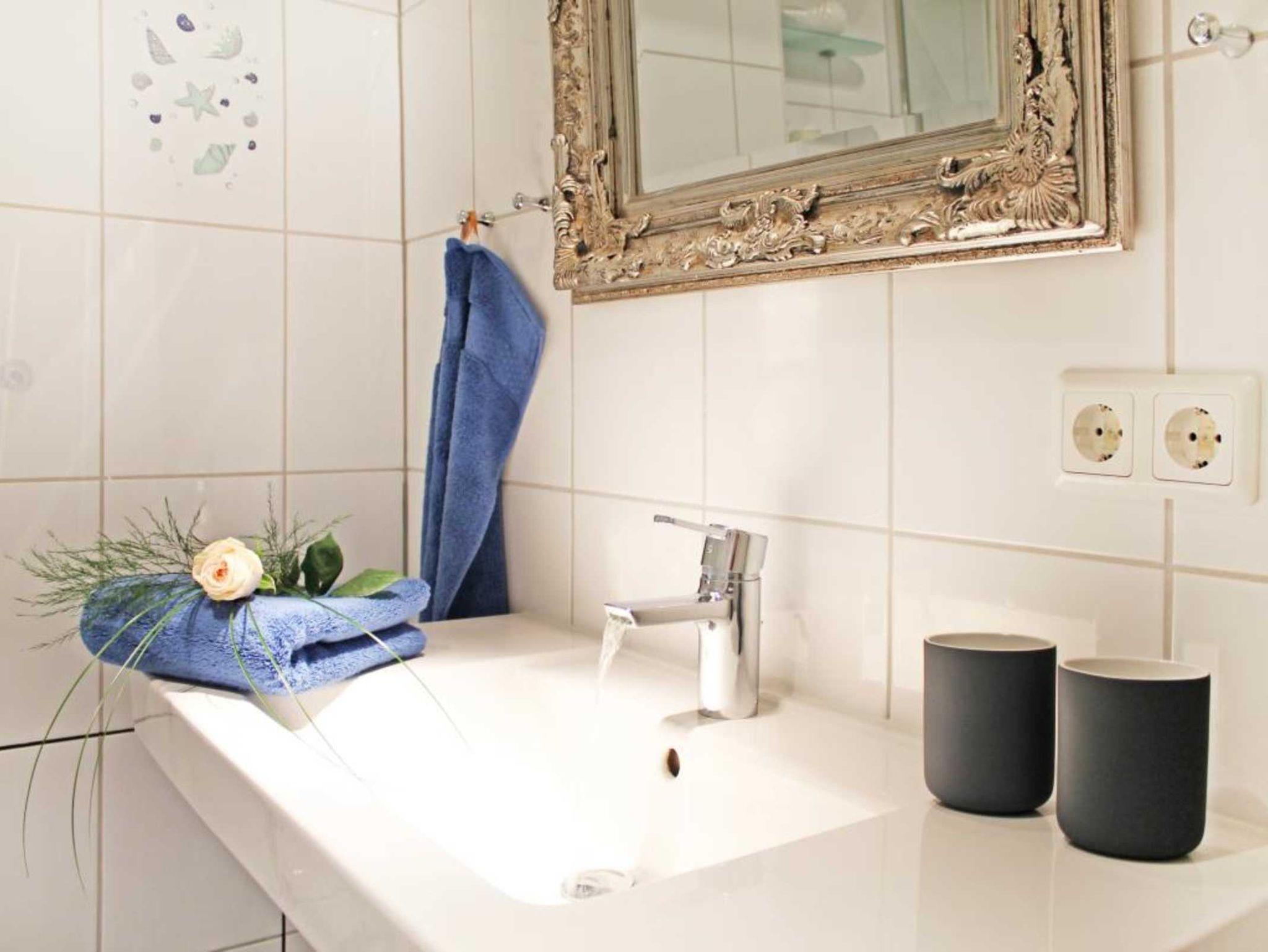 Zugehörig ist ein modernes Duschbad mit Waschtisch und WC. Im Haus kann eine Waschmaschine genutzt werden.