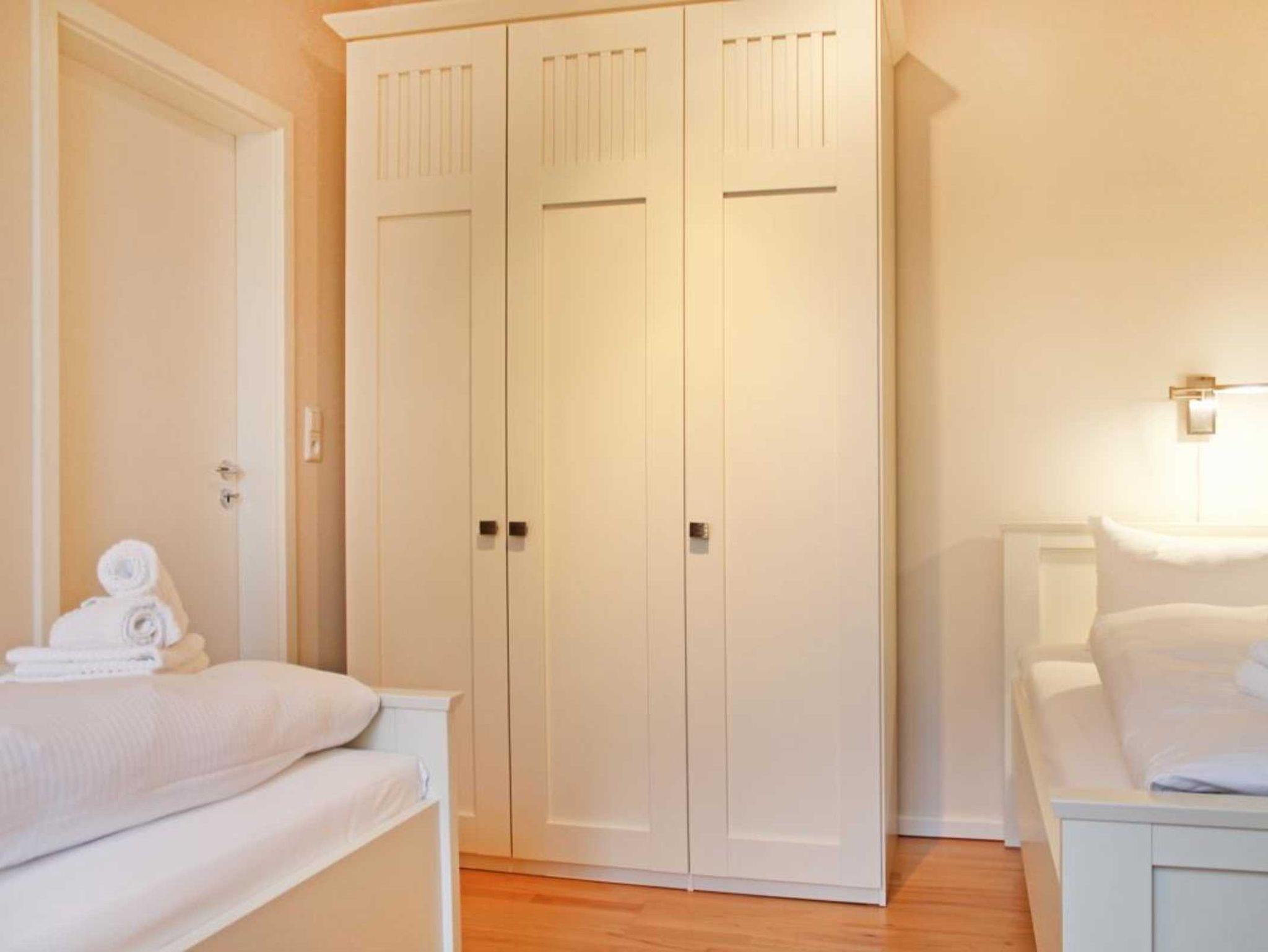 Erholsame Nächte ermöglichen zwei separate Schlafzimmer. Eines mit Doppelbett und Kleiderschrank. Das weitere Schlafzimmer mit zwei Einzelbetten, Kleiderschrank und Fernseher.