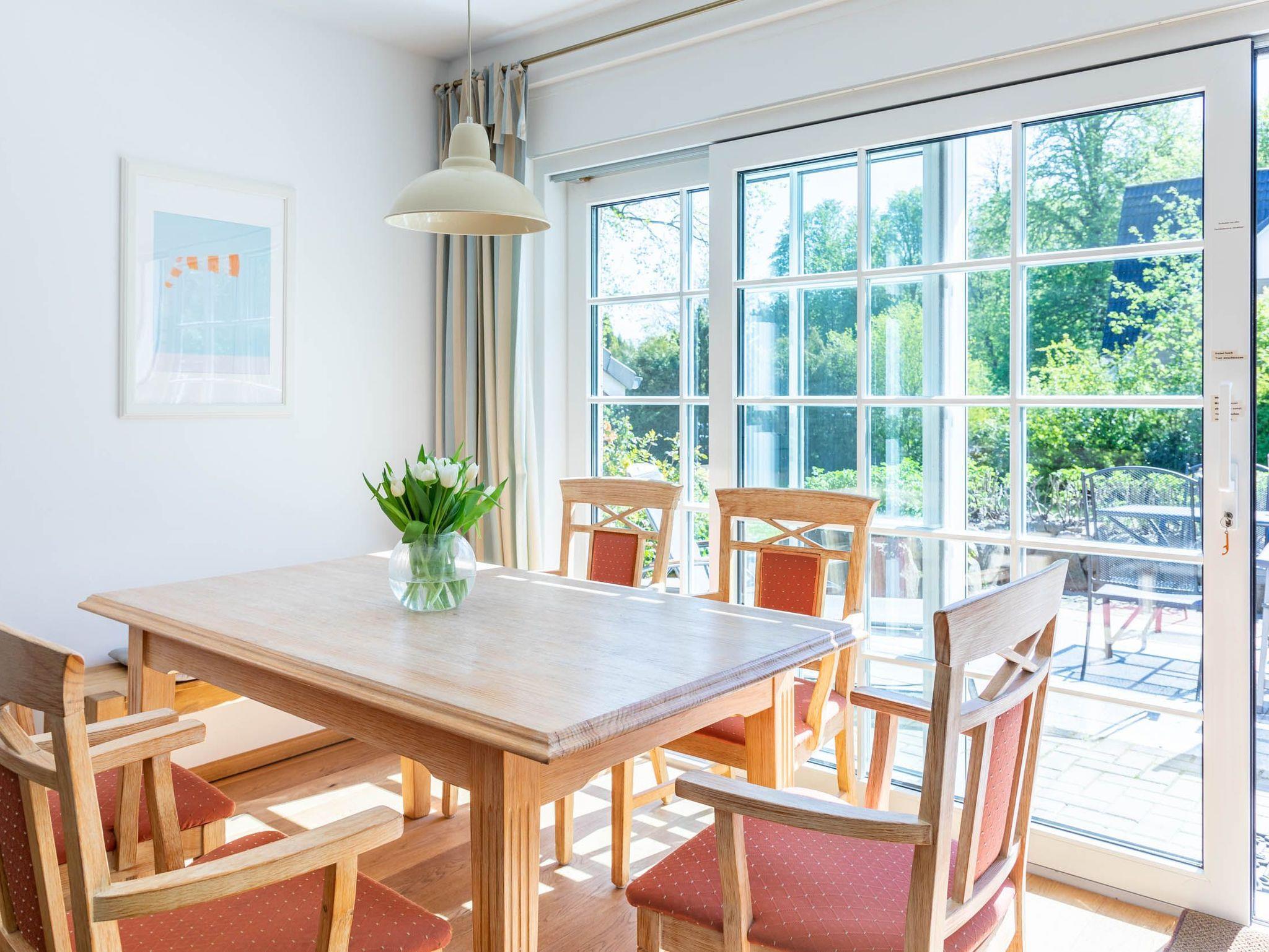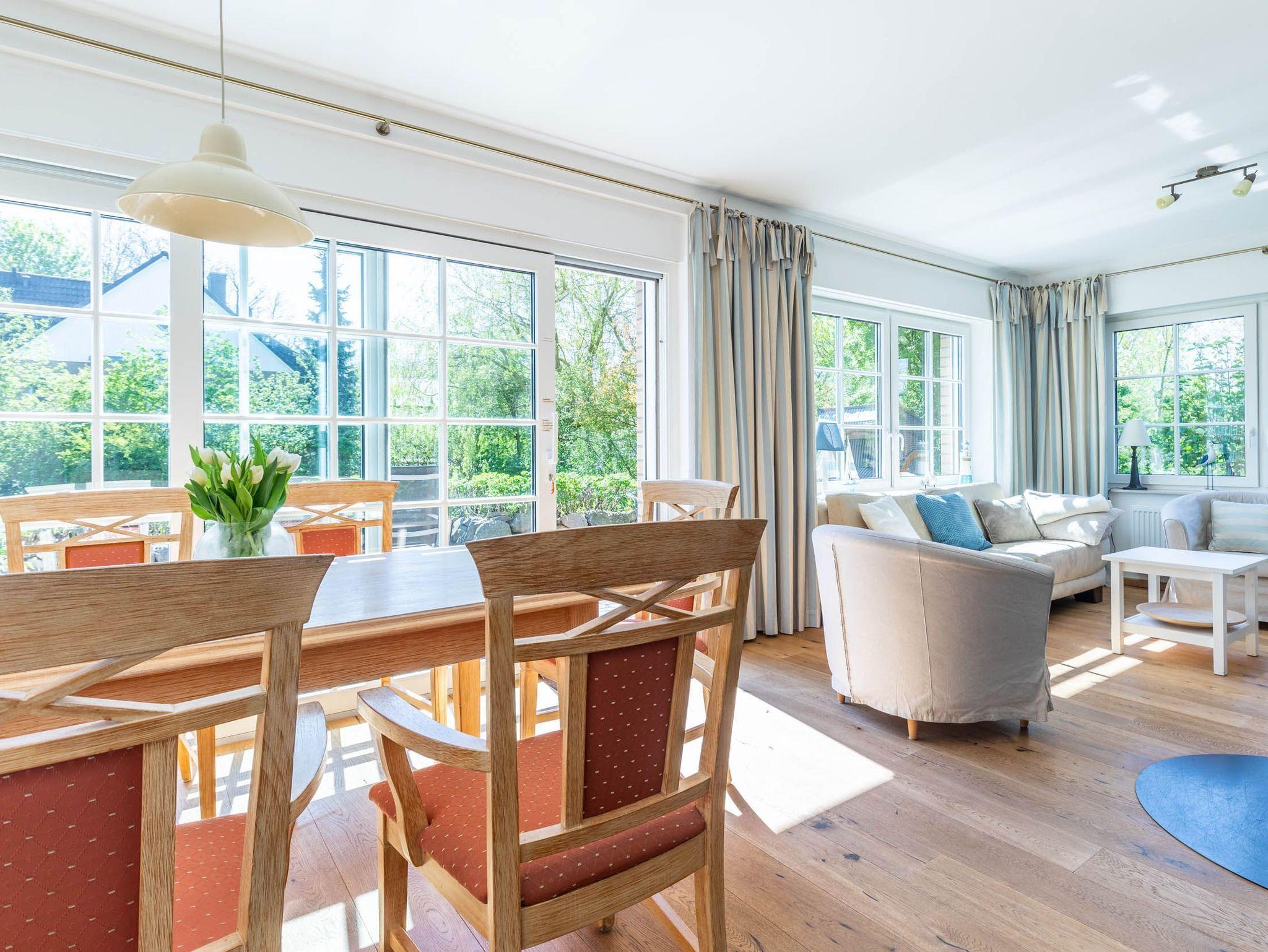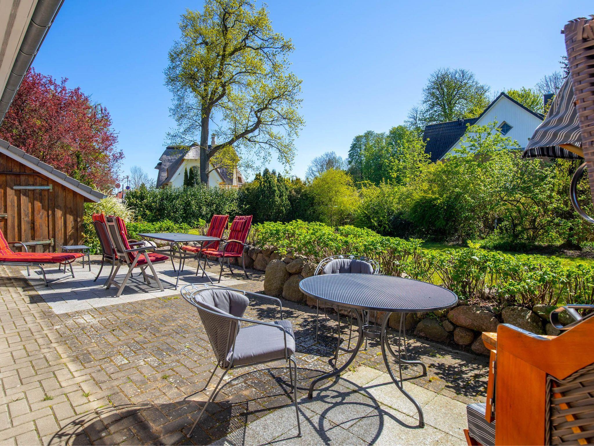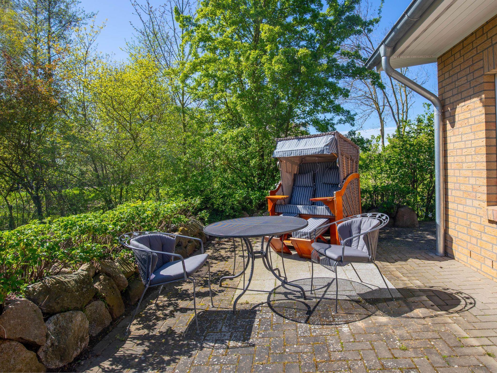 Durch die breite Terrassenschiebetür gelangen Sie direkt auf die großzügige Südost-Terrasse mit Gartenmöbeln und Strandkorb, hier kann man einfach mal einen Moment der Ruhe genießen.