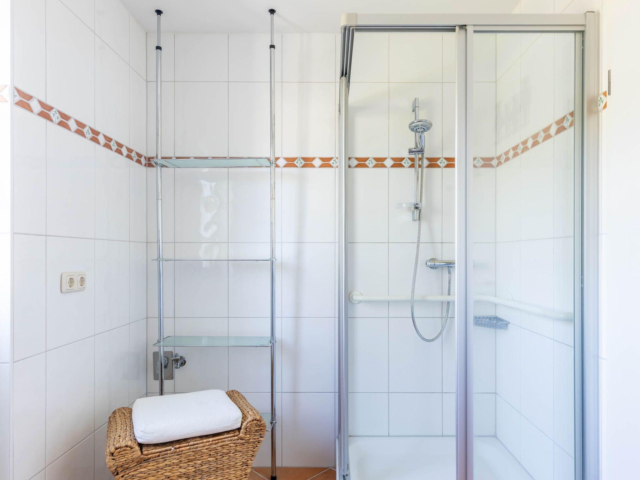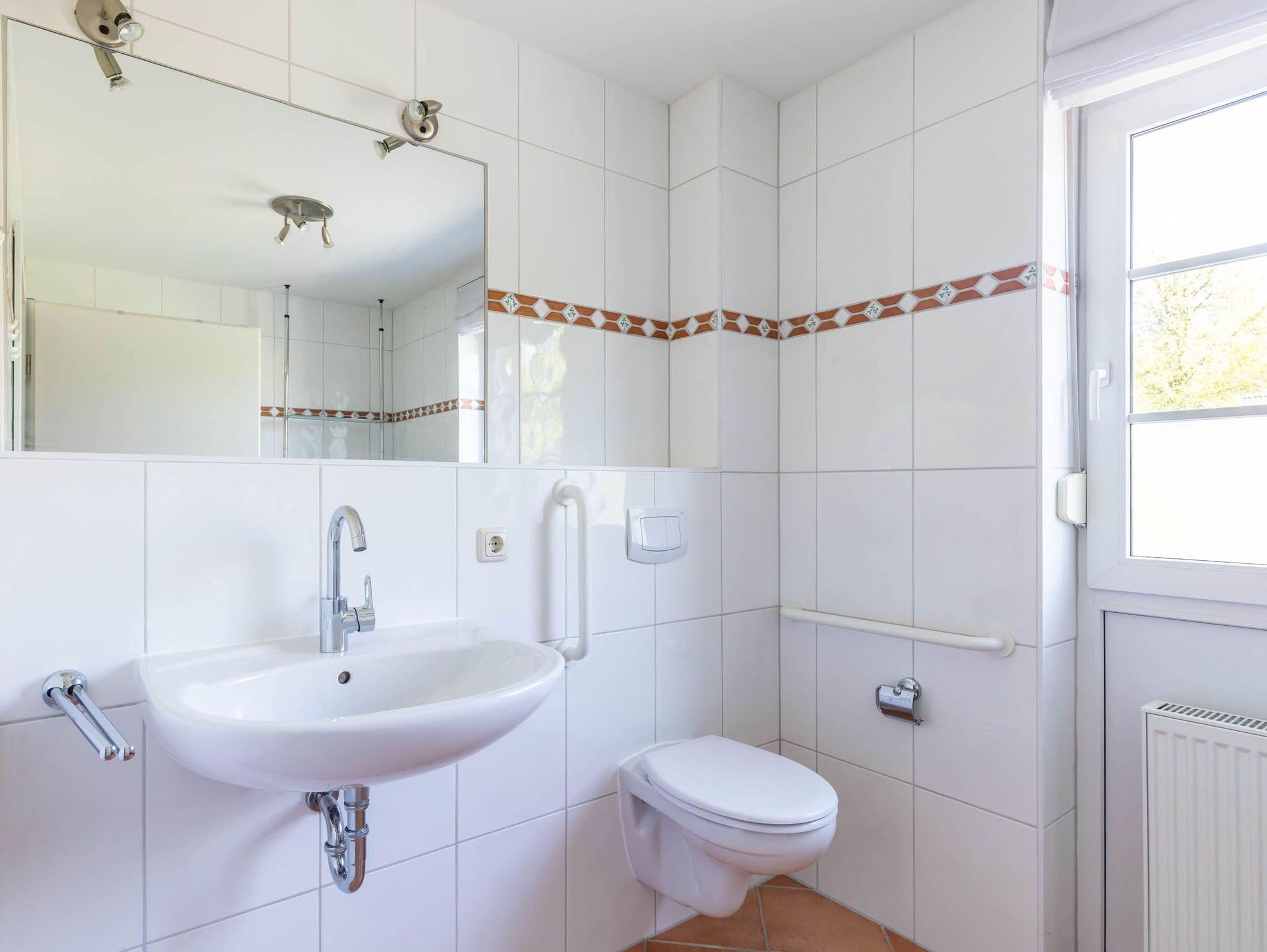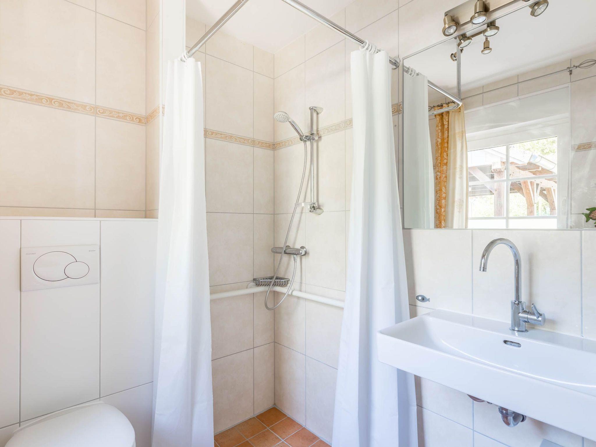 Auf dieser Etage befindet sich das zweite, etwas größere Badezimmer, welches ebenfalls mit Dusche und WC ausgestattet ist. Ebenso wie im Erdgeschoss gibt es auch in diesem Bad ein Fenster.