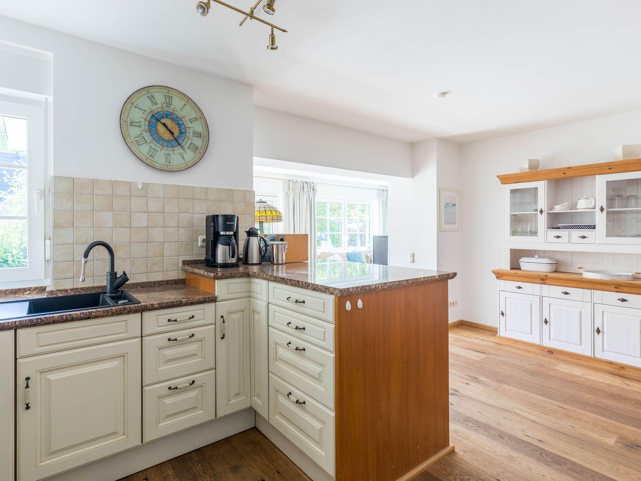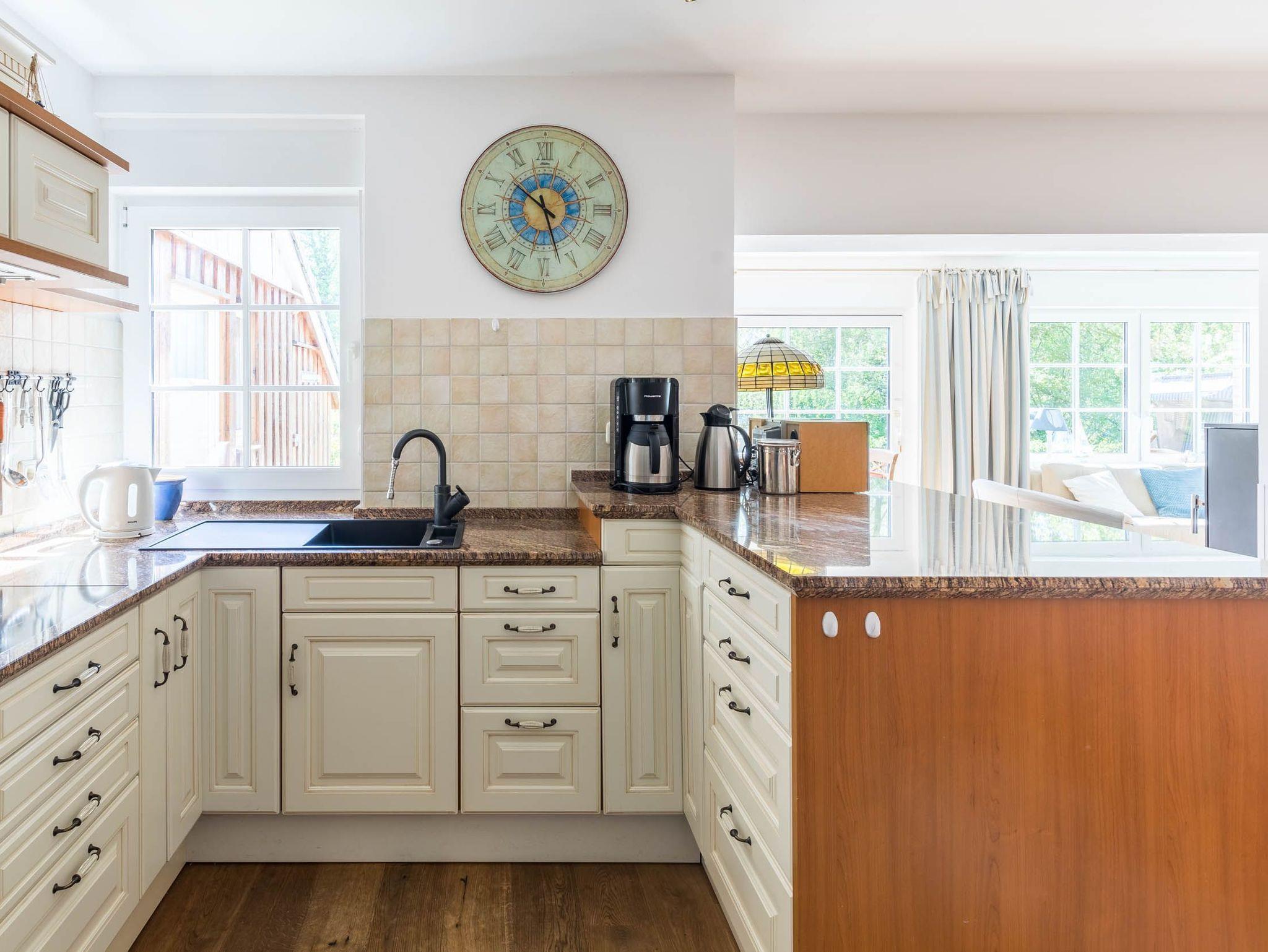 Durch die Küchenzeile mit gehobenem Standard ist das Haus für die Selbstversorgung bestens geeignet. Dort findet man alle Küchengeräte. Neben einem Kühlschrank inklusive Gefrierfach ist ein Herd mit Backofen, eine praktische Spülmaschine, eine Mikrowelle, ein Toaster, ein Wasser- und Eierkocher sowie eine Kaffeemaschine und ein Mixer vorhanden.