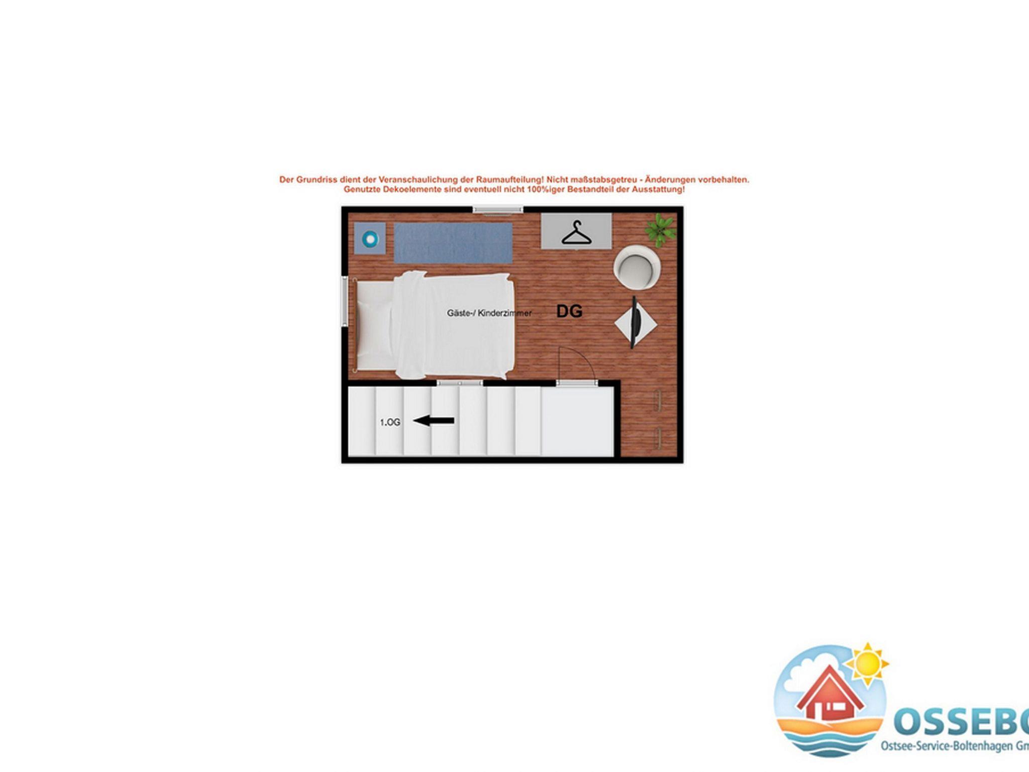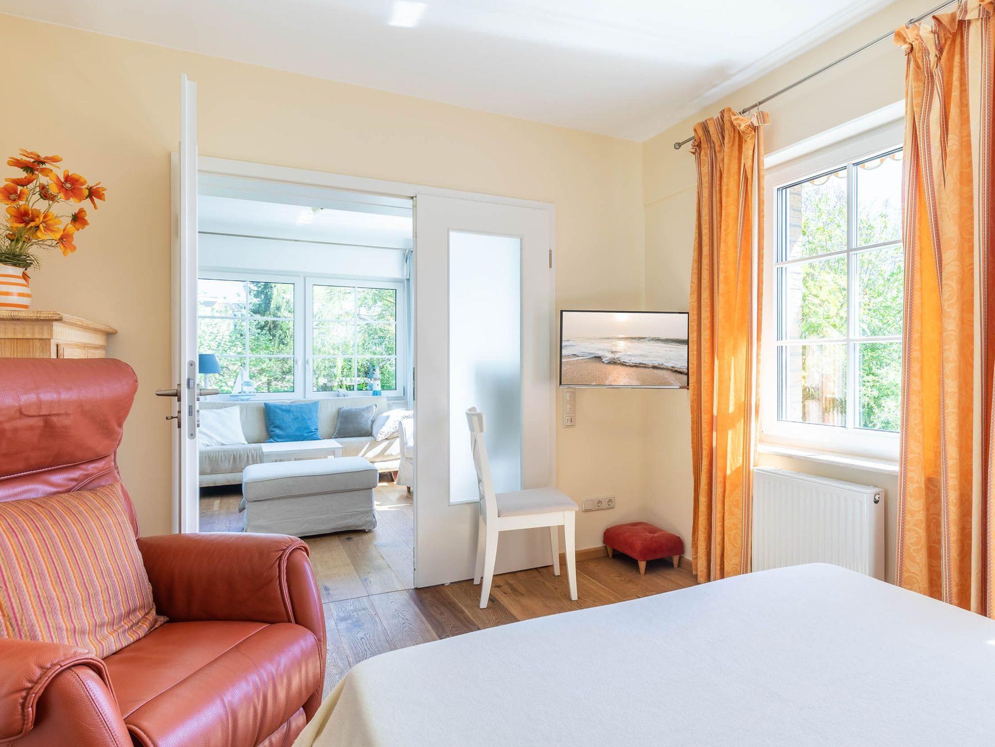 Durch die ideale Raumaufteilung im Erdgeschoss hat neben dem Wohn- und Essbereich auch ein Schlafraum mit einem französischen Doppelbett (140x200cm), SAT-TV, Kleiderschrank und Kommode einen Platz gefunden.