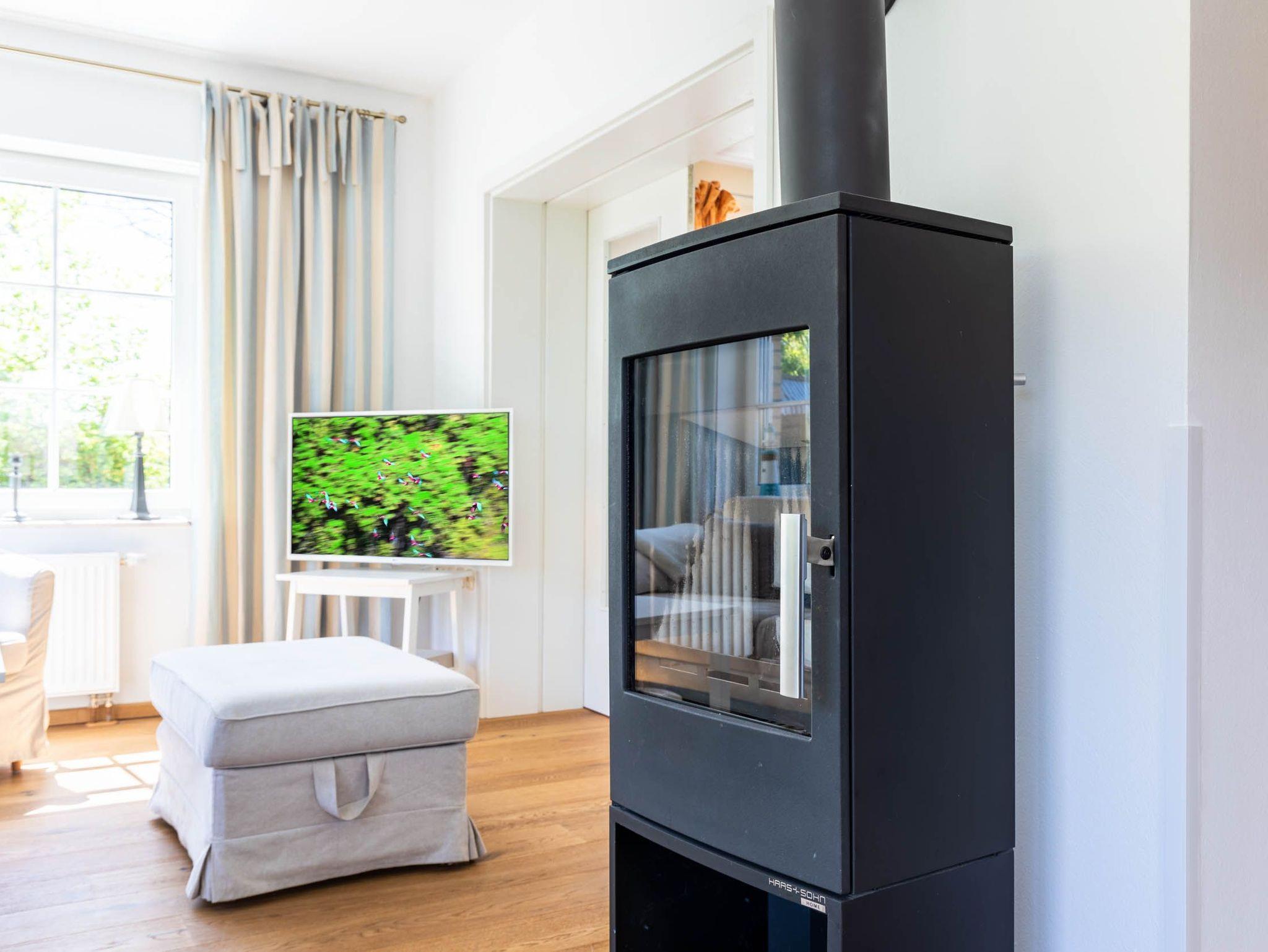 Im Erdgeschoss befindet sich das Wohnzimmer mit einem angebundenen Küchen- und Essbereich. Der lichtdurchflutete Wohnraum lädt mit einer gemütlichen Sofaecke und passenden Sesseln zum Verweilen ein. Für zusätzliche Wohlfühlatmosphäre sorgt ein Kamin, der neben wohliger Wärme eine romantische Stimmung zaubert. Wer Unterhaltung wünscht, dem steht ein SAT-TV zur Verfügung. Am geräumigen Esstisch zum Ausziehen können alle Gäste Platz nehmen und gemeinsam essen.