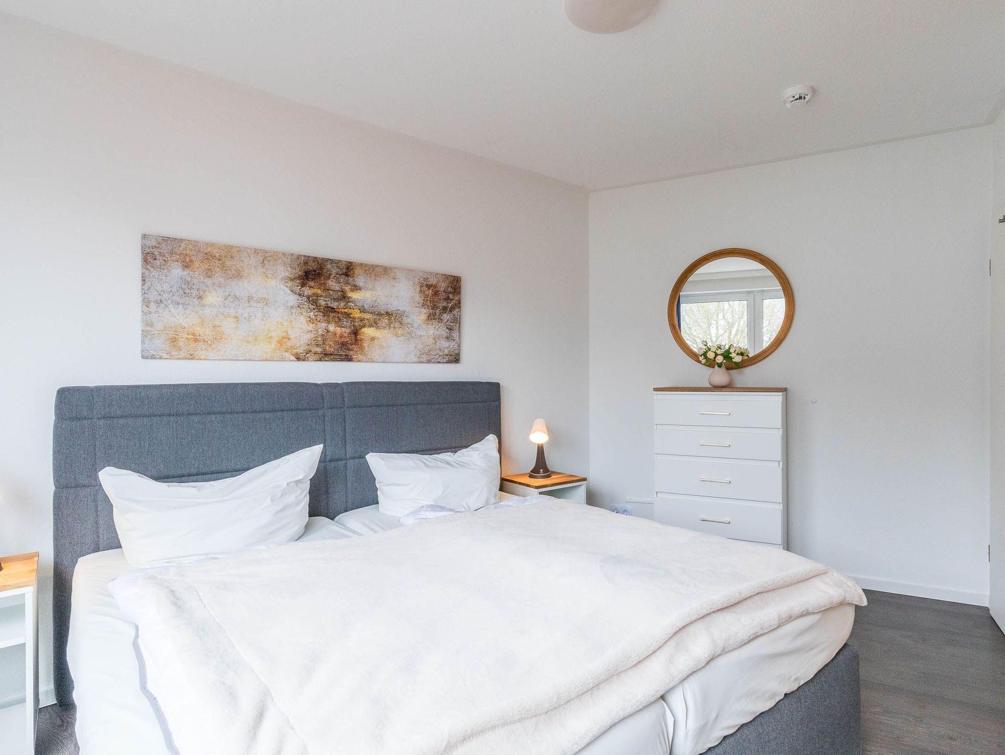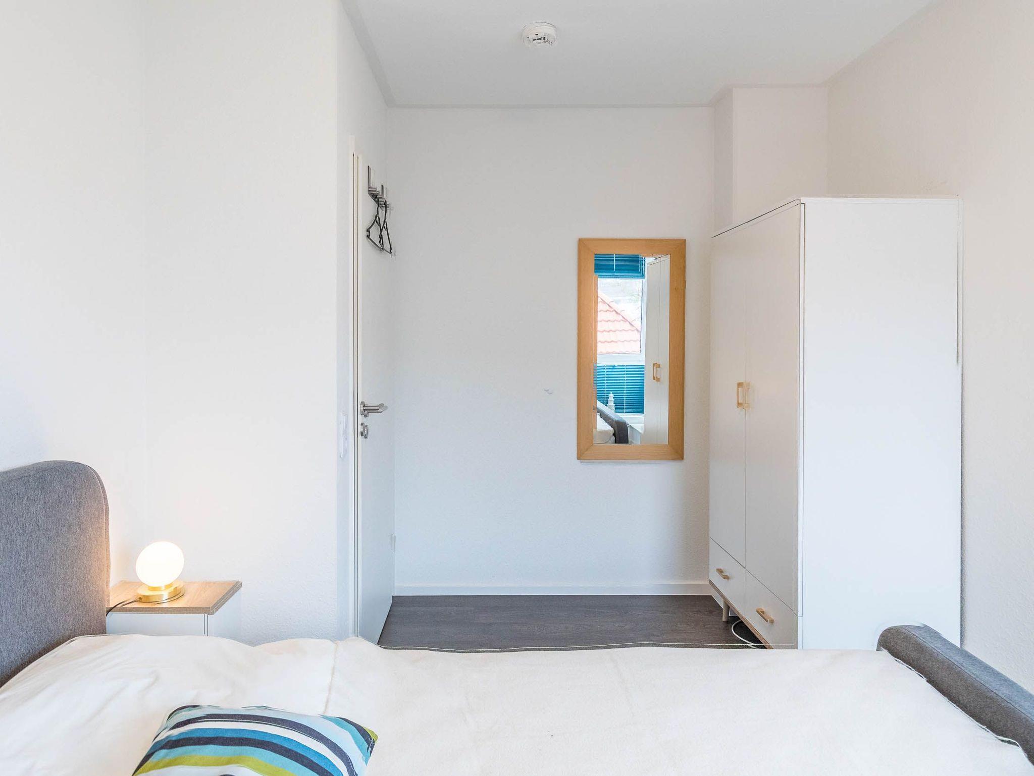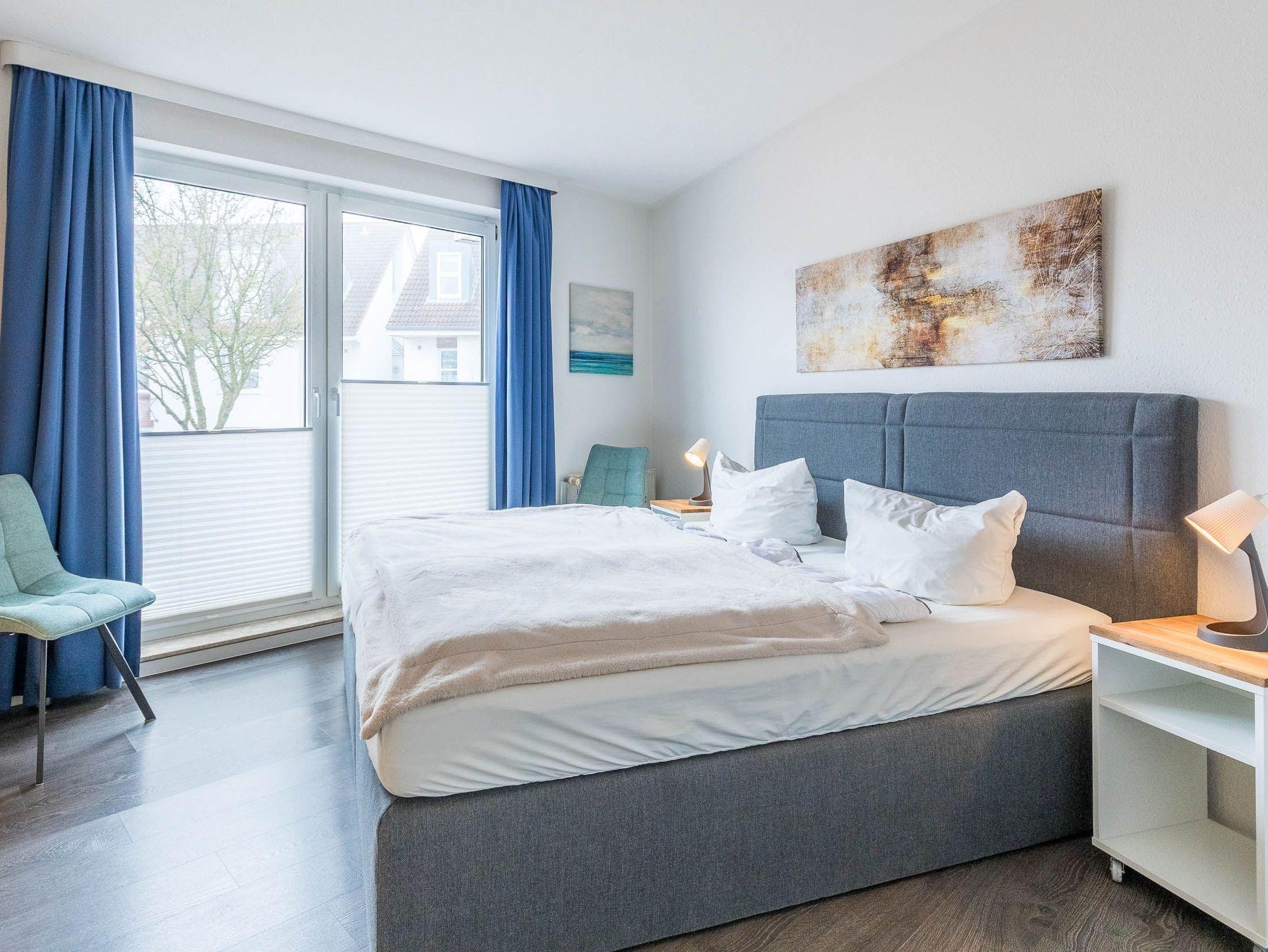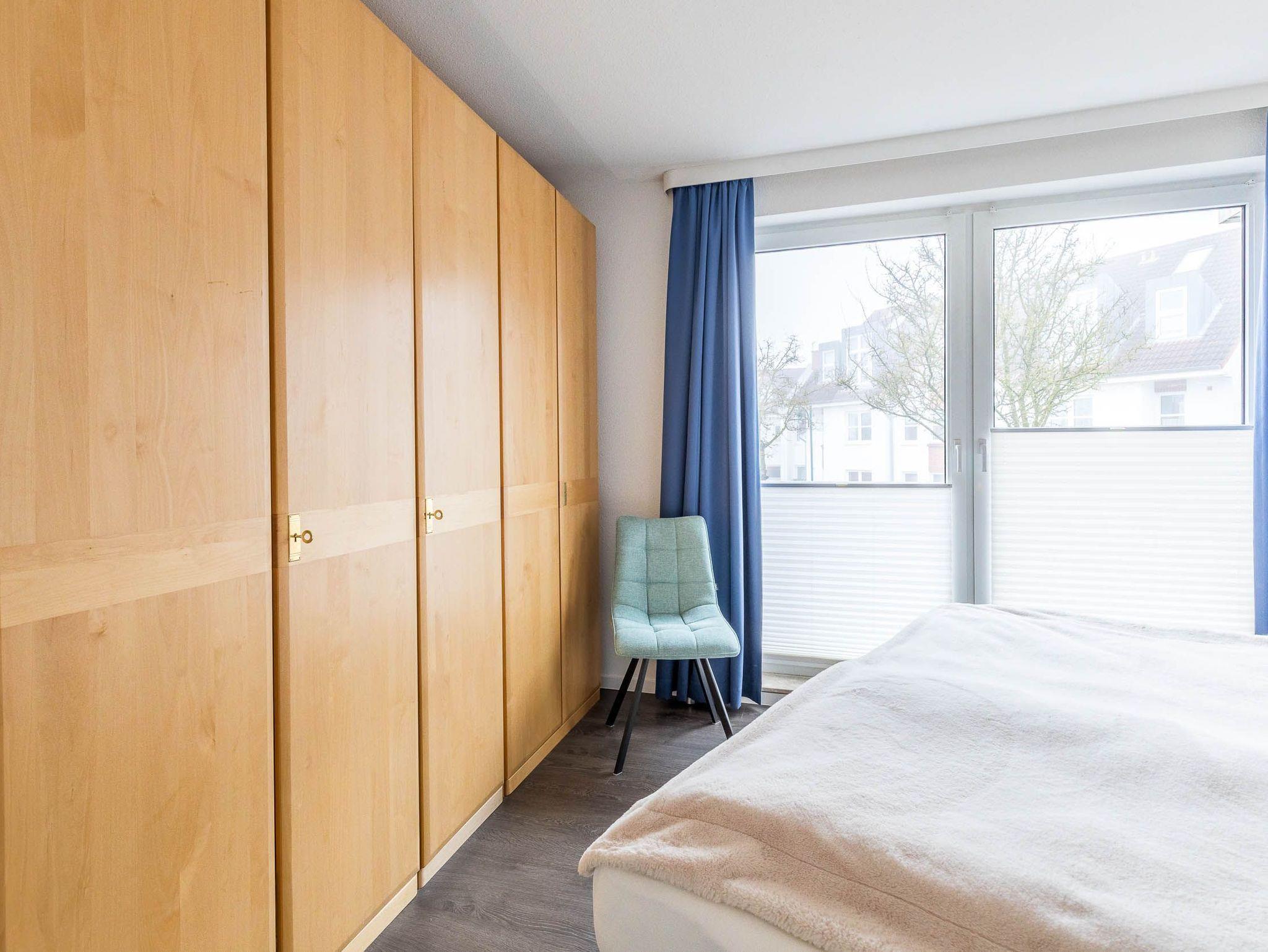 Hier befinden sich zwei weitere Schlafzimmer. Das größere Schlafzimmer ist mit einem Doppelbett (180x200), einem Kleiderschrank und einer Kommode ausgestattet. Von hier aus haben Sie Zugang zum sonnigen, möblierten Balkon. Im zweiten Schlafzimmer befindet sich ein Doppelbett (180x200) und ein Kleiderschrank.