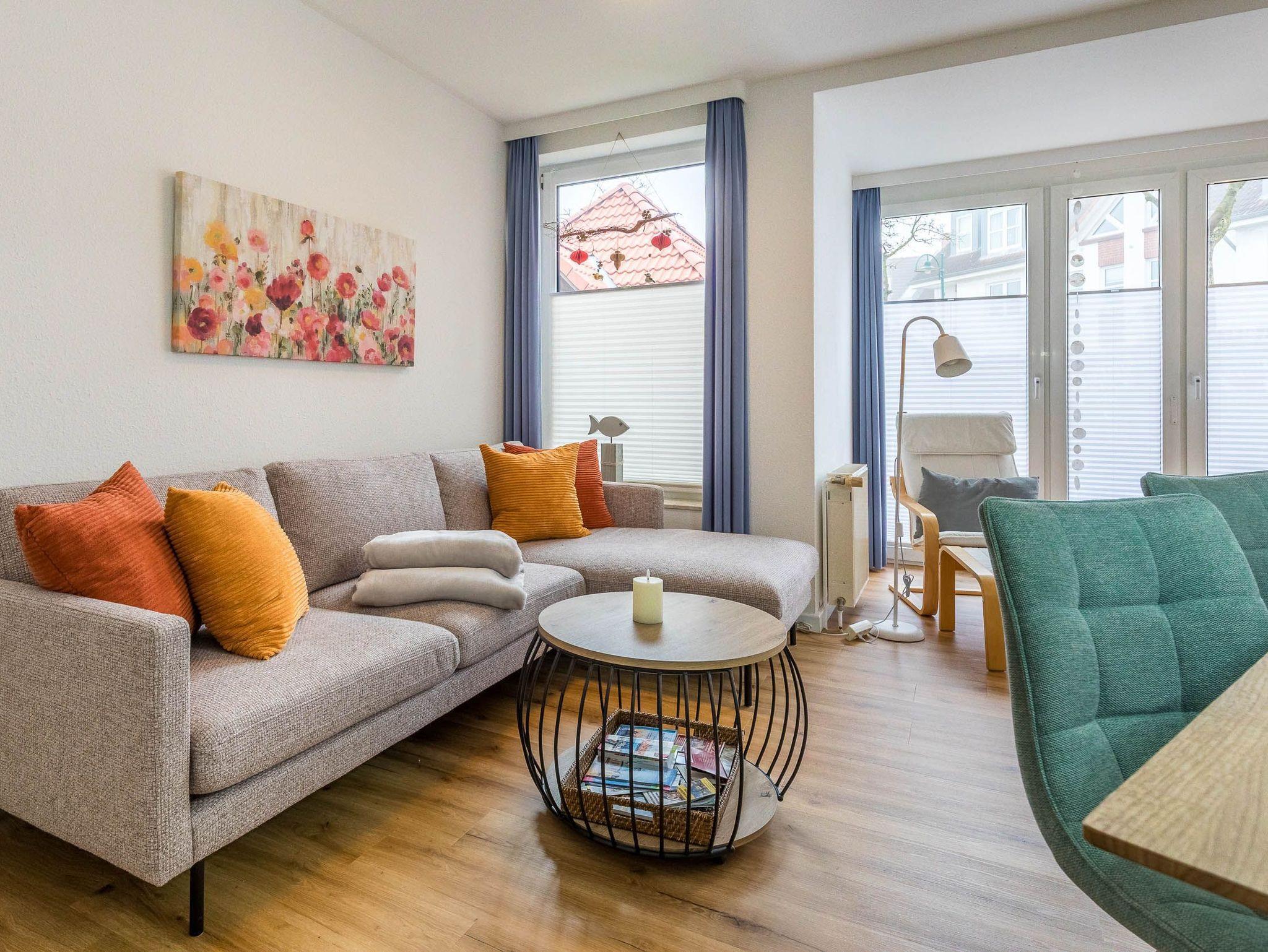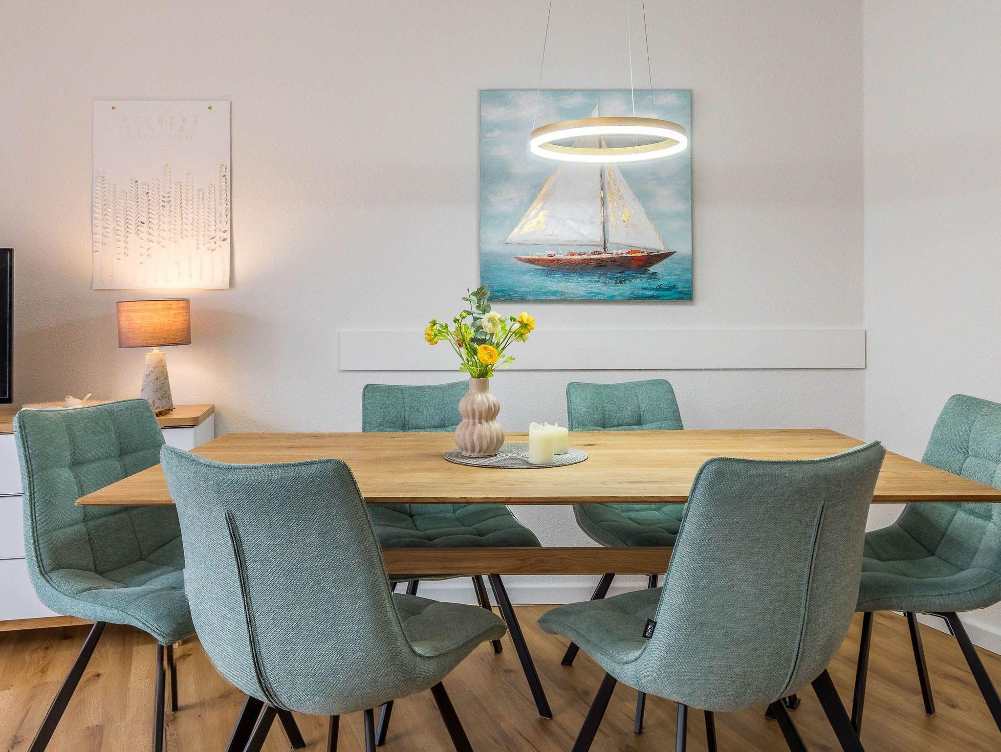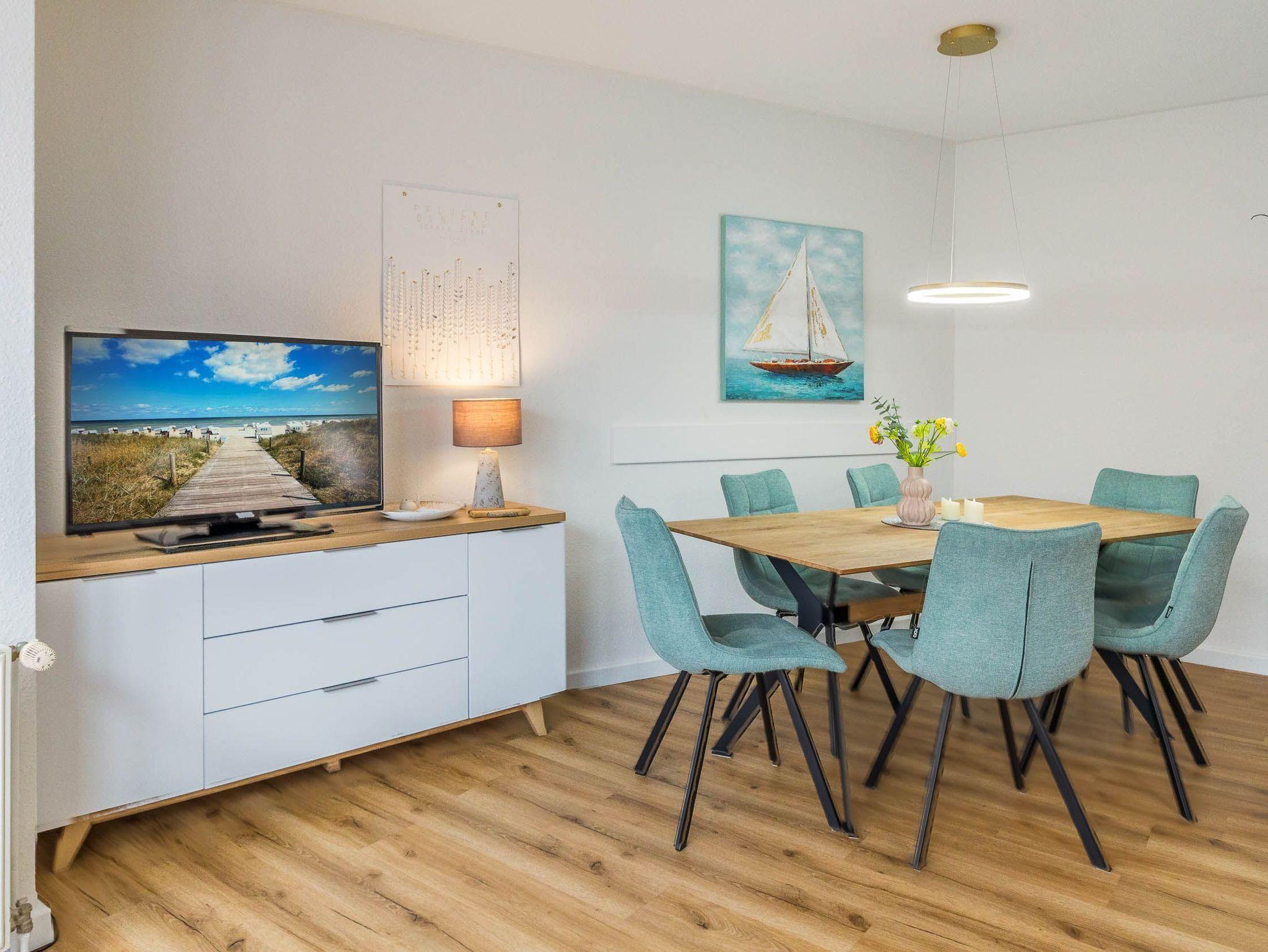 Im Erdgeschoss verfügt das Ferienhaus über einen lichtdurchfluteten Wohn- und Essbereich mit direktem Zugang zur geschützten, möblierten Terrasse mit privatem Gartenanteil. Im Wohnzimmer können Sie gemütlich auf der Couch oder dem Relaxsessel verweilen. Zur Unterhaltung steht Ihnen ein Smart-TV zur Verfügung. Sie können sich mit Ihrem Account anmelden für Netflix, Amazon Prime, Disney+ u.a. und ihr gewohntes Lieblingsprogramm geniesen. Das multimediale Angebot wird abgerundet durch einen DVD-Player. Es gibt auch eine umfangreiche Sammlung von DVDs für Kinder und Erwachsene sowie eine große Auswahl an Gesellschaftsspielen für alle Altersklassen zur Auswahl. Sie können auch auf eine Sammlung von Büchern und Romanen zurückgreifen. Am großen Esstisch finden alle Gäste Platz zum gemeinsamen Speisen, Spielen und Plaudern.