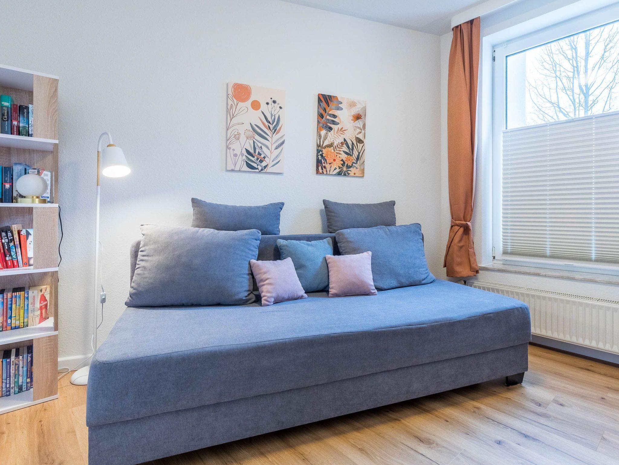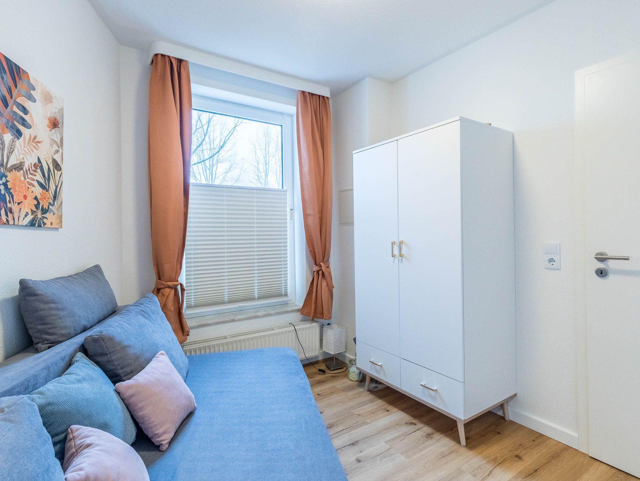 Weiterhin gibt es im Erdgeschoss ein Schlafzimmer mit einem Schlafsofa (160 x 200) und Kleiderschrank sowie ein Gäste WC.
