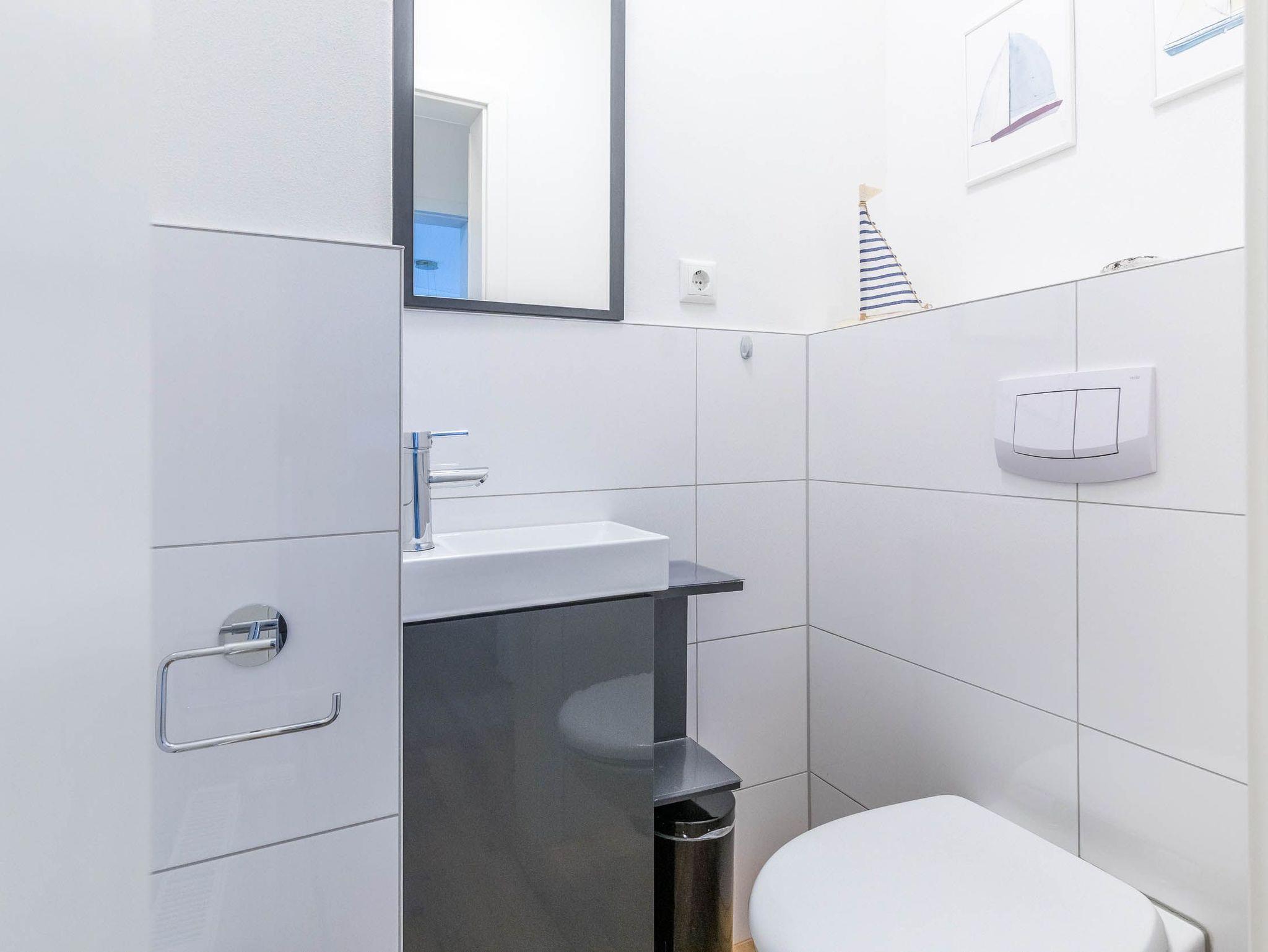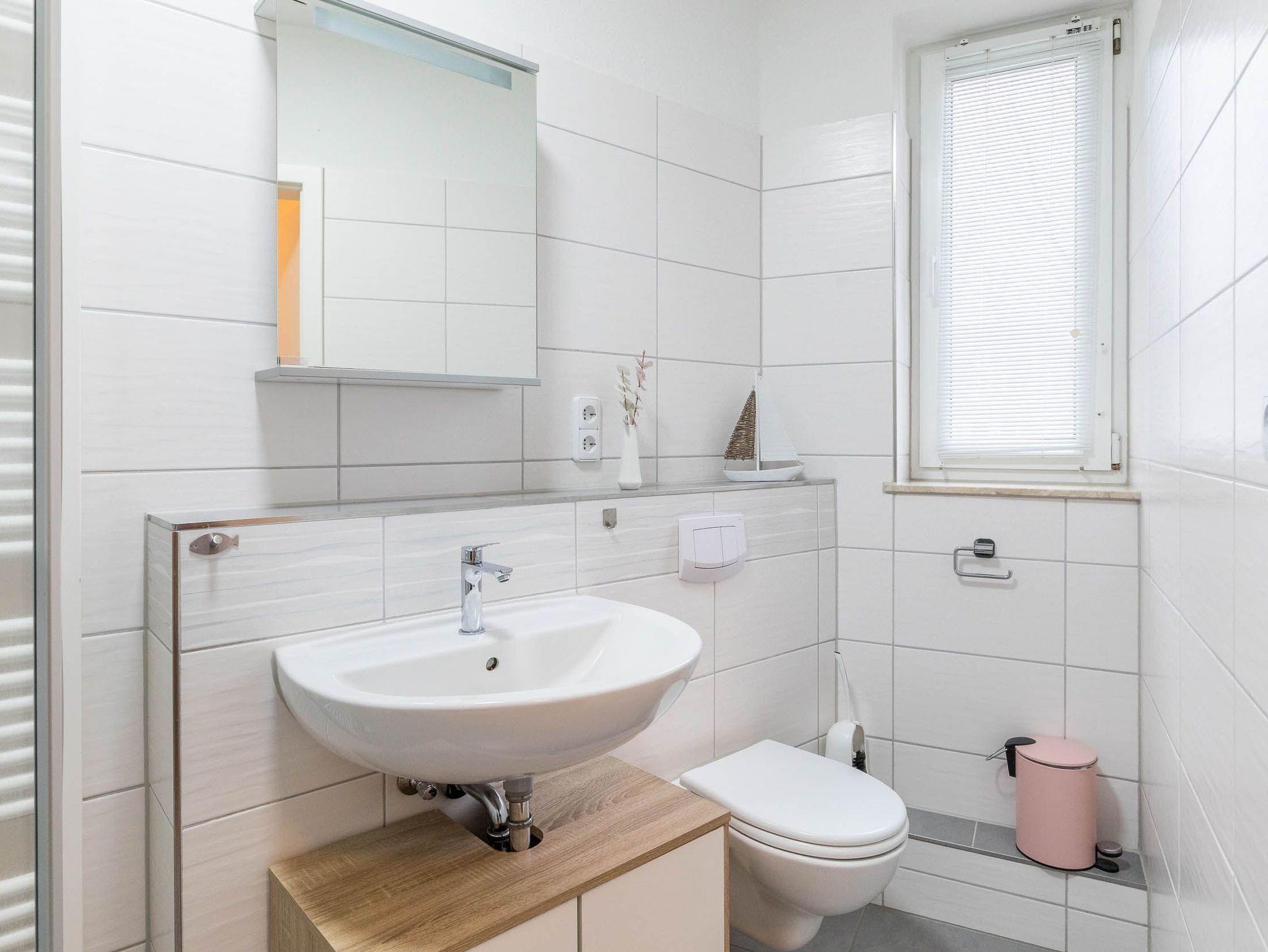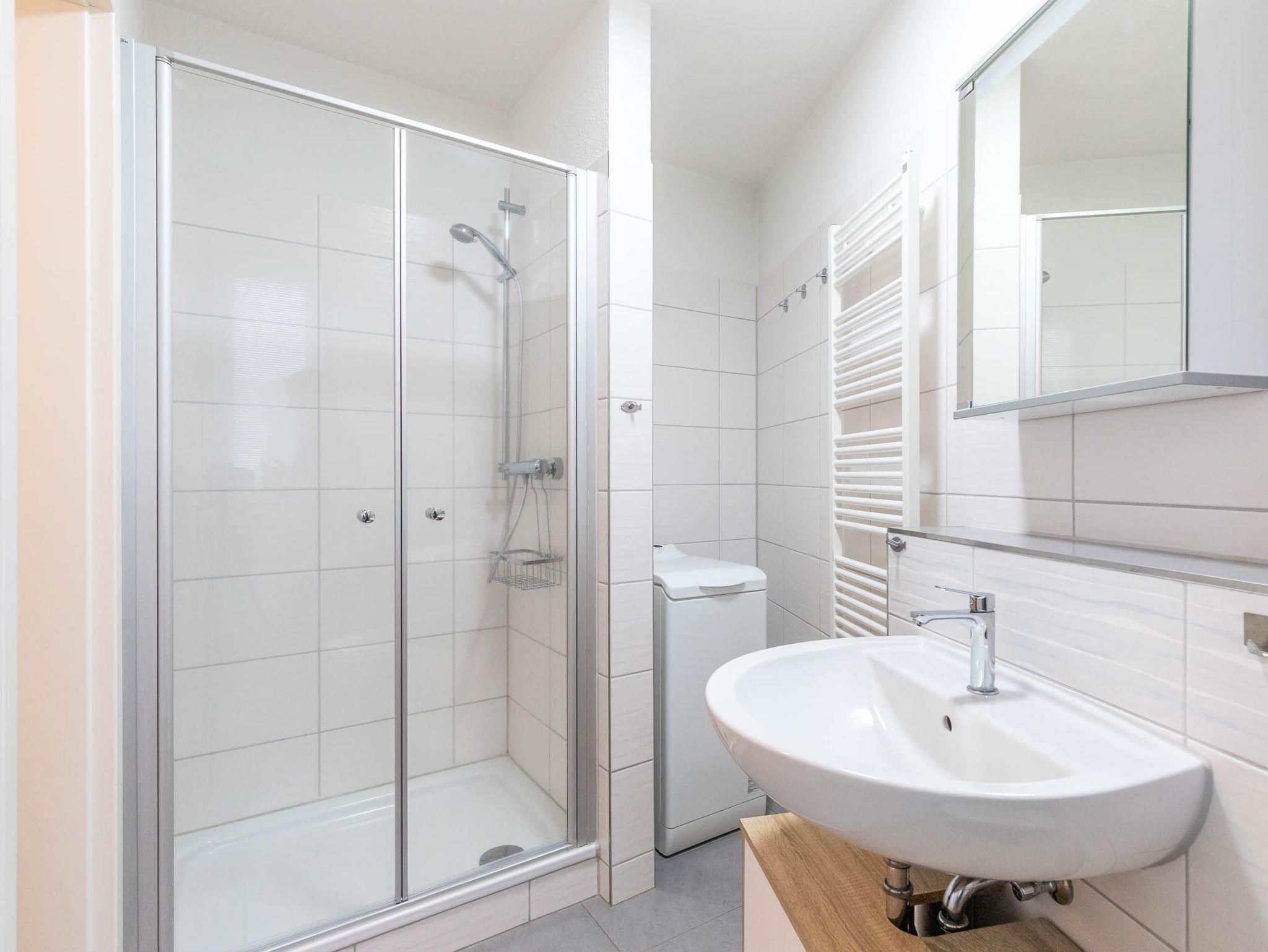 Das Badezimmer, welches sich ebenfalls im 1. Obergeschoss befindet, ist mit einer Dusche, WC und einer Waschmaschine ausgestattet. Ein Fön gehört ebenfalls zur Komplettausstattung. Das Fenster im Bad spendet viel Tageslicht und erleichtert das Lüften nach dem Duschen.