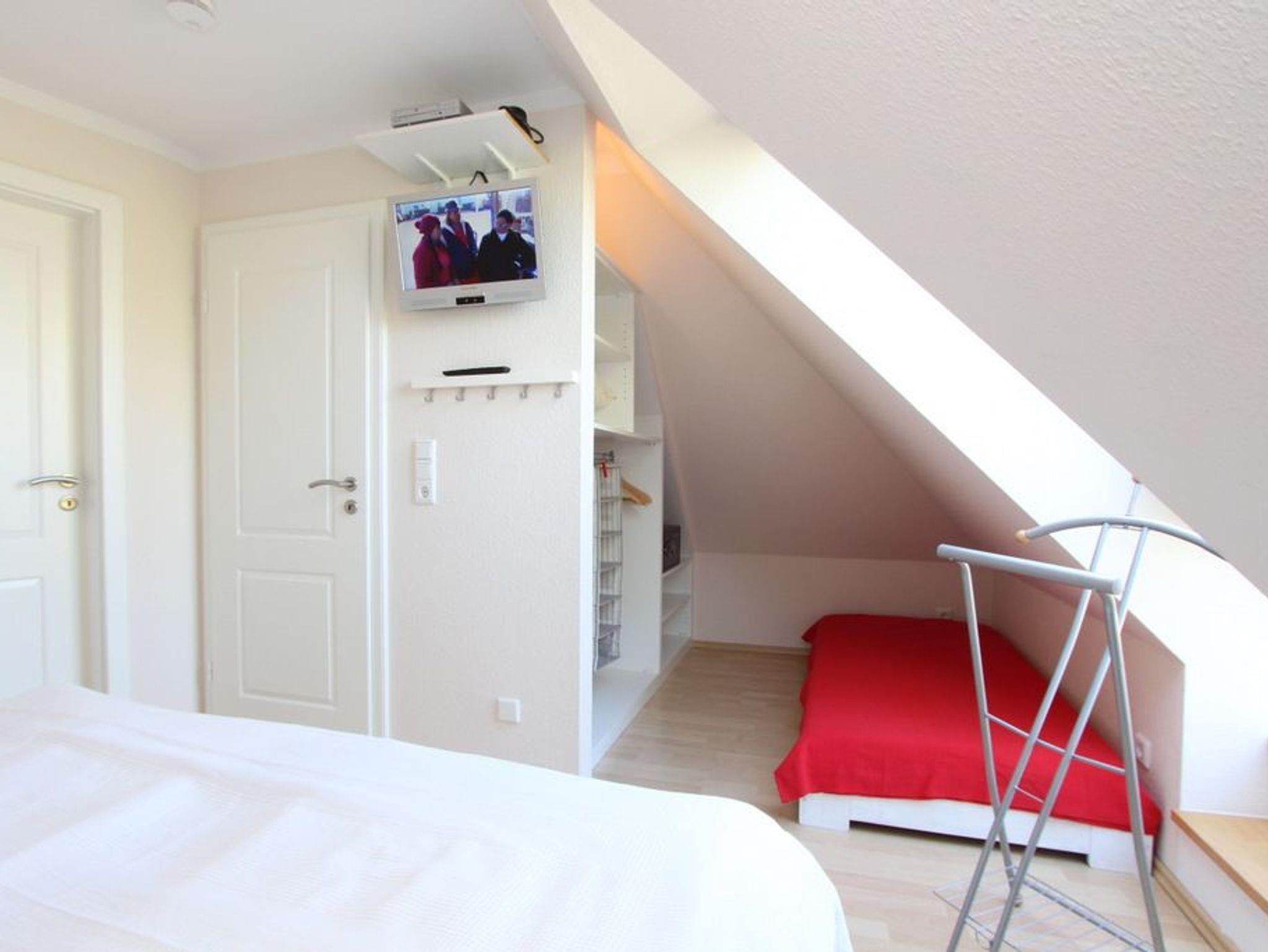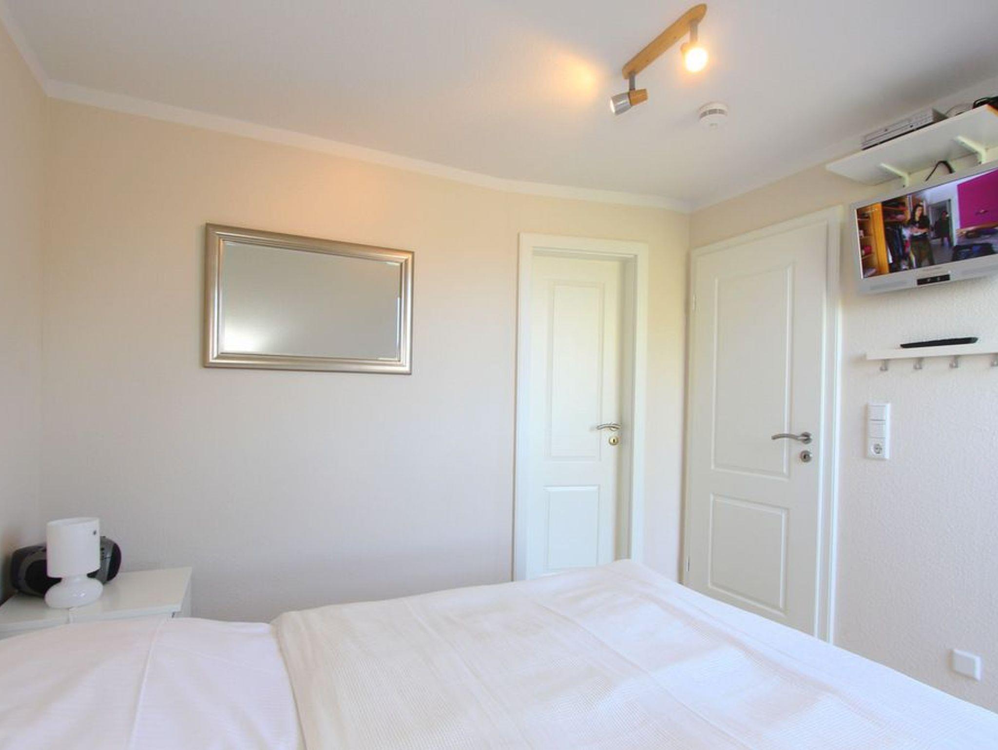 Auf dieser zweiten Wohnebene befindet sich das Schlafzimmer, welches mit einem Doppelbett sowie einem Einzelbett ausgestattet ist. Weiterhin sind diverse Ablagemöglichkeiten für Ihre Garderobe und ein weiterer TV vorhanden.