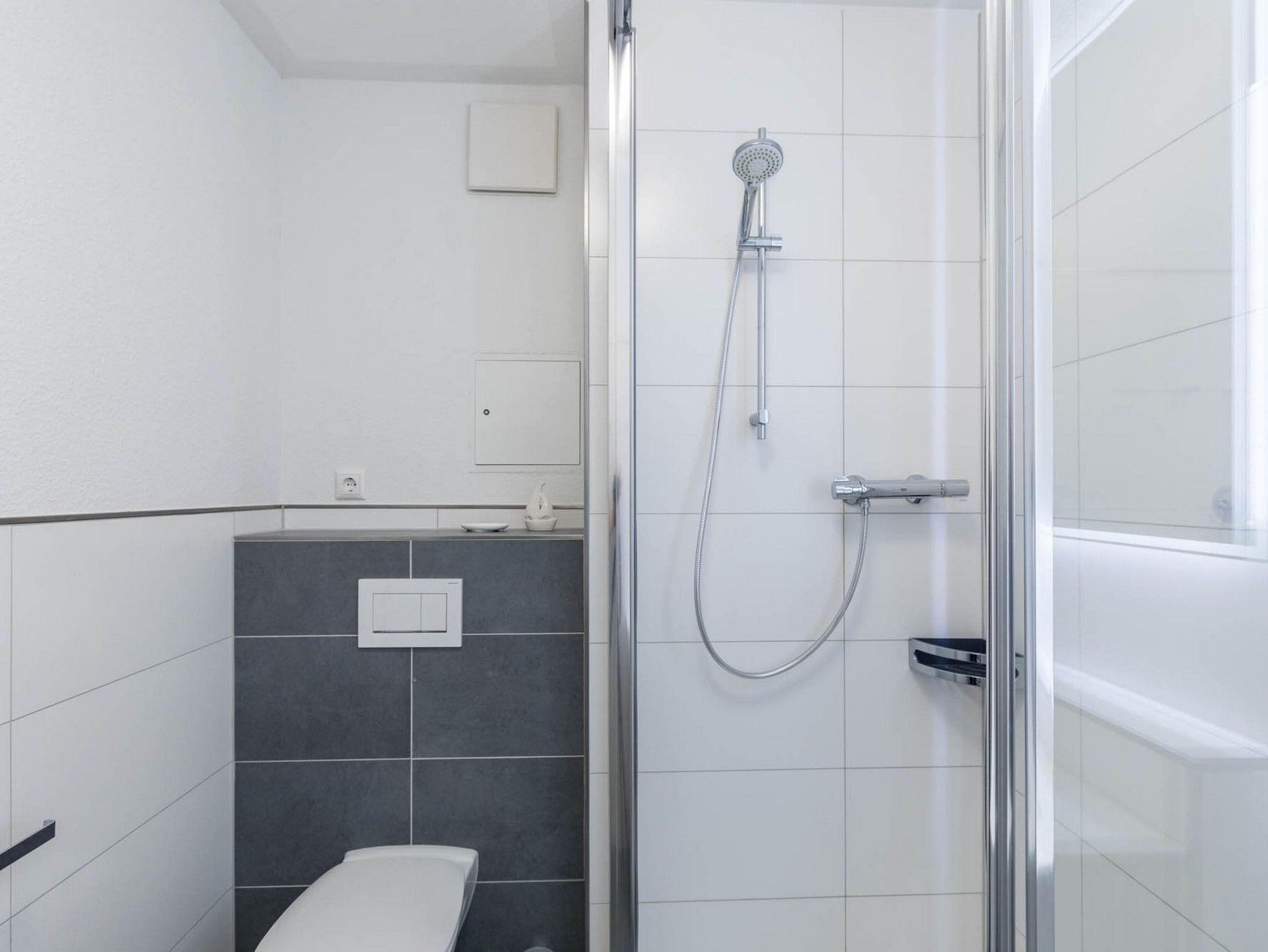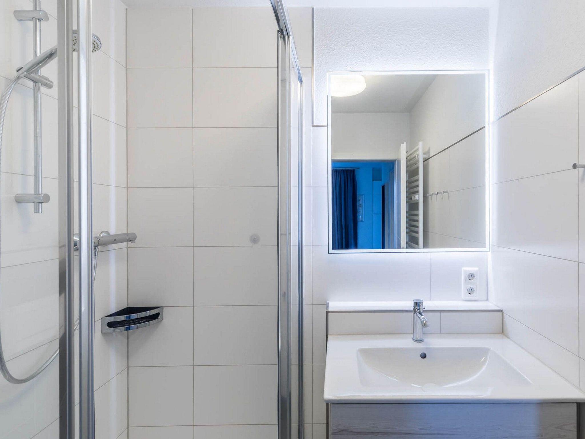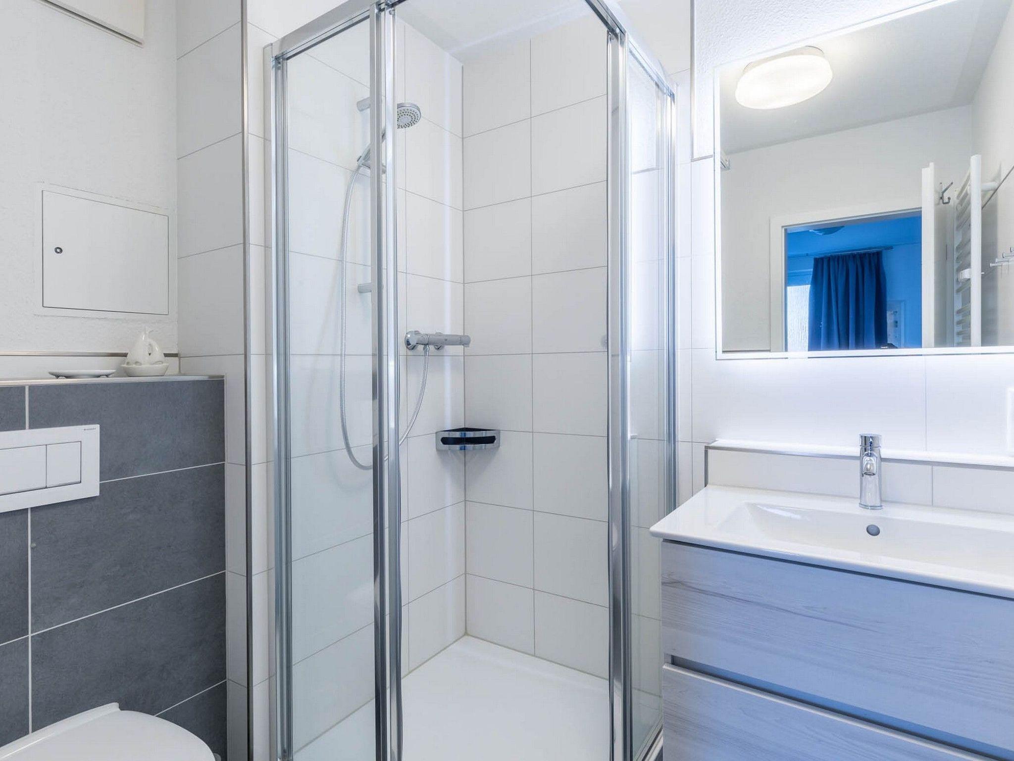 Im hell gefliesten Bad befinden sich eine Dusche, Waschbecken und WC.