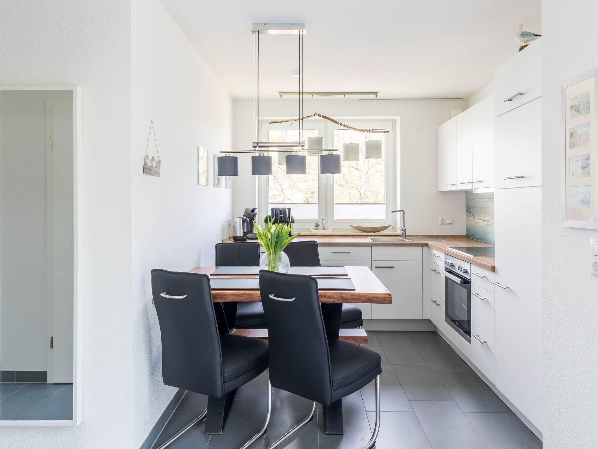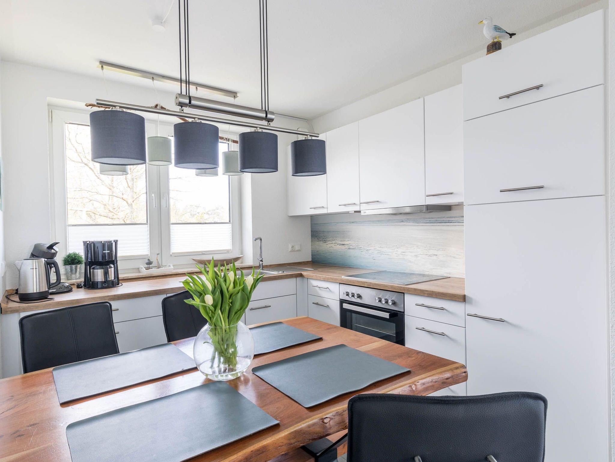 Die offene Einbauküche bietet eine Vollausstattung, so sind hier u.a. Herd, Backofen, Kühlschrank mit Gefrierfach, Geschirrspüler, Mikrowelle uvm. Ein passender Esstisch rundes das Paket ab.