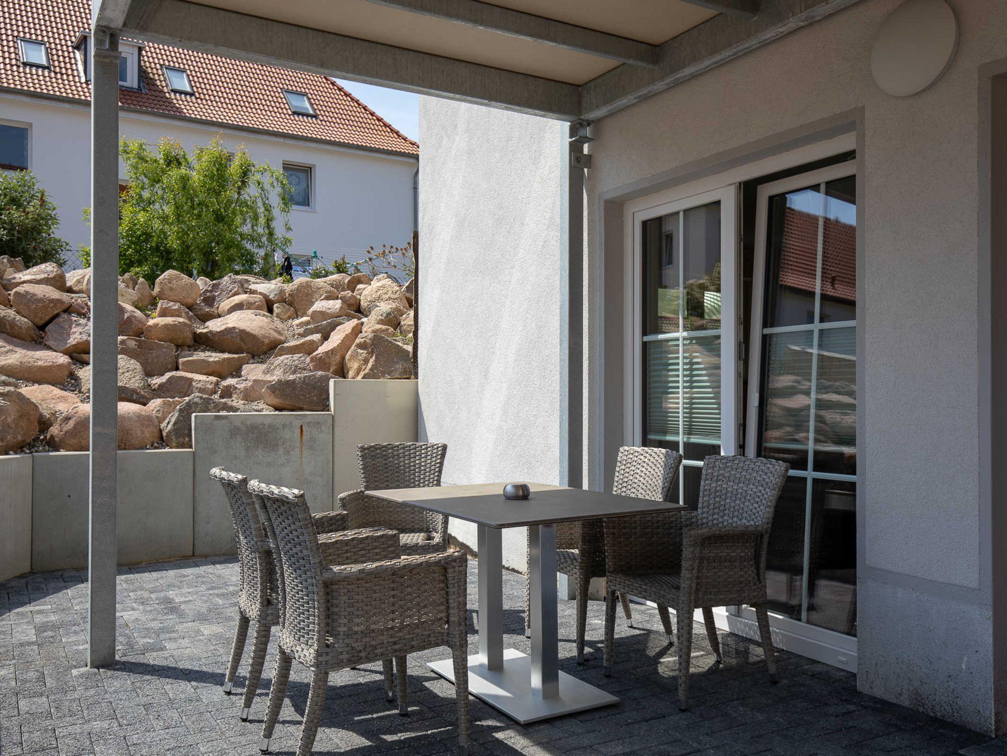 Das bequeme Ecksofa mit passenden Hockern im modernen Wohnzimmer lädt zum gemütlichen Beisammensein oder zum Entspannen beim Fernsehen ein. Auf der möblierten, überdachten Südost-Terrasse, die Sie von hier aus erreichen, können Sie den Abend bei einem Glas Wein ausklingen lassen.