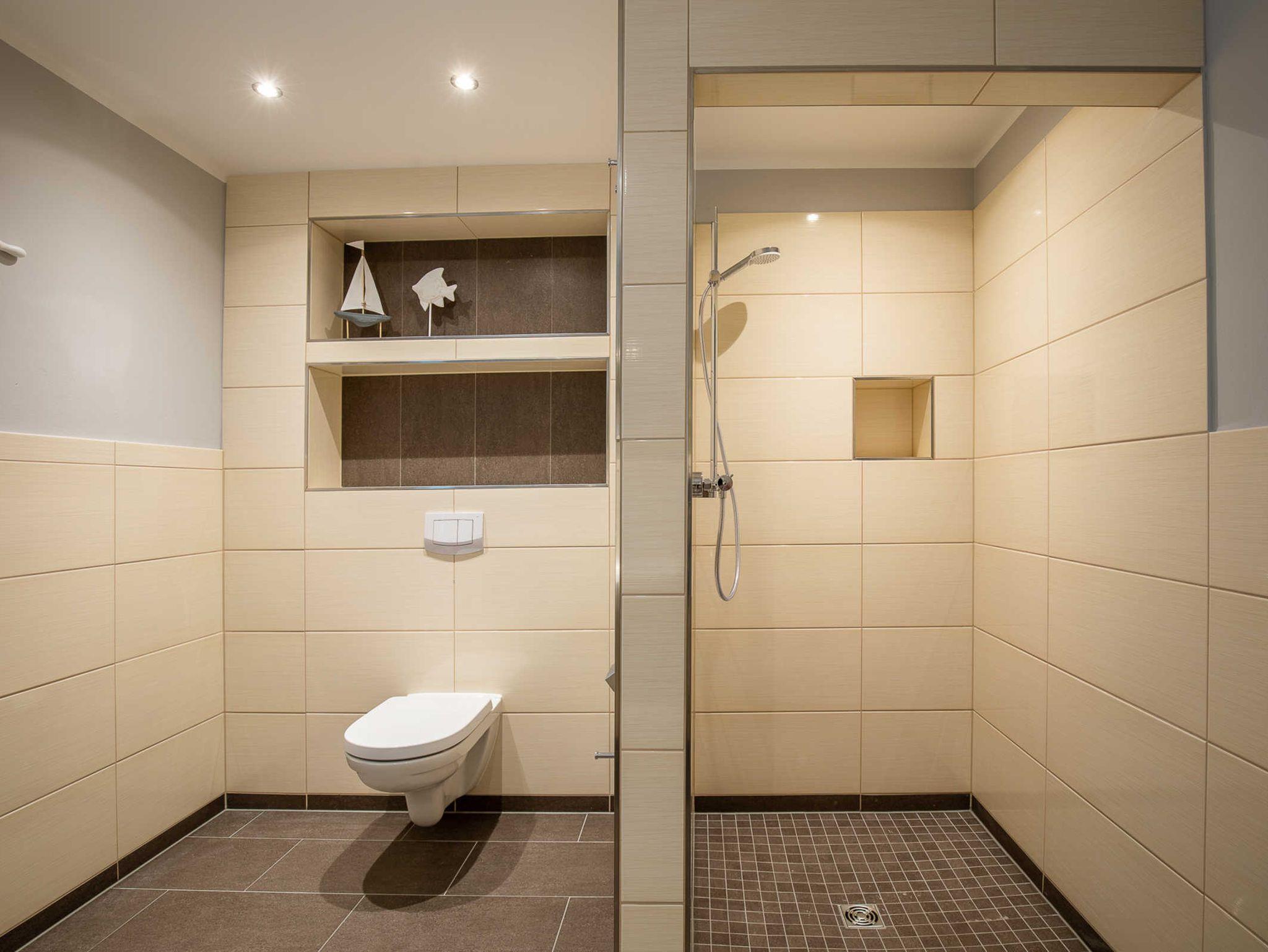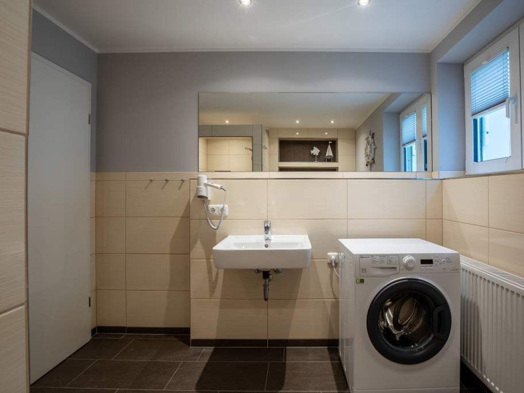 Starten Sie den Tag im großen modernen, hell gefliesten Bad. 2 Fenster sorgen hier für zusätzliches Tageslicht und die barrierefreie Dusche, Waschbecken, WC und die Waschmaschine bieten viel Komfort.