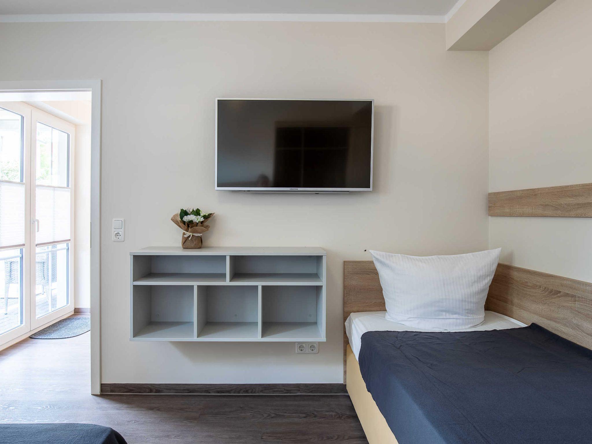 Das Schlafzimmer ist mit einem Doppelbett einem geräumigen Kleiderschrank und Schreibtisch, das Gäste-/ Kinderzimmer mit zwei Einzelbetten ausgestattet. Auch hier finden Sie einen Kleiderschrank und sogar einen weiteren Flatscreen-TV an der Wand.