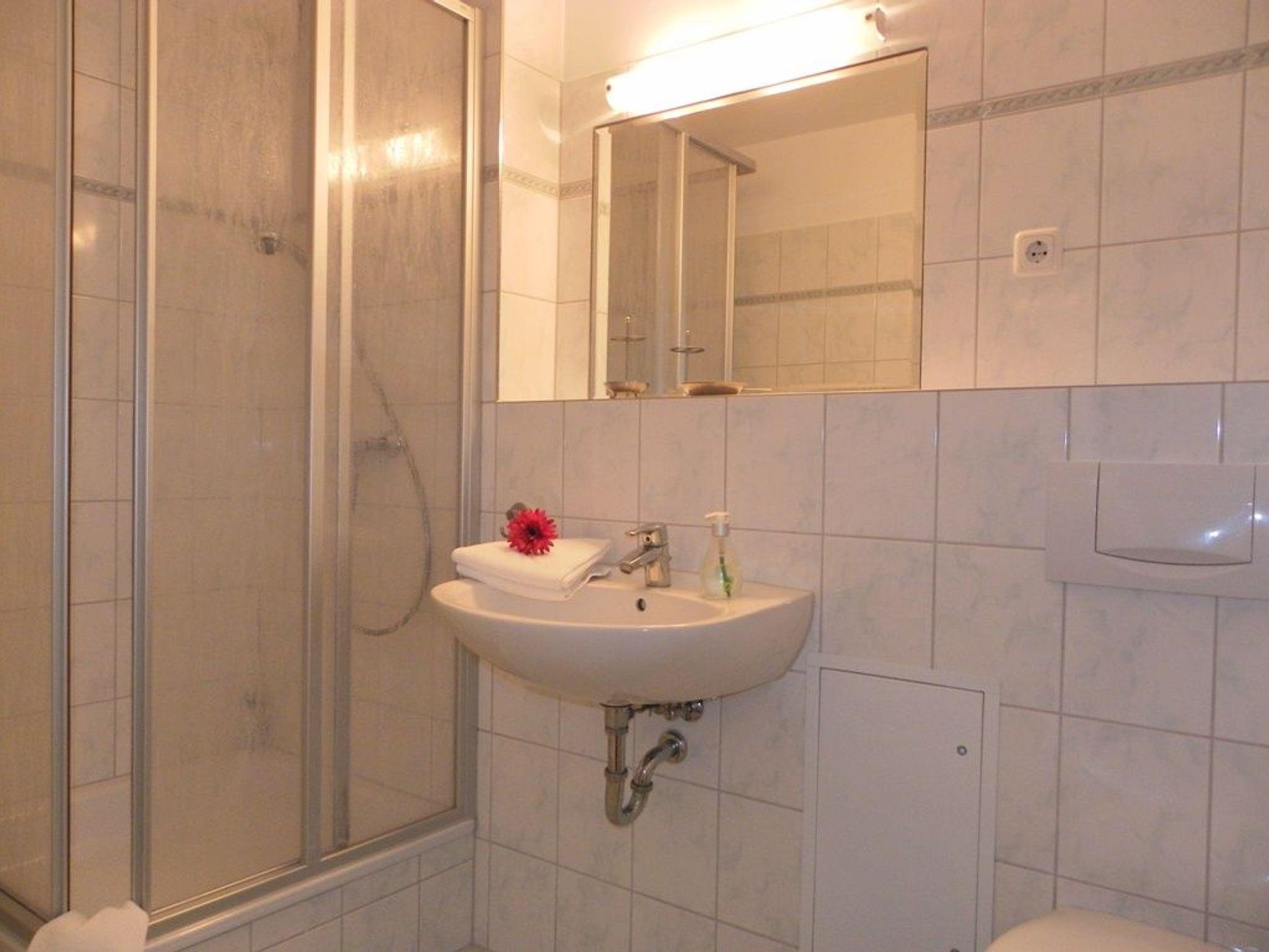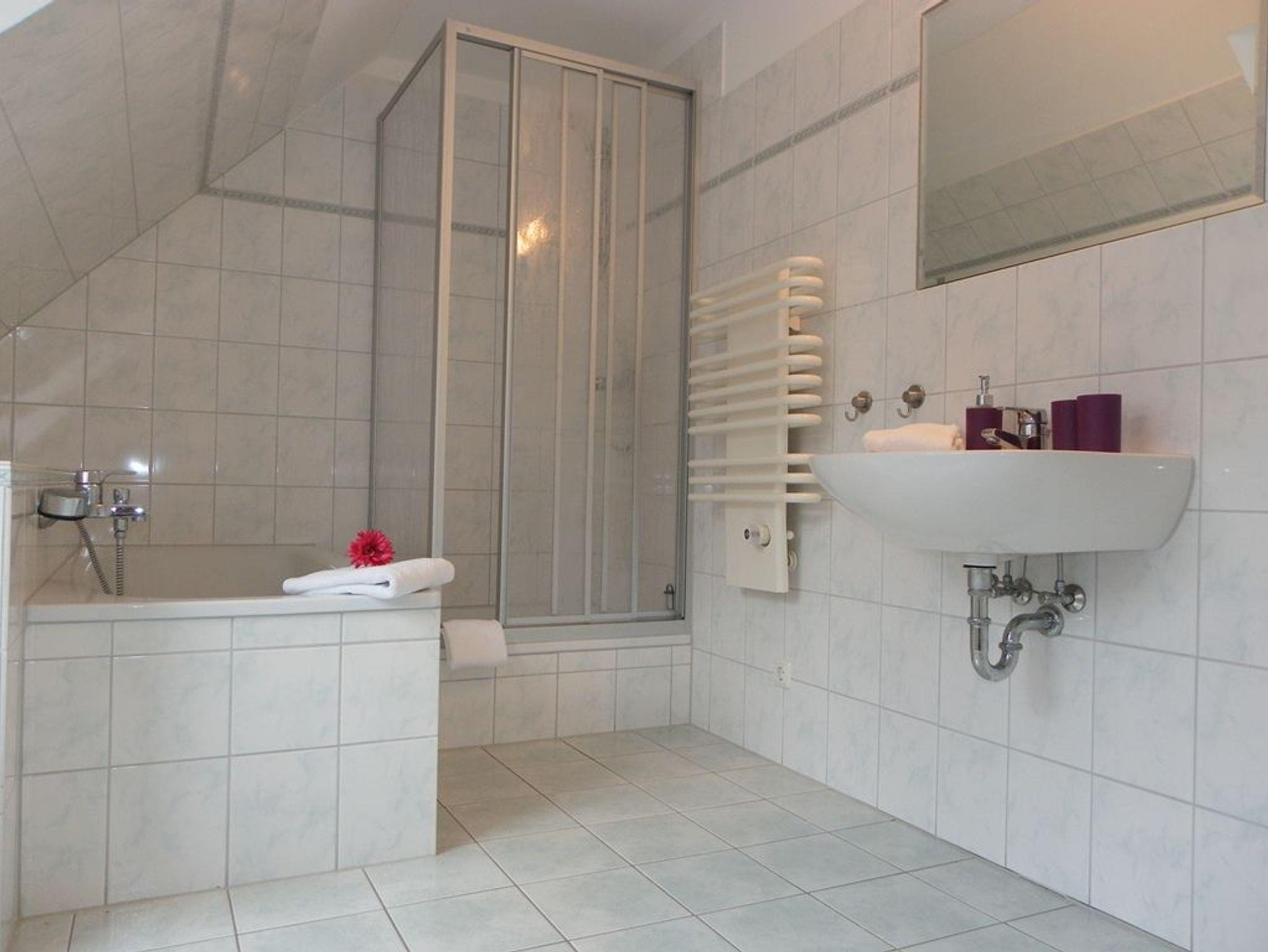 Ein zweites Bad mit Wanne, Dusche, Waschtisch, Fön, WC befindet sich ebenfalls auf dieser oberen Ebene. Eine Waschmaschine kann ohne Mehrkosten genutzt werden.