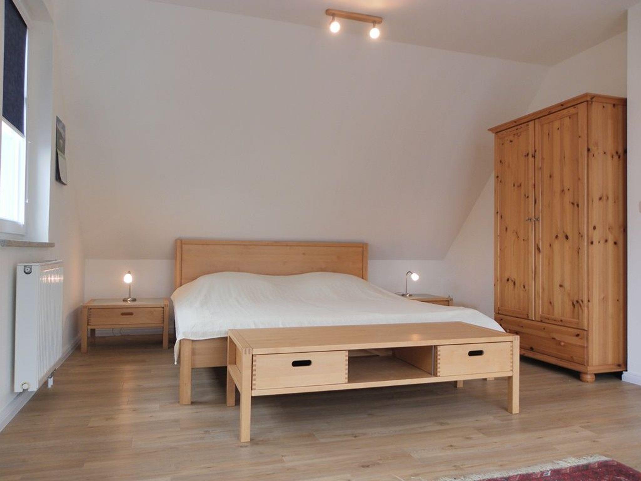 Über eine Wohnraumtreppe gelangen Sie in die obere Etage mit zwei separaten Schlafzimmern. Eines mit Doppelbett, Kleiderschrank und Balkon in Ausrichtung zur Ostsee. Das weitere Schlafzimmer ist mit einem Doppelbett und Kommoden eingerichtet.