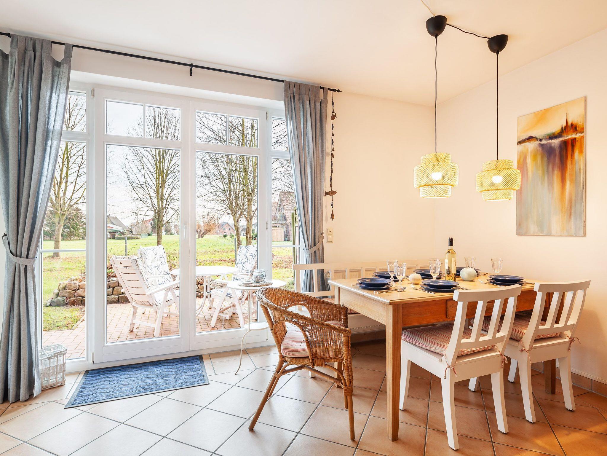 Ein schönes helles und offenes Wohn-und Esszimmer mit Zugang zur sonnigen Terrasse und Blick auf eine idyllischen Wiese sorgt für Urlaubsgenuss pur.