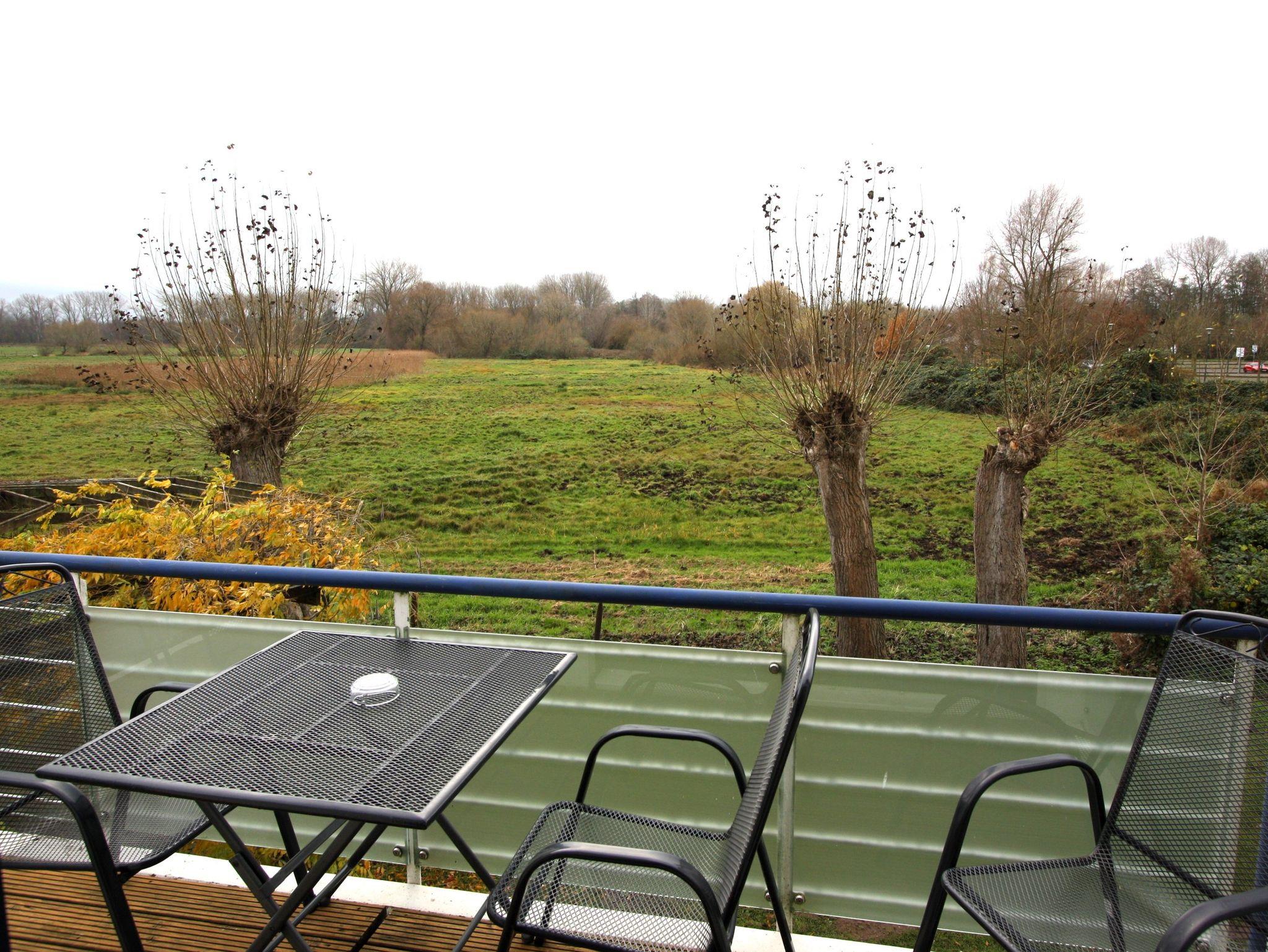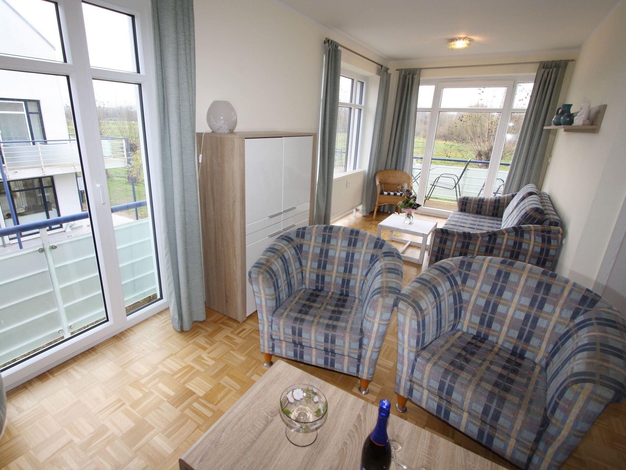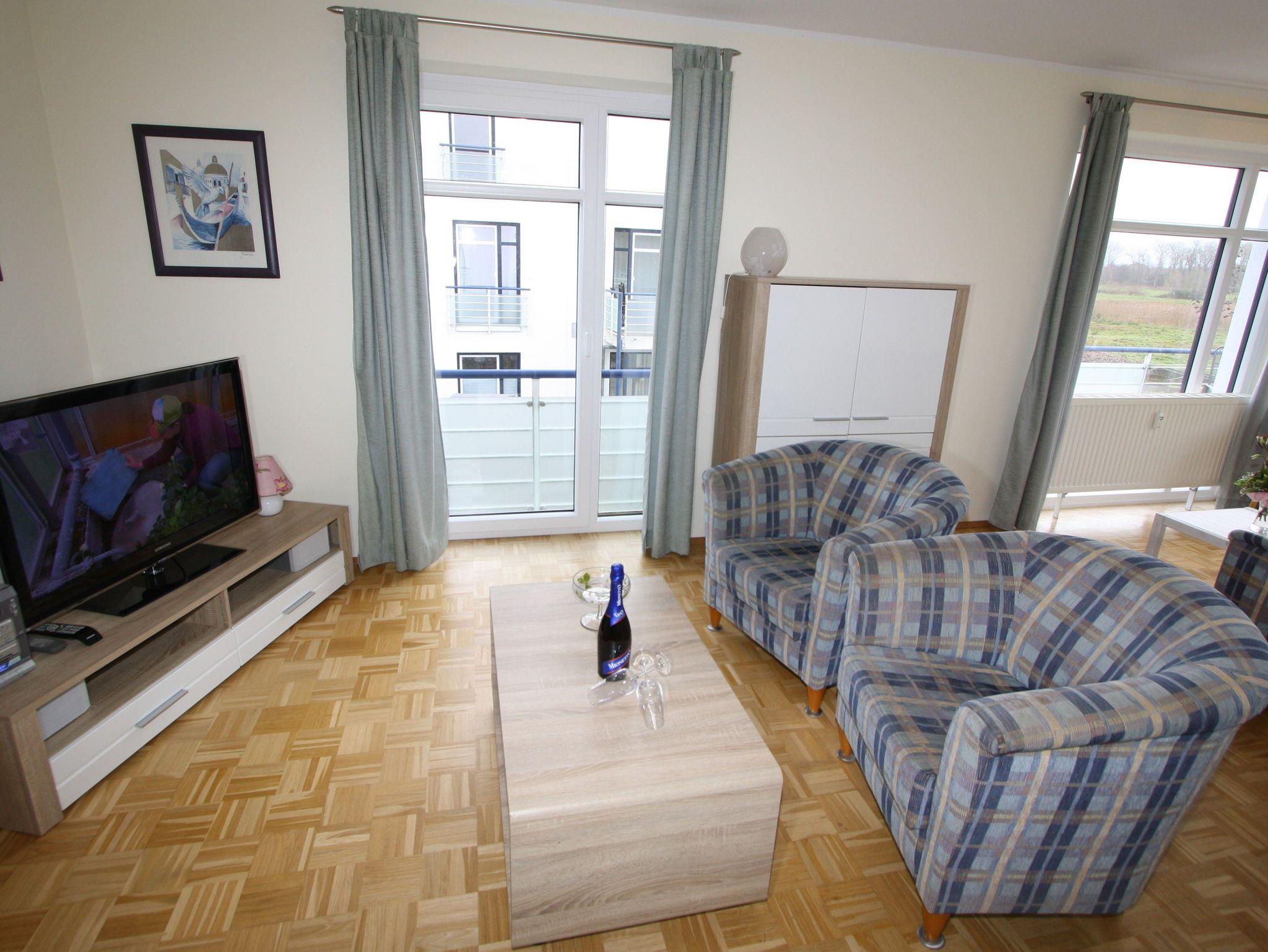 separater Essplatz, voll ausgestatteter Küchenbereich, Dusche/WC, Balkon zu den Haffwiesen, SAT-TV.