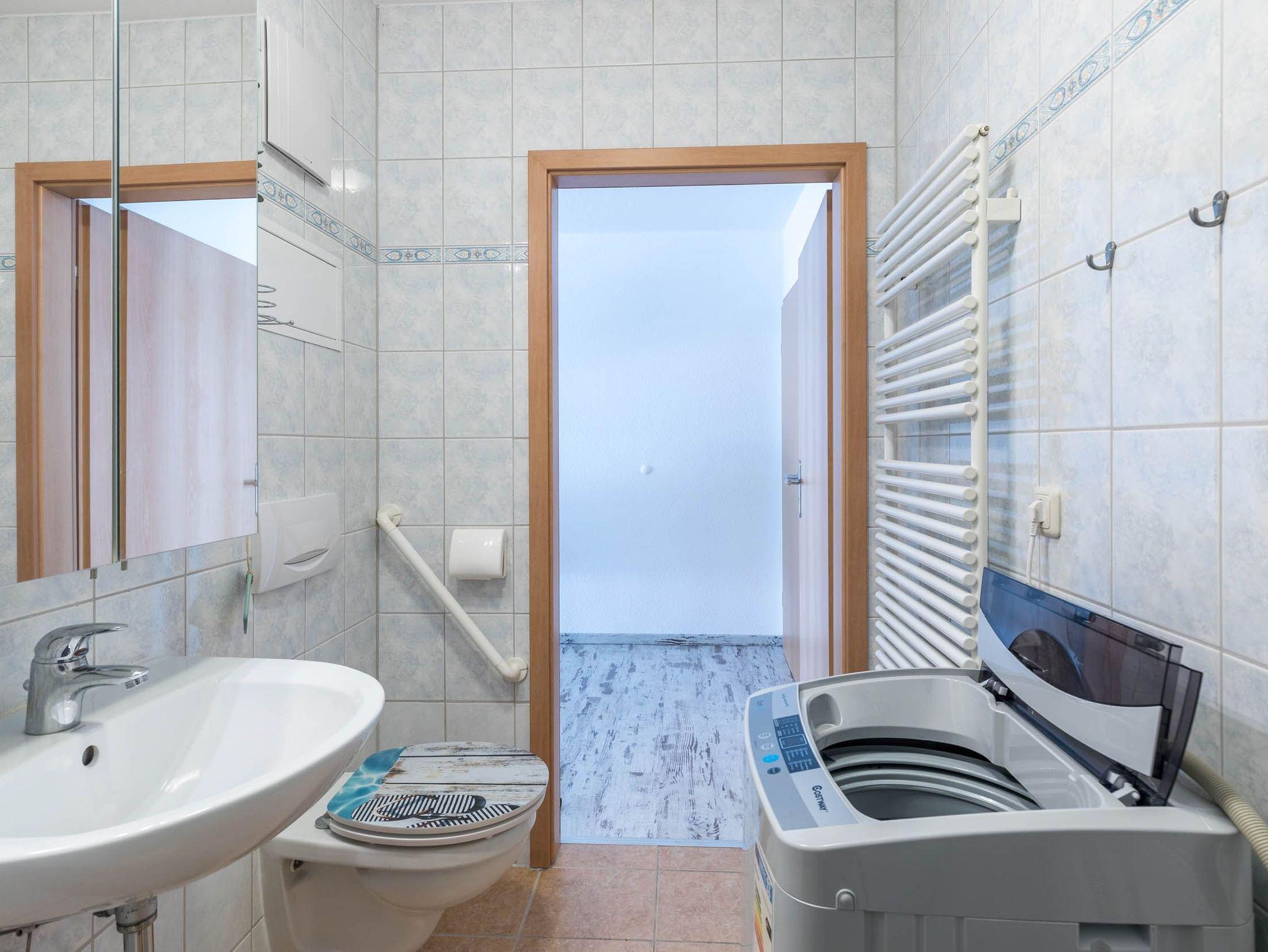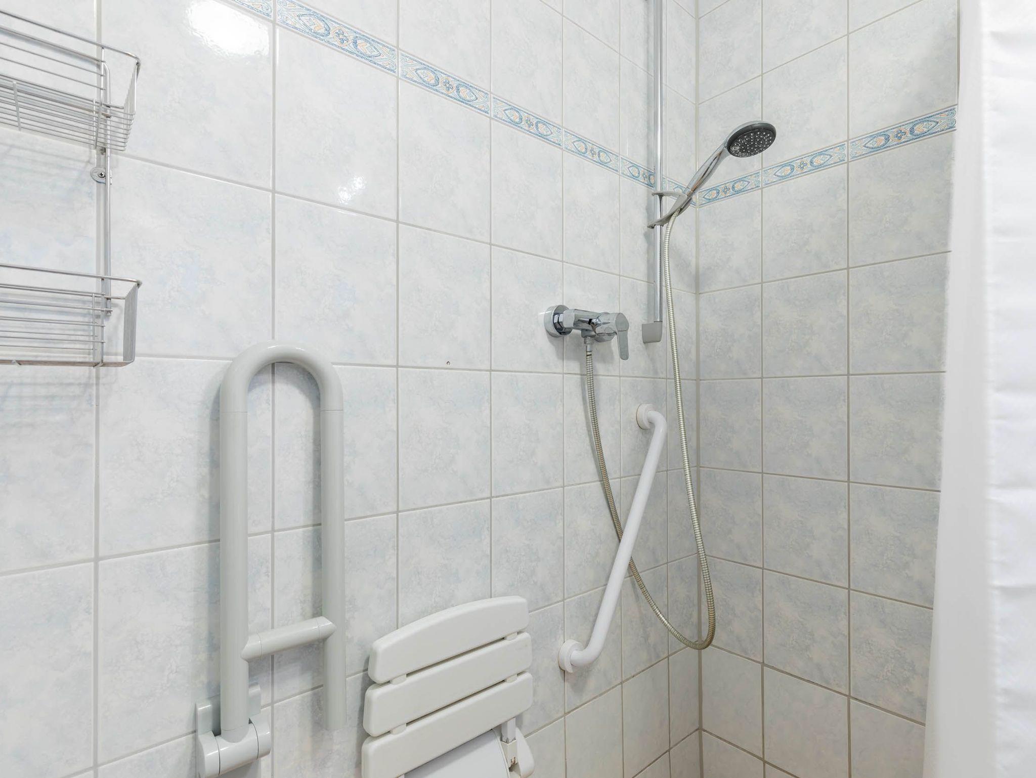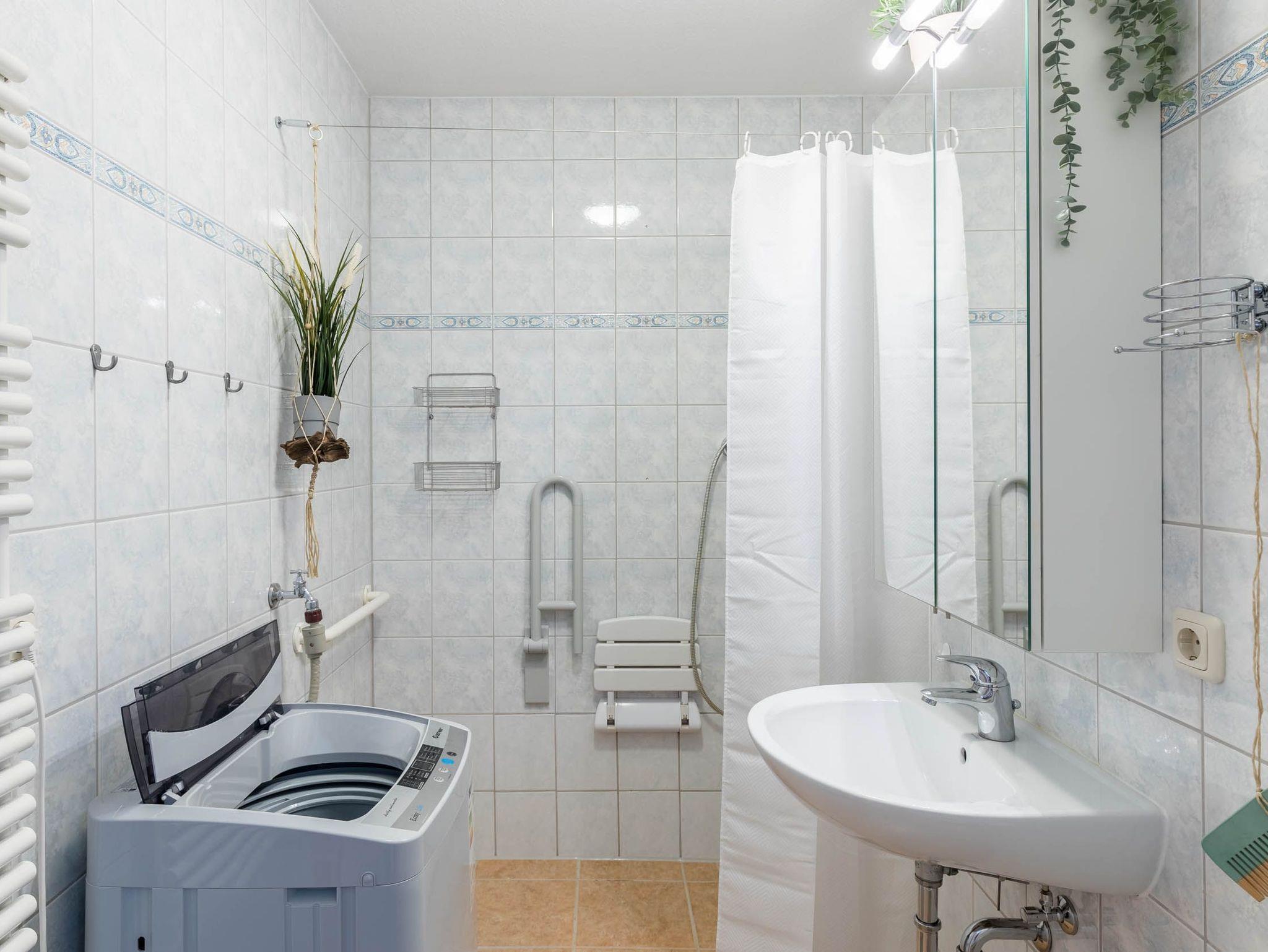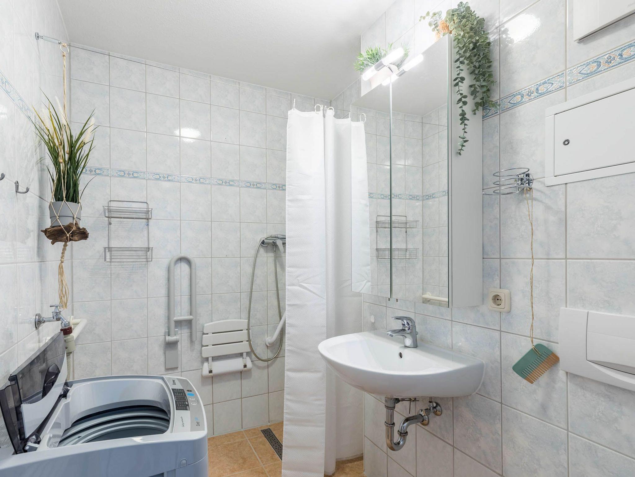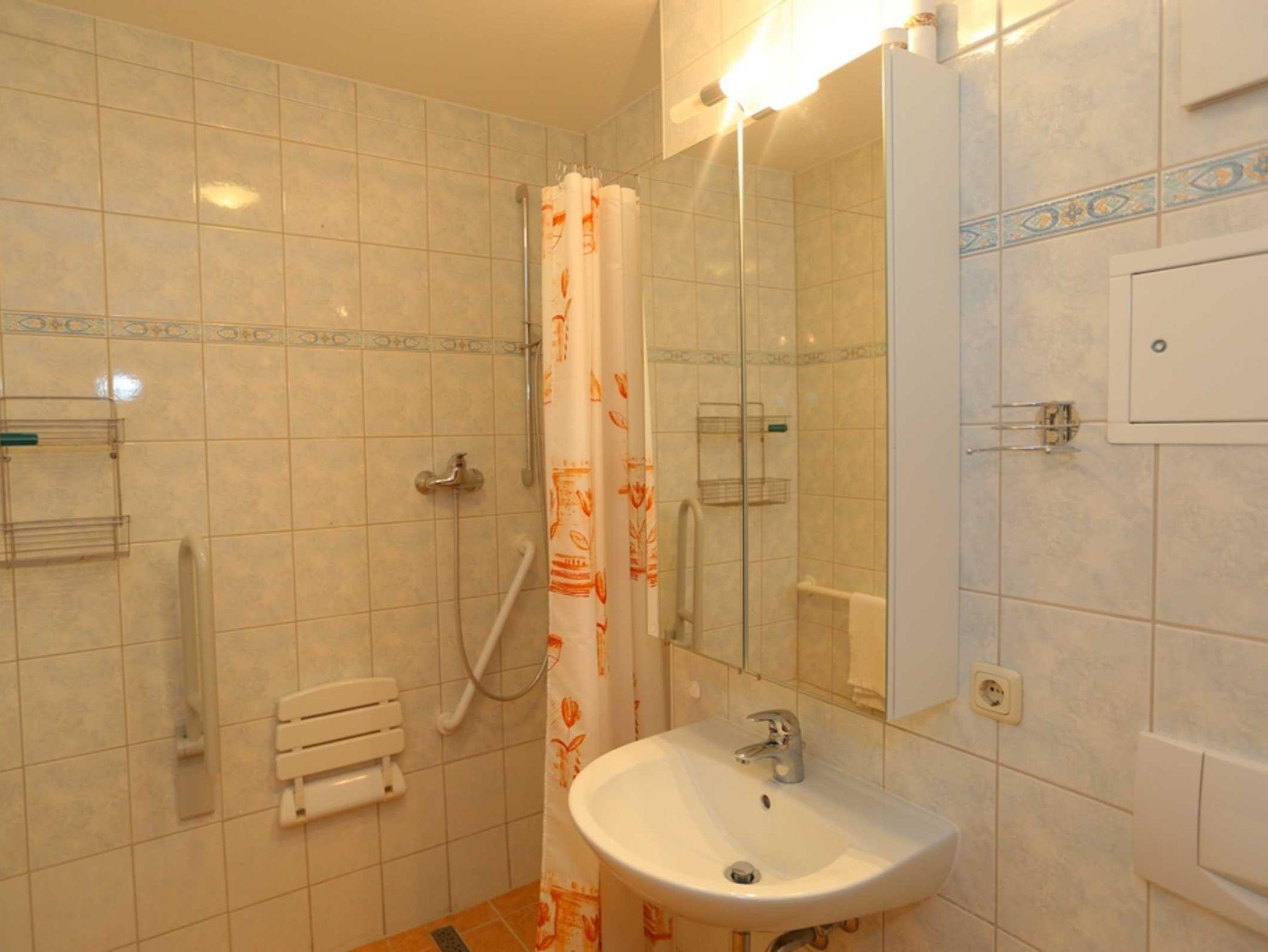 Ein freundliches seniorengeeignetes Duschbad mit ebenerdiger Dusche, befestigtem Duschhocker und Haltegriff komplettiert diese strandnahe Ferienwohnung.