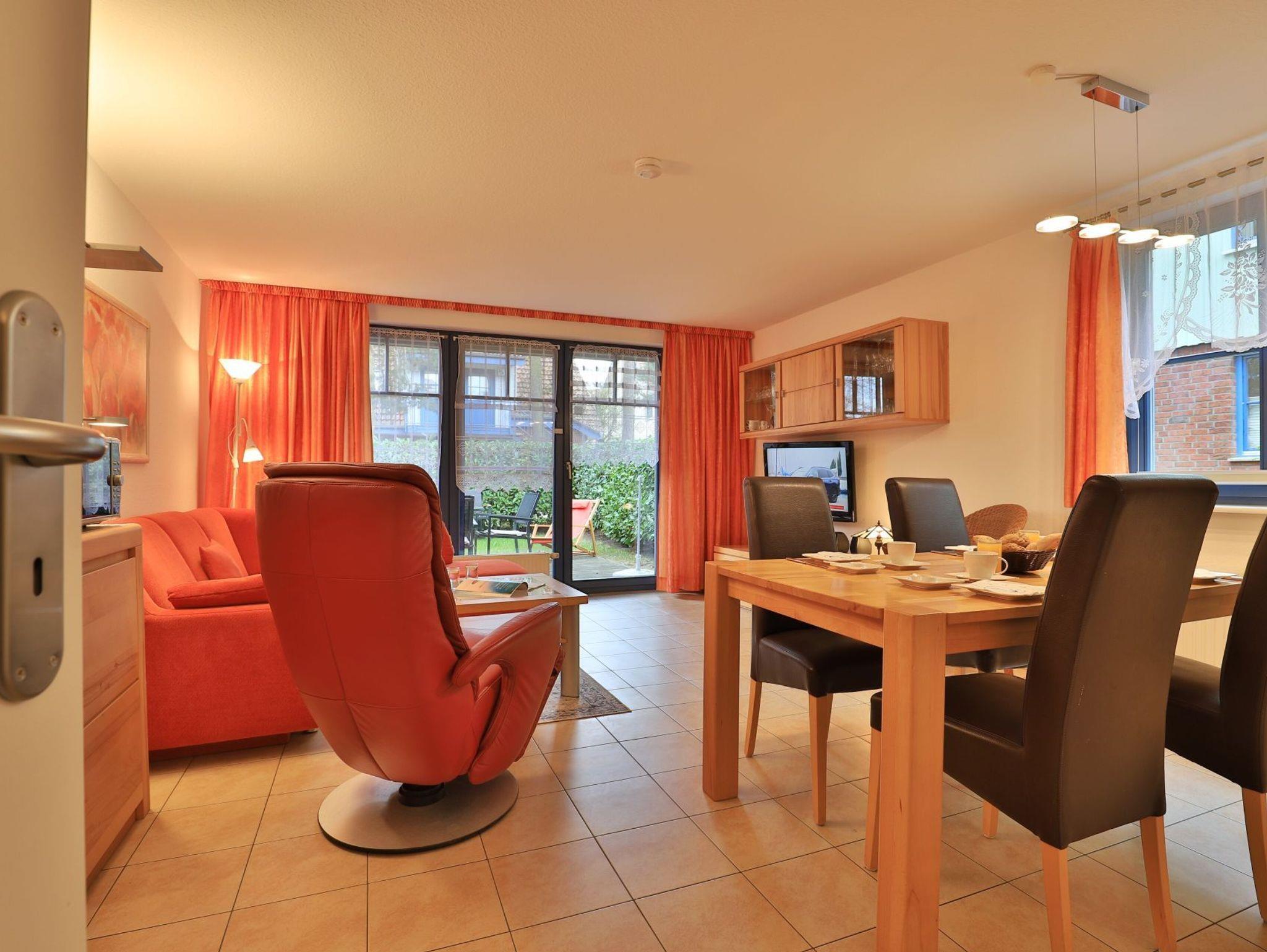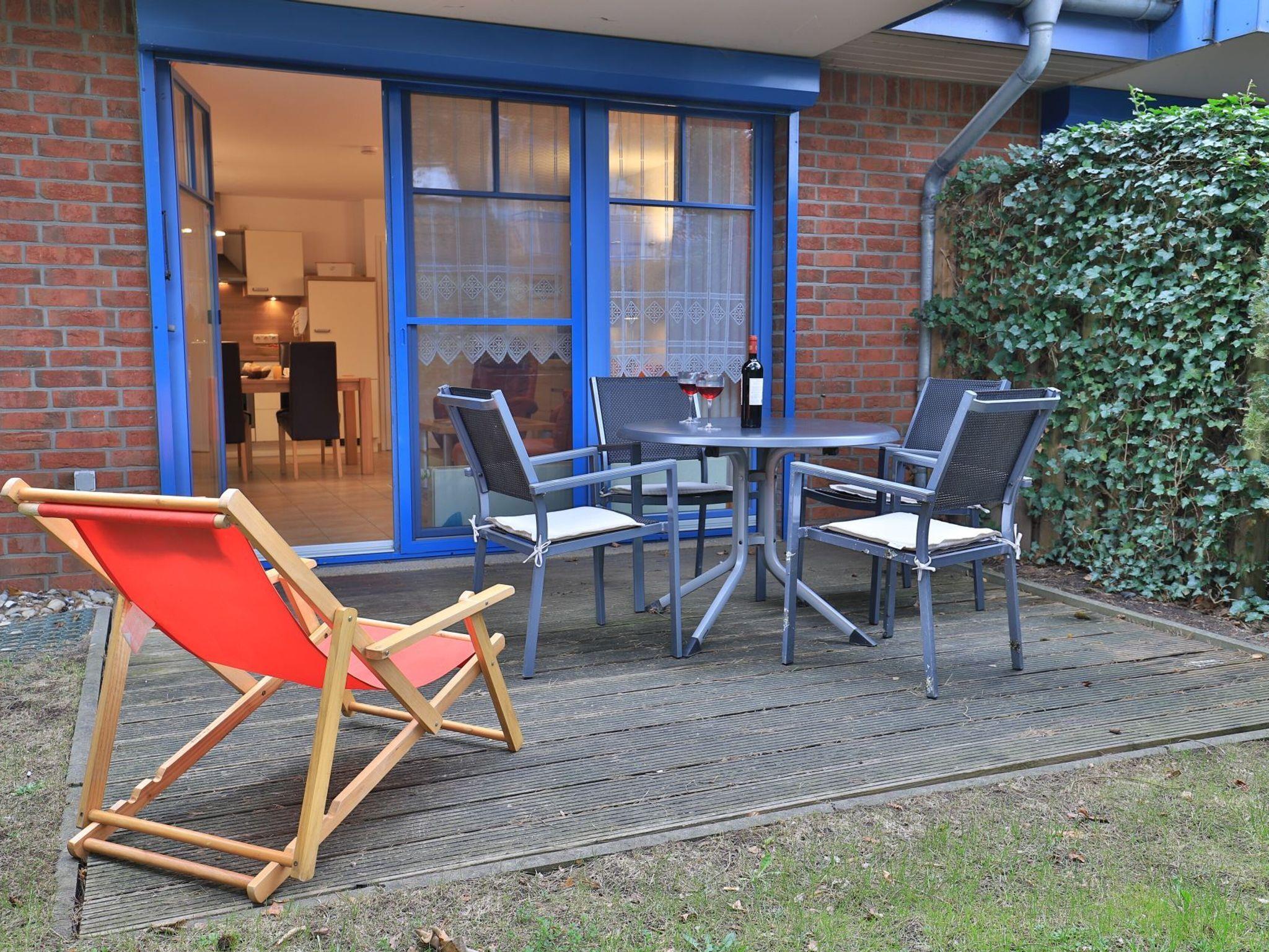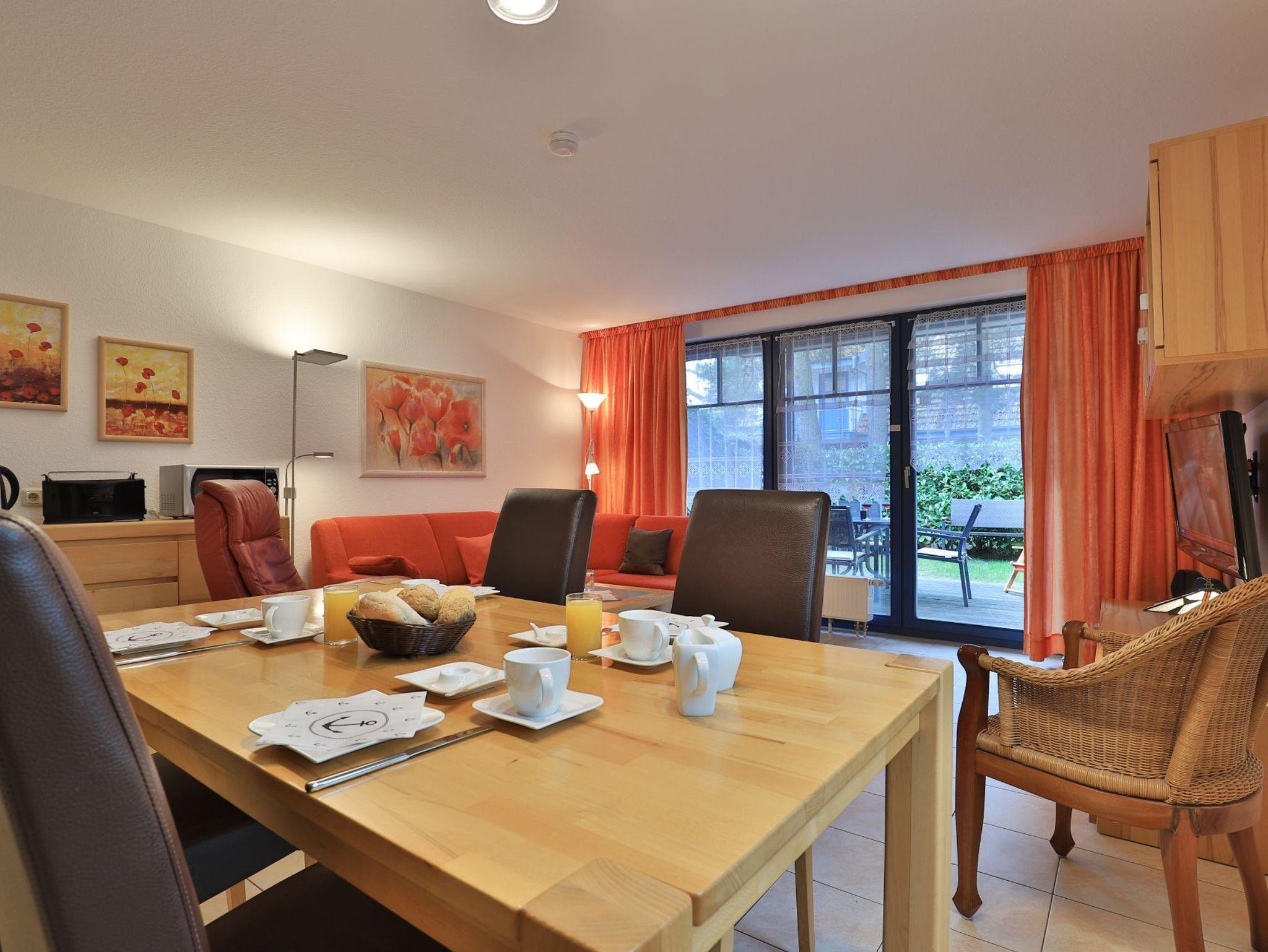 Die 2- Zimmer Ferienwohnung Papillon 12- ist behaglich möbliert und insgesamt gut ausgestattet. Die Wohnfläche beträgt von 55qm und kann mit bis zu 4 Personen bewohnt werden. Der Wohn-/Essbereich ist mit einem Sofa, das auch als Schlafsofa für zwei Personen nutzbar ist, eingerichtet und weitere Sitzmöglichkeiten sowie ein Relax Sessel, Fernseher, DVD-Player, Musikanlage, kostenfreie WLAN-Nutzung sind vorhanden. Die saisonal möblierte Süd- Terrasse lädt zum Entspannen ein. Ein Elektrogrill ermöglicht Grillen auf der Terrasse. In der modernen Wohnküche stehen Ceranherd, Backofen, Mikrowelle, Dunstabzug, Geschirrspüler sowie Kühlschrank mit integr. Gefrierfach, Kaffeemaschine, Toaster und Wasserkocher bereit. Ihre Mahlzeiten nehmen Sie am Esstisch zu sich. Das separate Schlafzimmer empfängt Sie mit zwei Einzelbetten, Kleiderschrank und 2.Fernseher. Das teilweise modernisierte Tageslicht Duschbad ist mit Waschtisch, Föhn, WC ausgestattet. Gegen Gebühr können Sie im Untergeschoß des Hauses Waschmaschine und Wäschetrockner nutzen. Bügeleisen und Bügelbrett sowie ein Kinderhochstuhl, Kinderbett, Bollerwagen sind ebenso vorhanden. Ihren PKW parken Sie kostenfrei auf dem wohnungseigenen Außenstellplatz. Bitte beachten Sie, dass es sich um eine Nichtraucherwohnung handelt. Kleine Hunde sind gegen eine Gebühr in Höhe von 10 Euro/Tag herzlich willkommen. Zur Ostsee gelangen Sie in nur ca. 250 Meter.