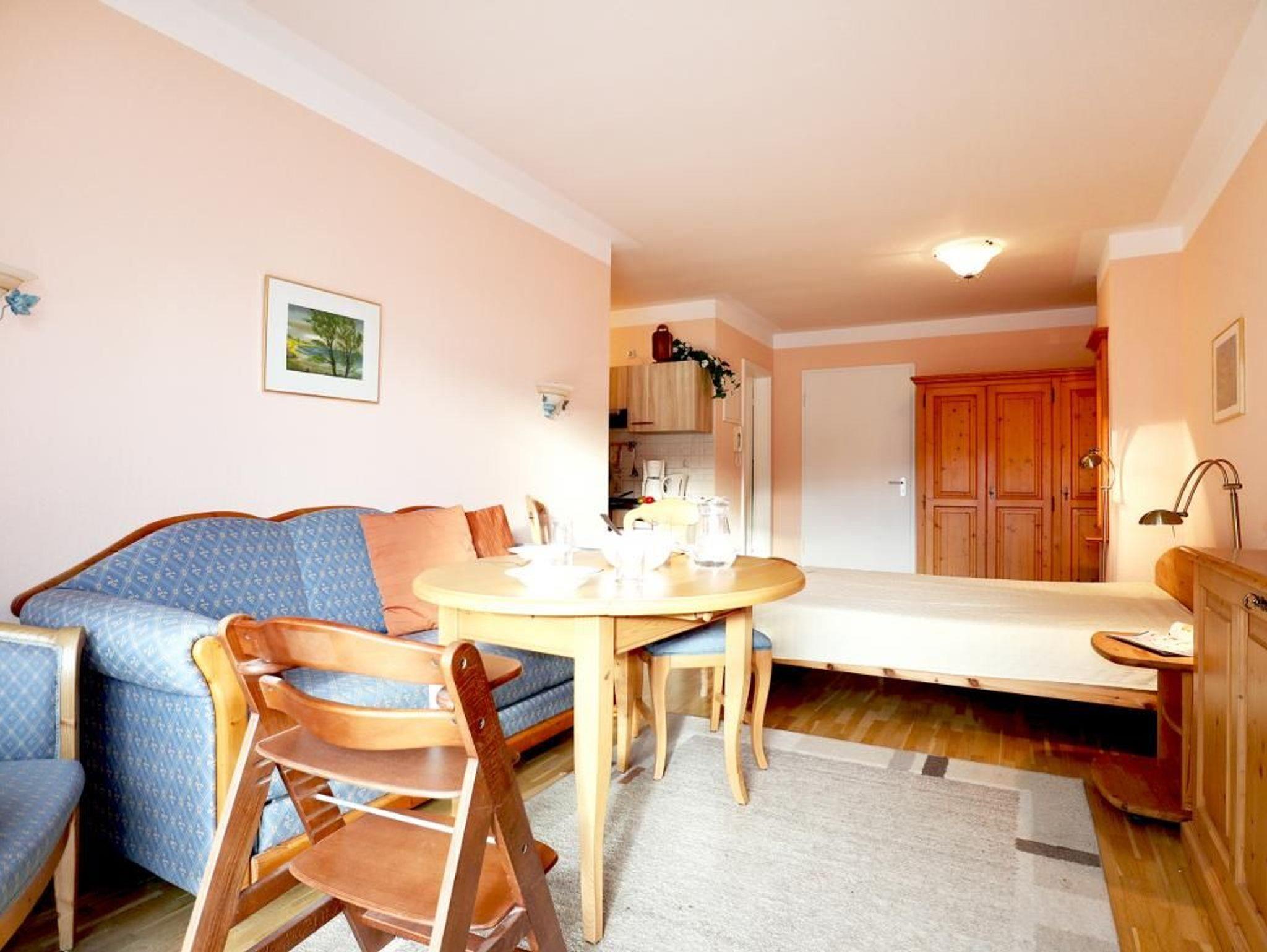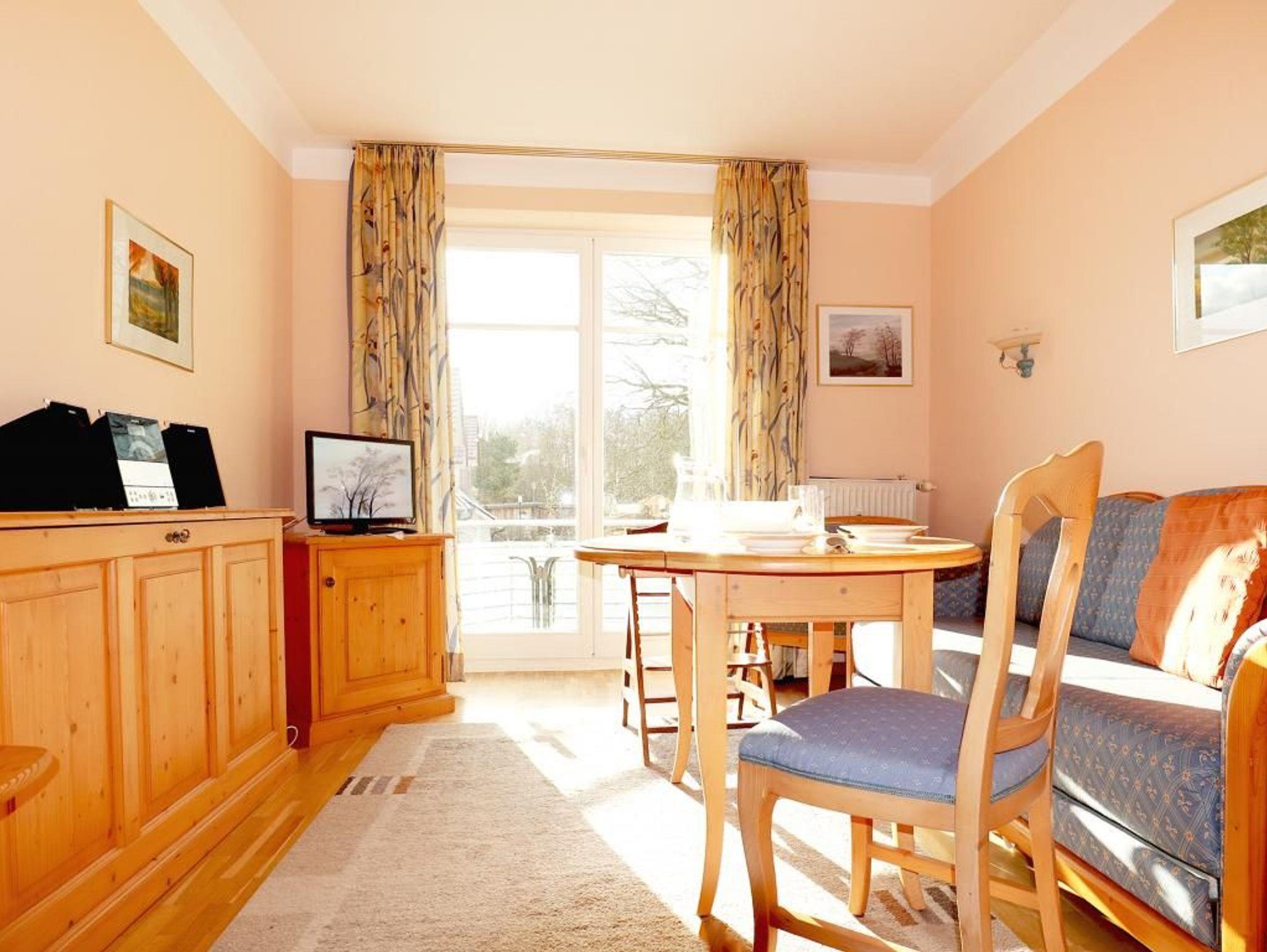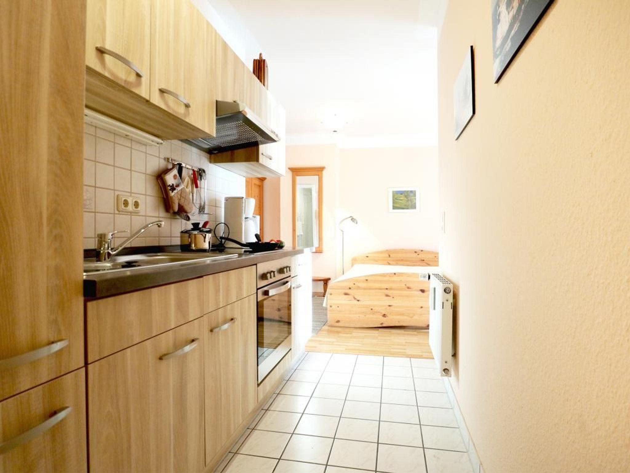 Die behaglich möblierte 1-Zimmerwohnung für 2 Personen, befindet sich im 1. OG und besitzt eine Wohnfläche von 25qm. Der gemütliche Wohn-Ess-Schlafbereich ist mit einem Sofa und einem Esstisch sowie einem Doppelbett und Kleiderschrank, Kommoden möbliert. Ein Fernseher, Musikanlage und gebührenfreies WLAN sind selbstverständlich vorhanden. Die geschickt in eine Nische platzierte Wohnküche ist offen gestaltet und ermöglicht die eigenständige Versorgung mit Urlaubsmahlzeiten. Herd, Backofen, Dunstabzug, Kühlschrank mit integr. Gefrierfach, Kaffeemaschine, Toaster usw. gehören zur Ausstattung. Ihre Mahlzeiten nehmen Sie am Esstisch zu sich, oder Sie genießen die Vorzüge des saisonal möblierten Balkons in südliche Ausrichtung. Zugehörig ist ein modernisiertes Duschbad mit Waschtisch, Handtuchheizung, WC. Für Kleinkinder steht ein Kinderhochstuhl in der Wohnung bereit. Waschmaschine und Wäschetrockner stehen allen Gästen gegen Gebühr zur Verfügung. Mitgebrachte Fahrräder können auf dem hauseigenen Grundstück an Fahrradständern, oder nach Verfügbarkeit im Untergeschoss des Hauses untergebracht werden. Haustiere sind nicht gestattet. Nichtraucherwohnung.