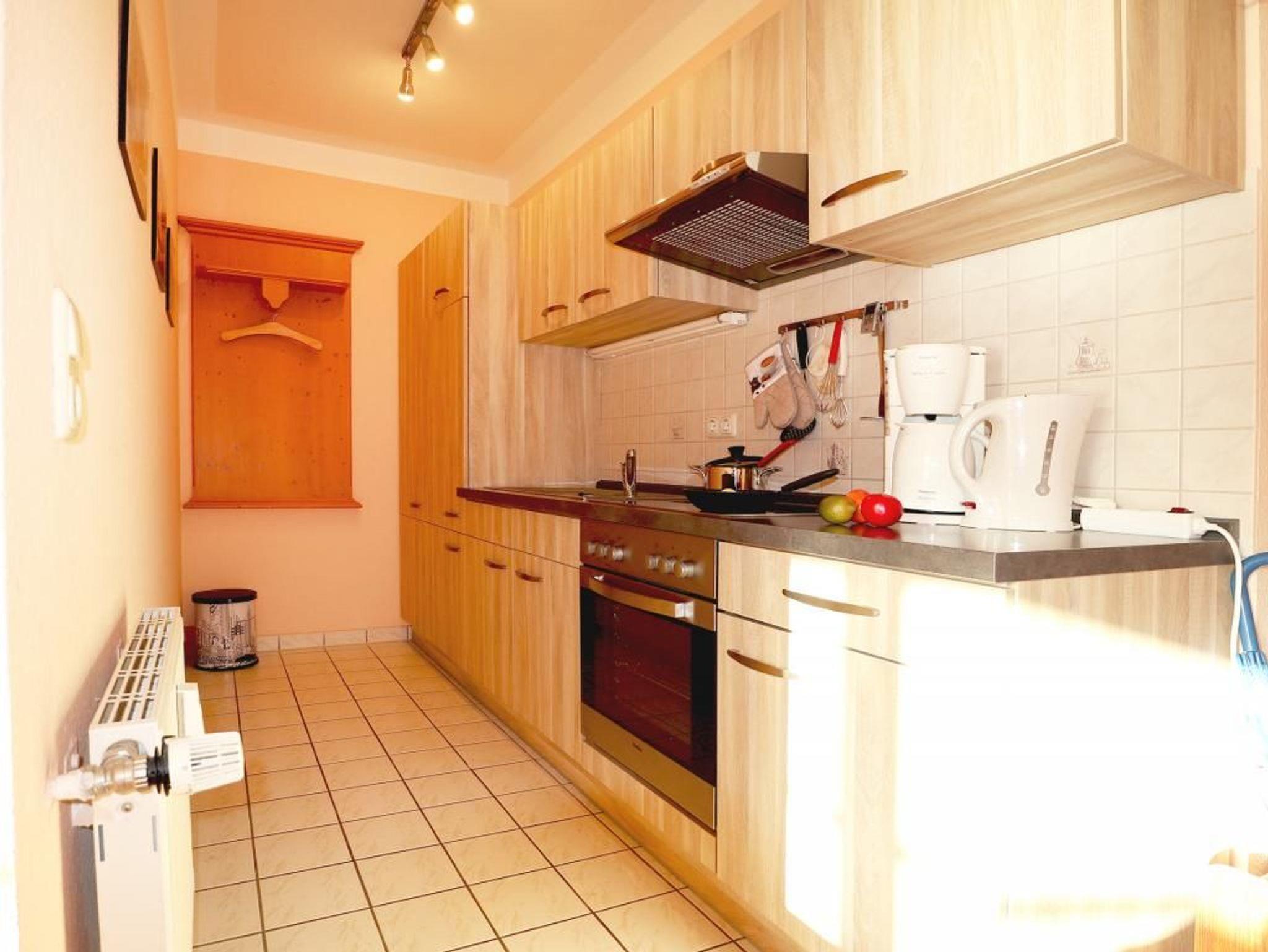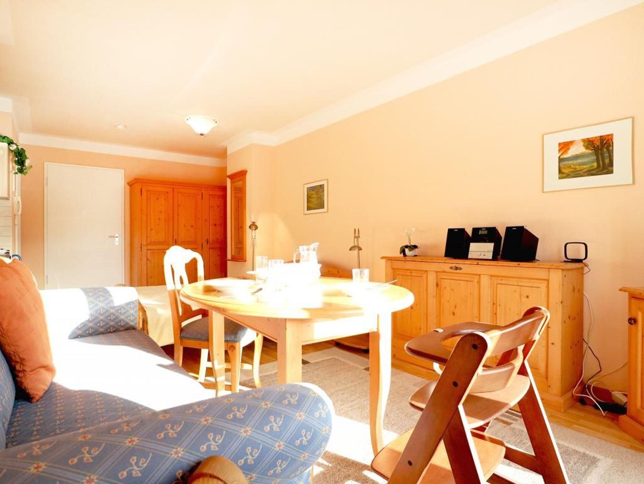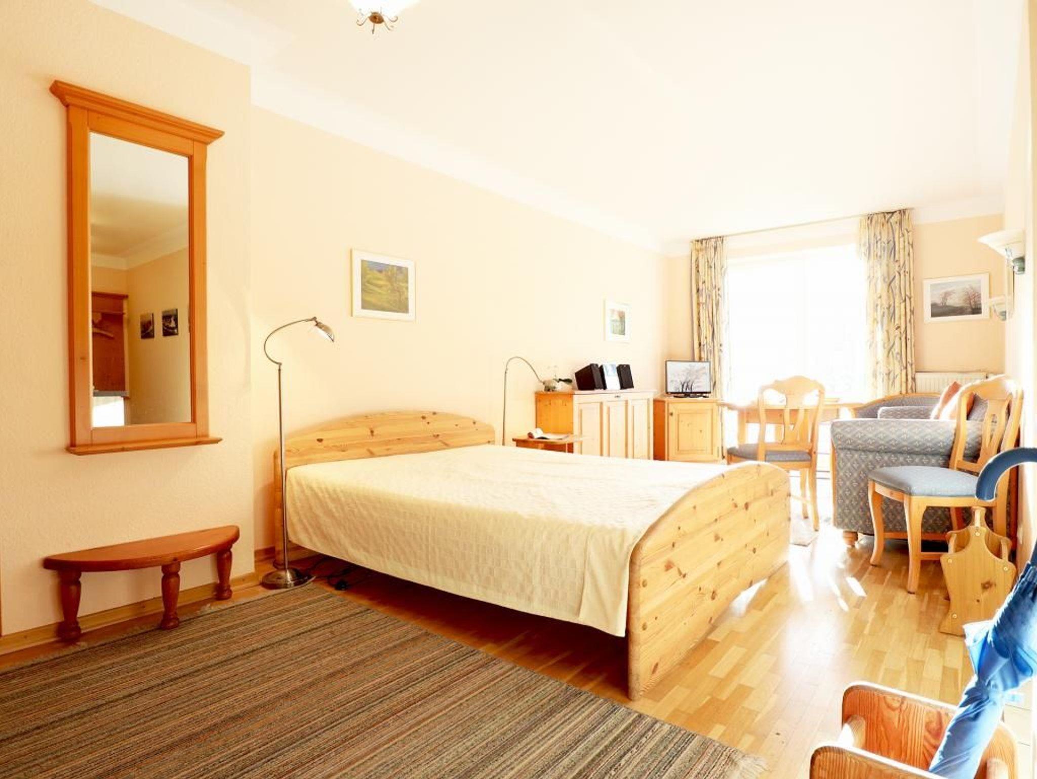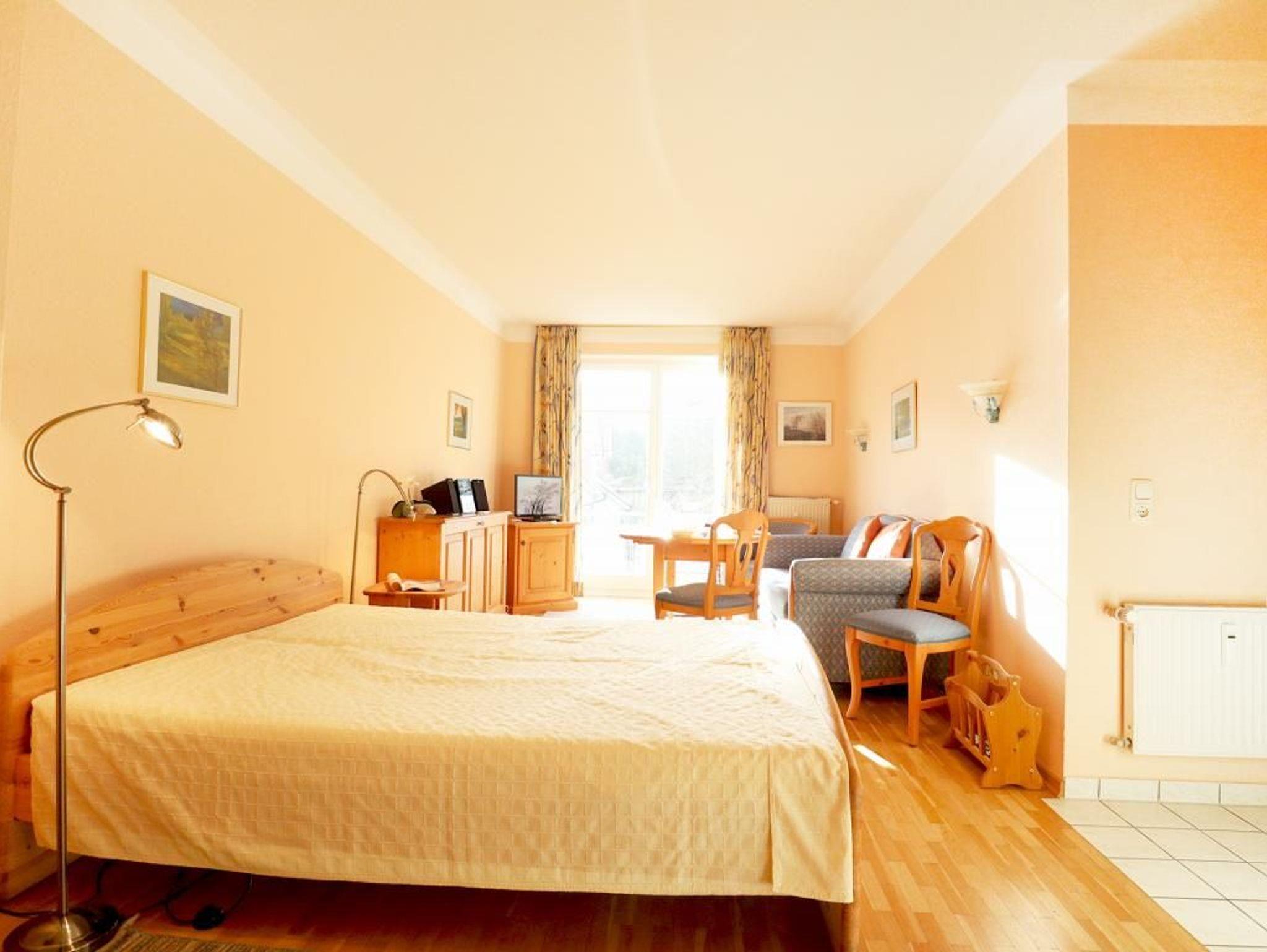 Die behaglich möblierte 1-Zimmerwohnung für 2 Personen, befindet sich im 1. OG und besitzt eine Wohnfläche von 25qm. Der gemütliche Wohn-Ess-Schlafbereich ist mit einem Sofa und einem Esstisch sowie einem Doppelbett und Kleiderschrank, Kommoden möbliert. Ein Fernseher, Musikanlage und gebührenfreies WLAN sind selbstverständlich vorhanden. Die geschickt in eine Nische platzierte Wohnküche ist offen gestaltet und ermöglicht die eigenständige Versorgung mit Urlaubsmahlzeiten. Herd, Backofen, Dunstabzug, Kühlschrank mit integr. Gefrierfach, Kaffeemaschine, Toaster usw. gehören zur Ausstattung. Ihre Mahlzeiten nehmen Sie am Esstisch zu sich, oder Sie genießen die Vorzüge des saisonal möblierten Balkons in südliche Ausrichtung. Zugehörig ist ein modernisiertes Duschbad mit Waschtisch, Handtuchheizung, WC. Für Kleinkinder steht ein Kinderhochstuhl in der Wohnung bereit. Waschmaschine und Wäschetrockner stehen allen Gästen gegen Gebühr zur Verfügung. Mitgebrachte Fahrräder können auf dem hauseigenen Grundstück an Fahrradständern, oder nach Verfügbarkeit im Untergeschoss des Hauses untergebracht werden. Haustiere sind nicht gestattet. Nichtraucherwohnung.