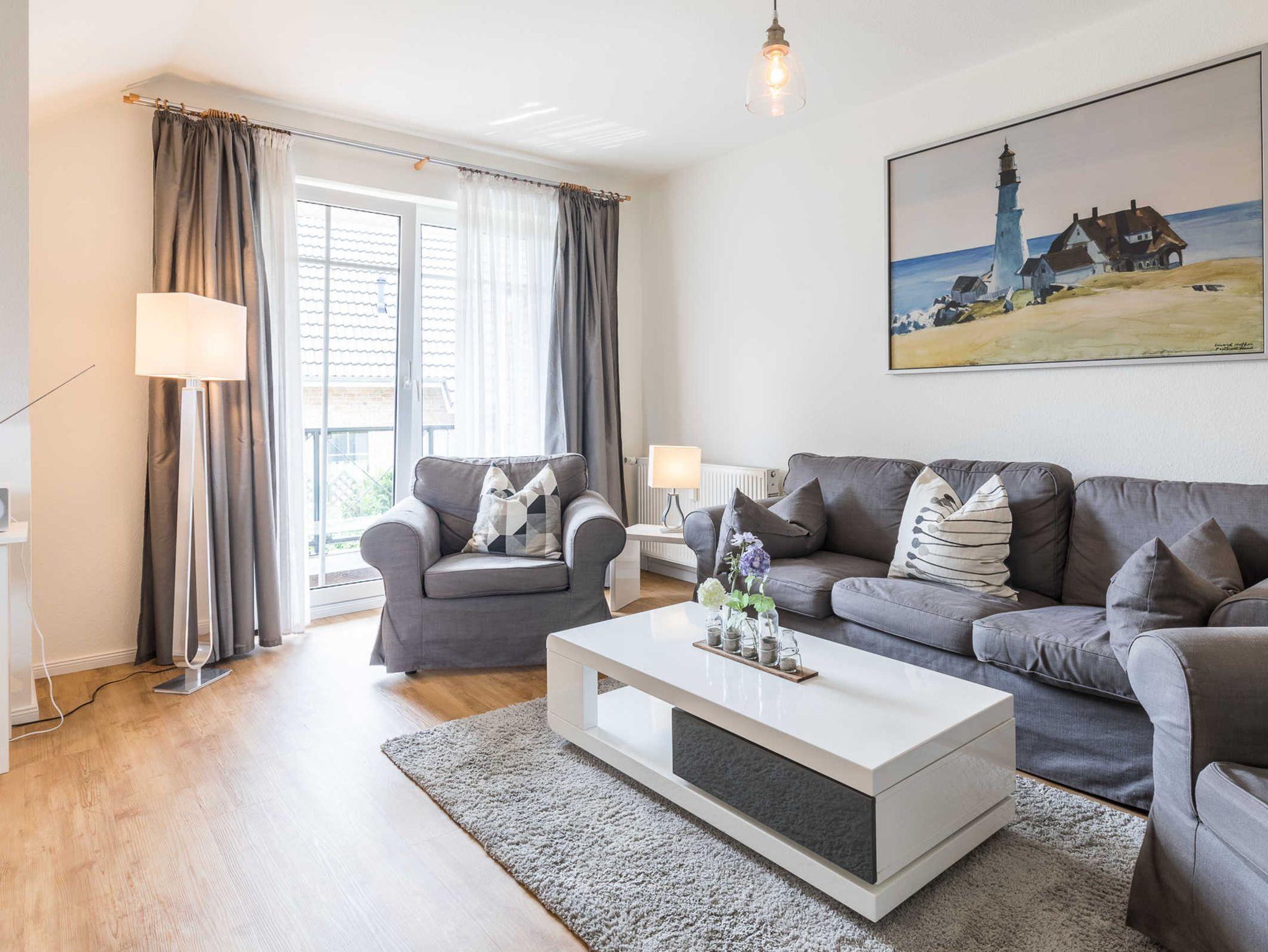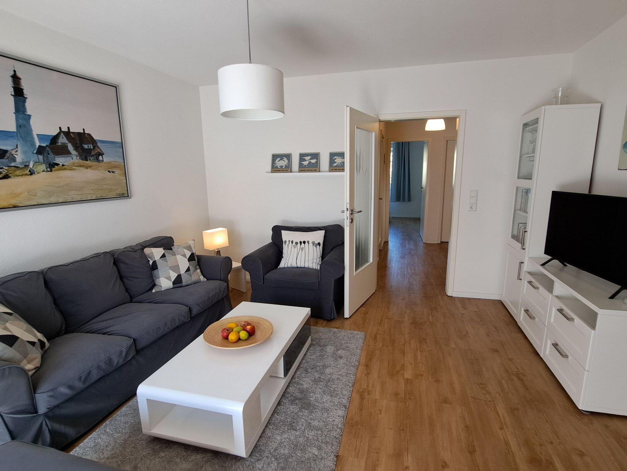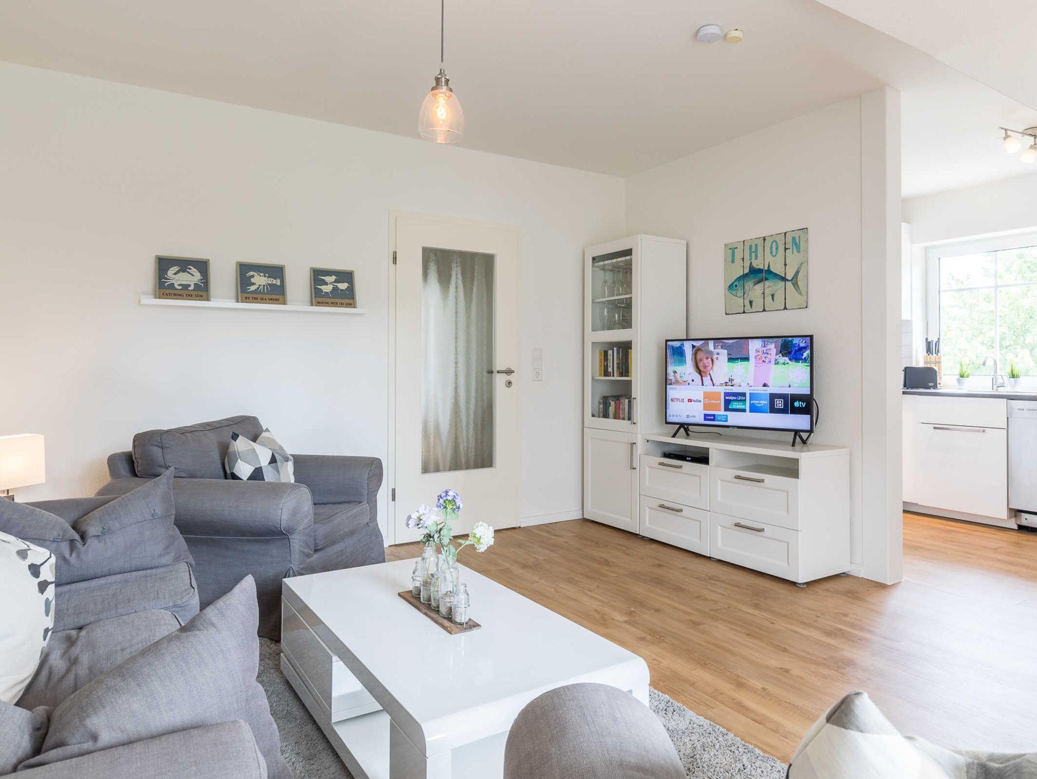 Das gemütliche Wohnzimmer bietet Ihnen Unterhaltung mit einem Fernseher (Samsung 4K Smart-TV), mit dem Sie entspannt vom bequemem Sofa aus auch Netflix streamen können,. Eine kleine, feine Strandbibliothek ist ebenso vorhanden.