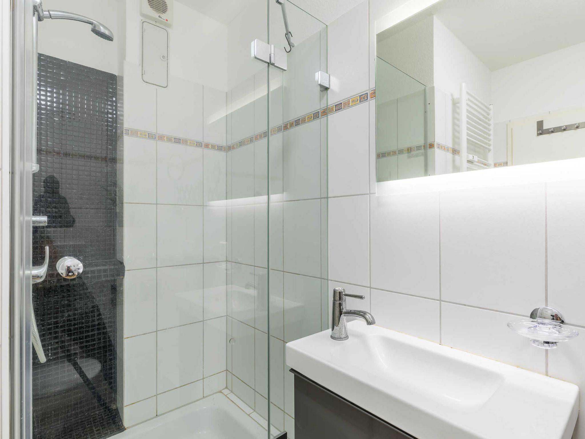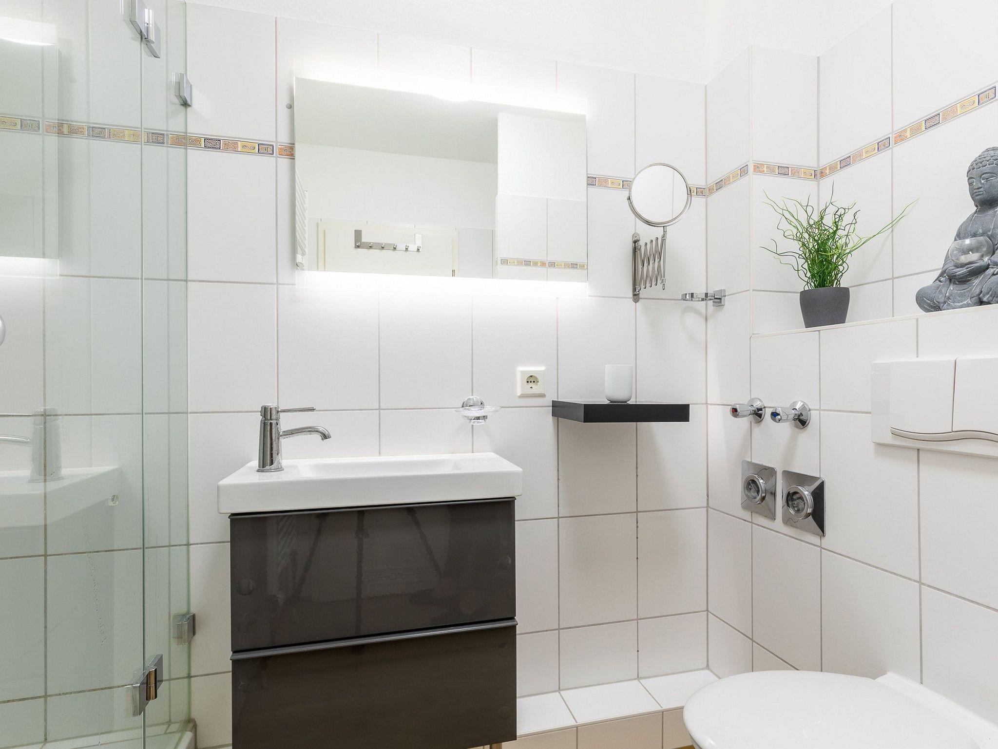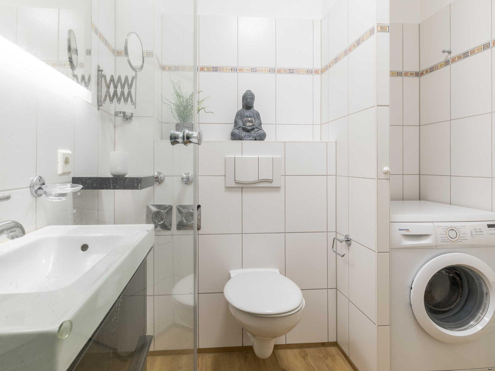 Das innenliegende Badezimmer bietet neben Dusche und WC auch eine Waschmaschine zur kostenfreien Nutzung.