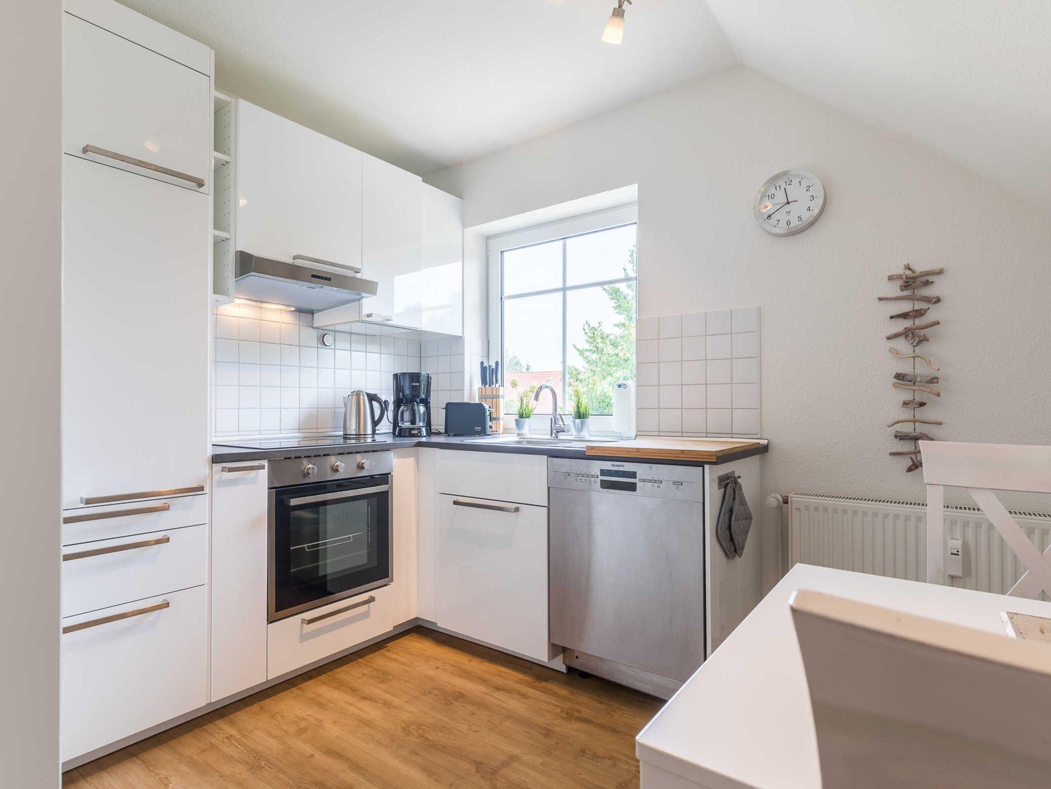 Die integrierte offene Wohnküche ist voll ausgestattet. Vom Induktionsherd und Backofen über Kaffeemaschine, Wasserkocher bis hin zur Spülmaschine und Dunstabzugshaube finden Sie ein hervorragendes Inventar für Ihre Selbstverpflegung.