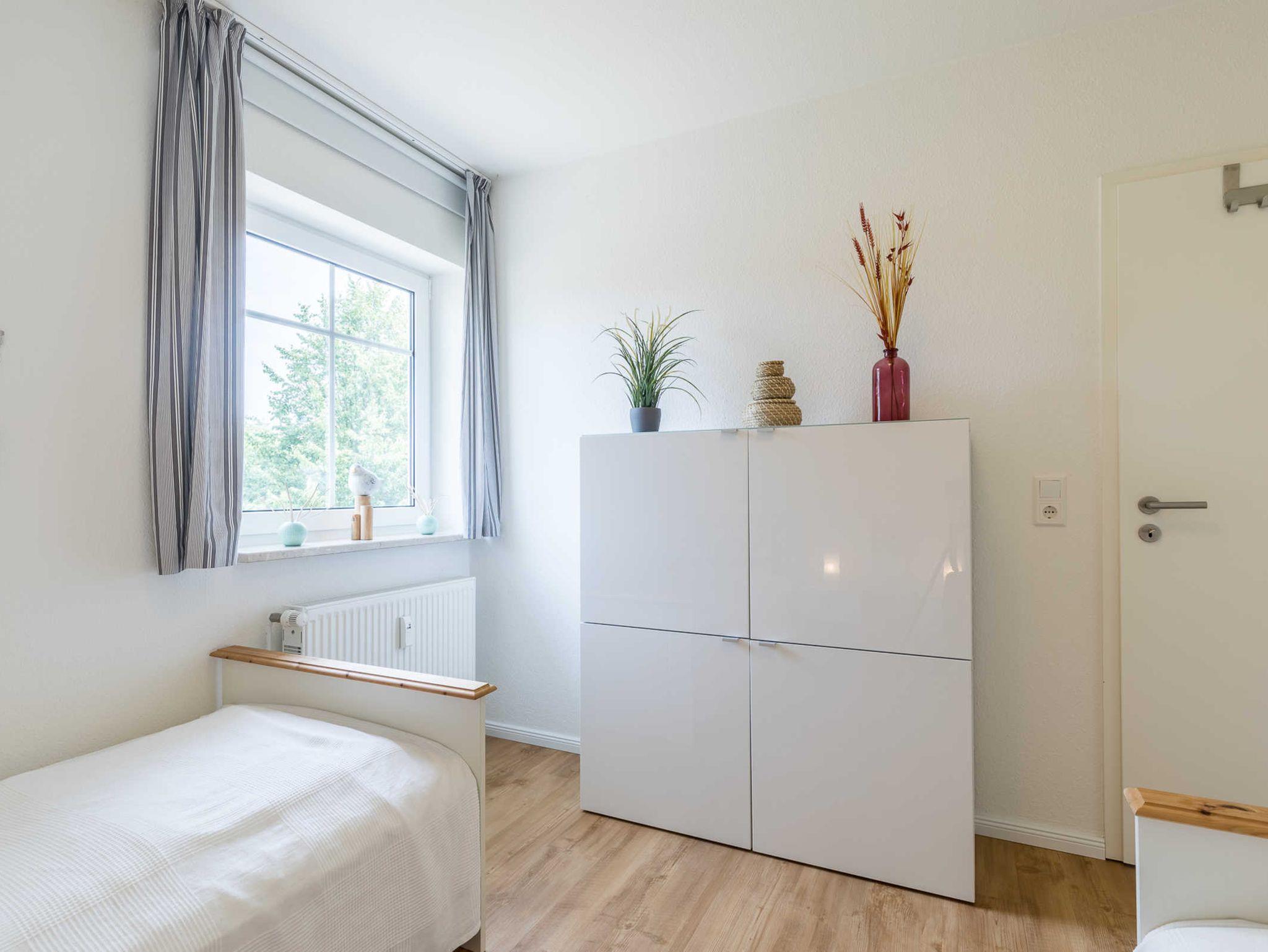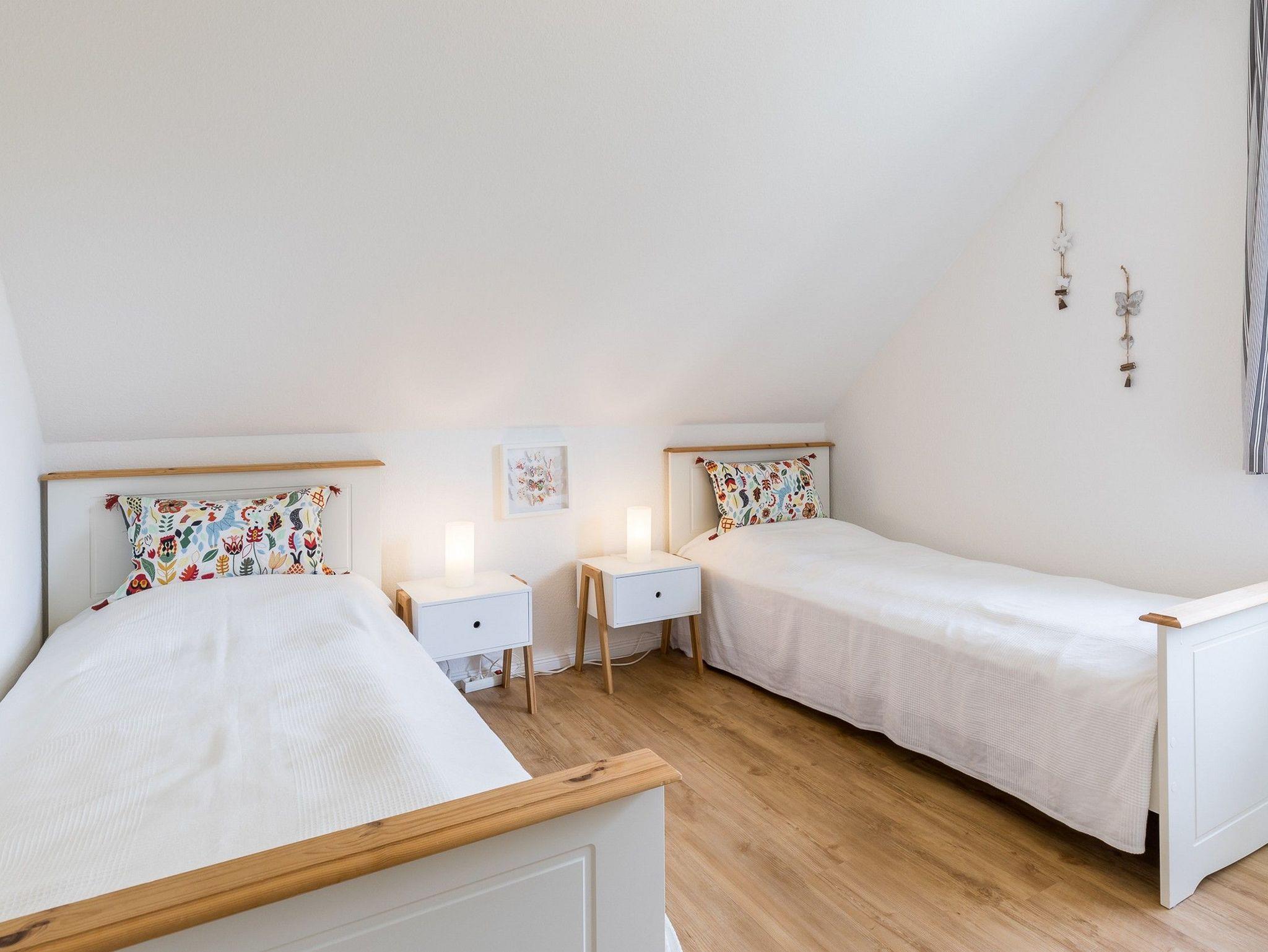 Im Gäste-/ Kinderzimmer befinden sich zwei auch für Erwachsene geeignete Einzelbetten mit einer Liegefläche von je 0,90 m x 2,00 m.