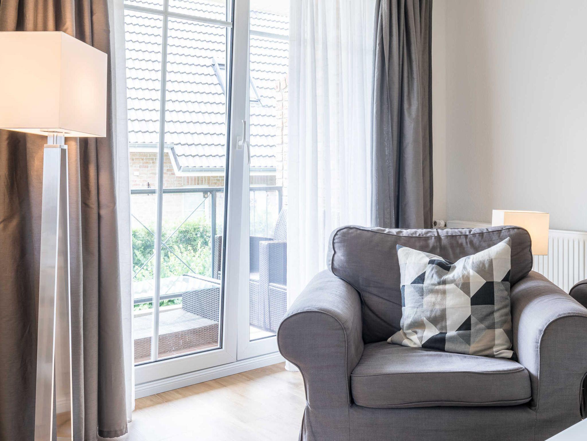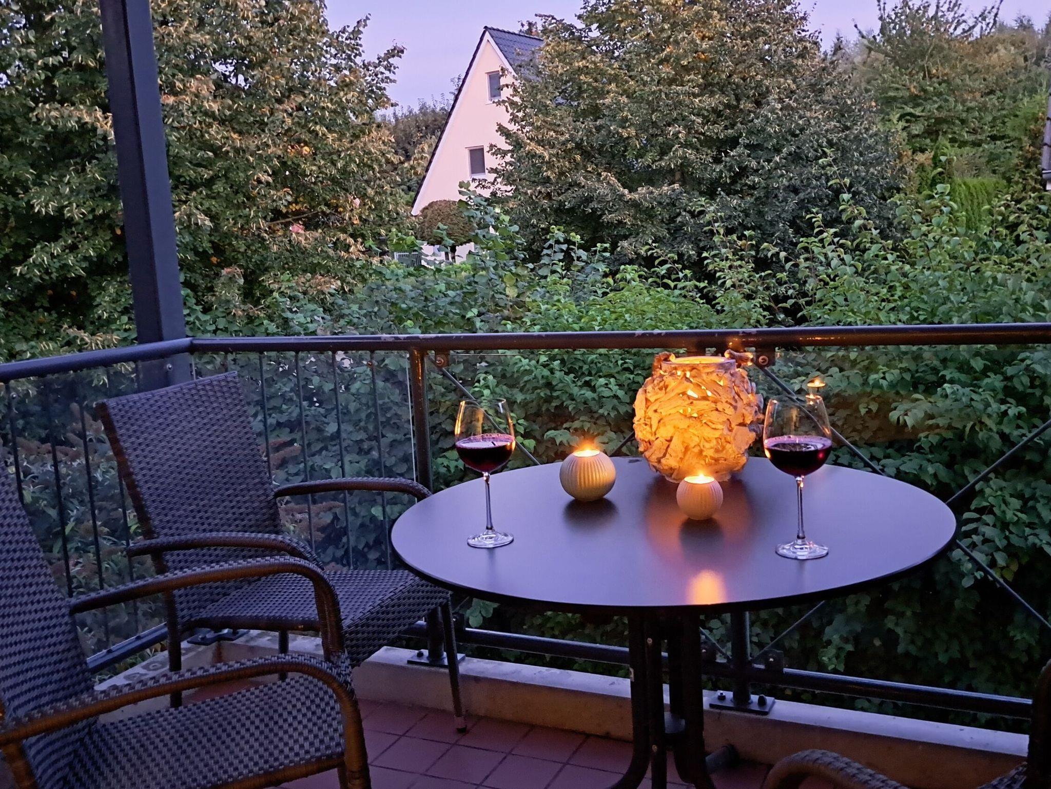 Der möblierte Südbalkon lädt ein, um entspannt bei einem Getränk in gemütlichen Lounge-Sesseln den Urlaub zu genießen.