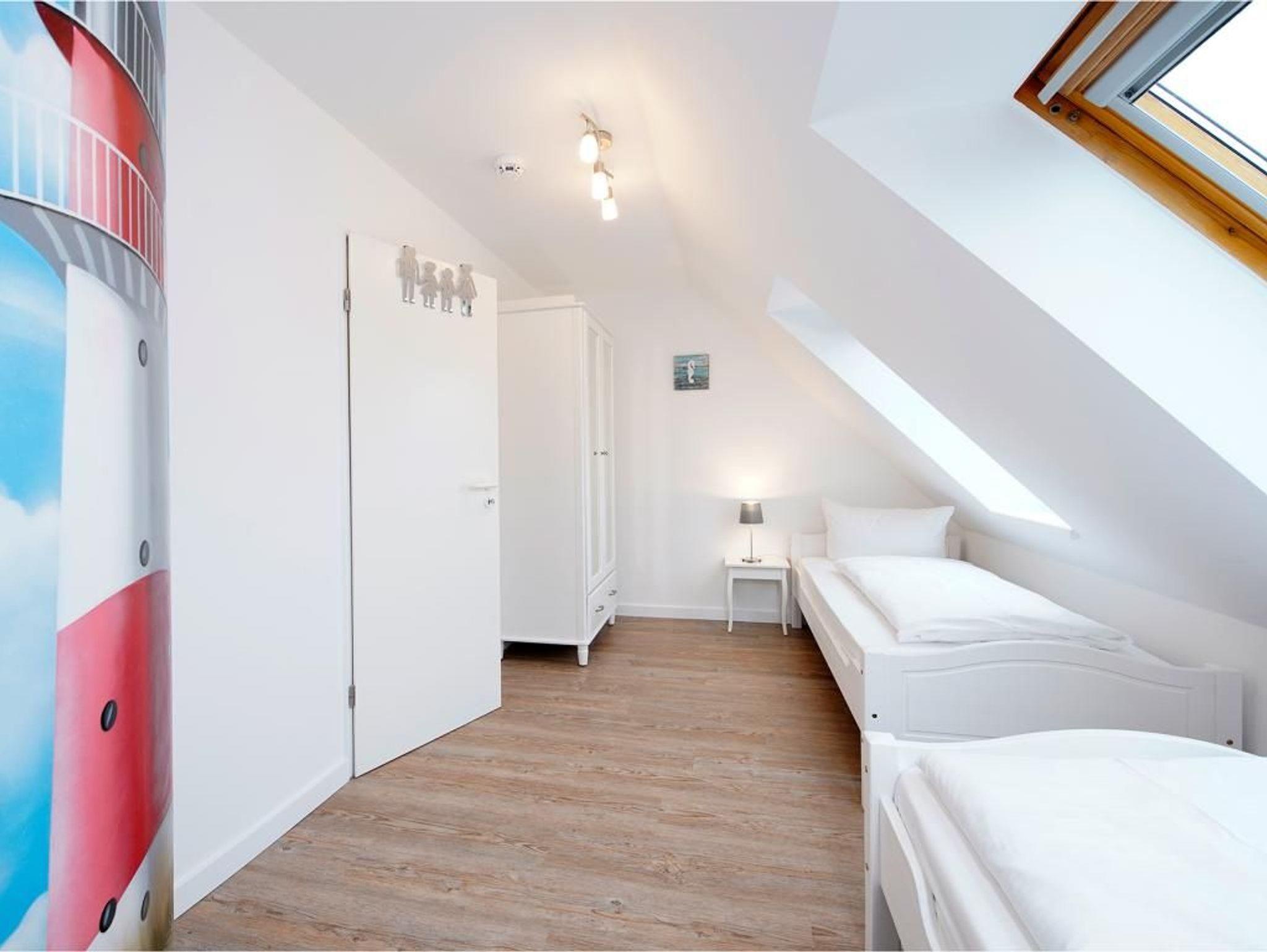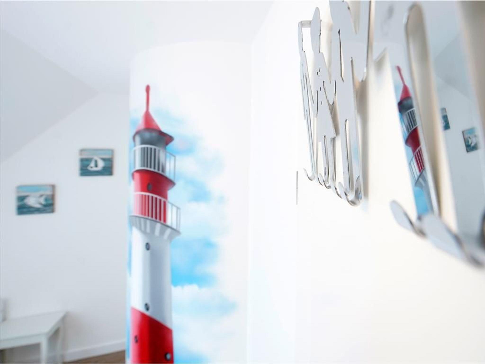 Über eine Wohnraumwendeltreppe erreichen Sie die obere Ebene mit zwei weiteren, separaten Schlafzimmern. Einer der Schlafbereiche ist mit einem Doppelbett, Kleiderschrank, Fernseher, Sessel eingerichtet. Im zweiten Schlafzimmer bzw. Kinderzimmer mit Leuchtturm Tapete, erwarten Sie zwei Einzelbetten und ein Kleiderschrank. Ein modernisiertes Duschbad mit Waschtisch, Handtuchheizung, Föhn, WC befindet sich ebenfalls auf der Schlafraumebene. Für Familien mit Kleinkind sind ein Kinderreisebett und ein Kinderhochstuhl vorhanden. Hausgäste können im Untergeschoss sowohl Waschmaschine als auch Wäschetrockner gegen Gebühr nutzen. Ihr Fahrzeug parken Sie in der hauseigenen Tiefgarage auf einem fest zugeordneten Stellplatz. Mit dem Fahrstuhl gelangen Sie bequem zu den Wohnungsetagen. Im Haus gibt es eine gemeinschaftlich nutzbare Fahrradabstellmöglichkeit.