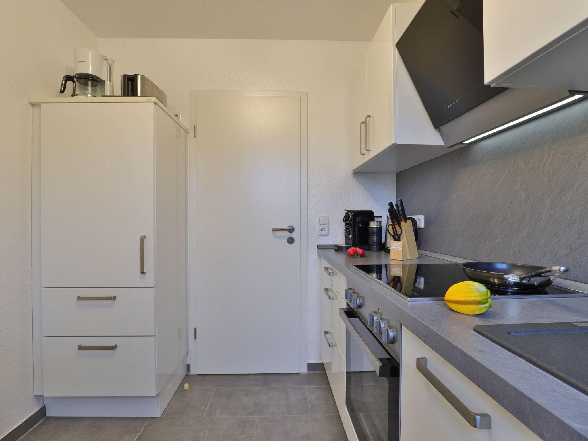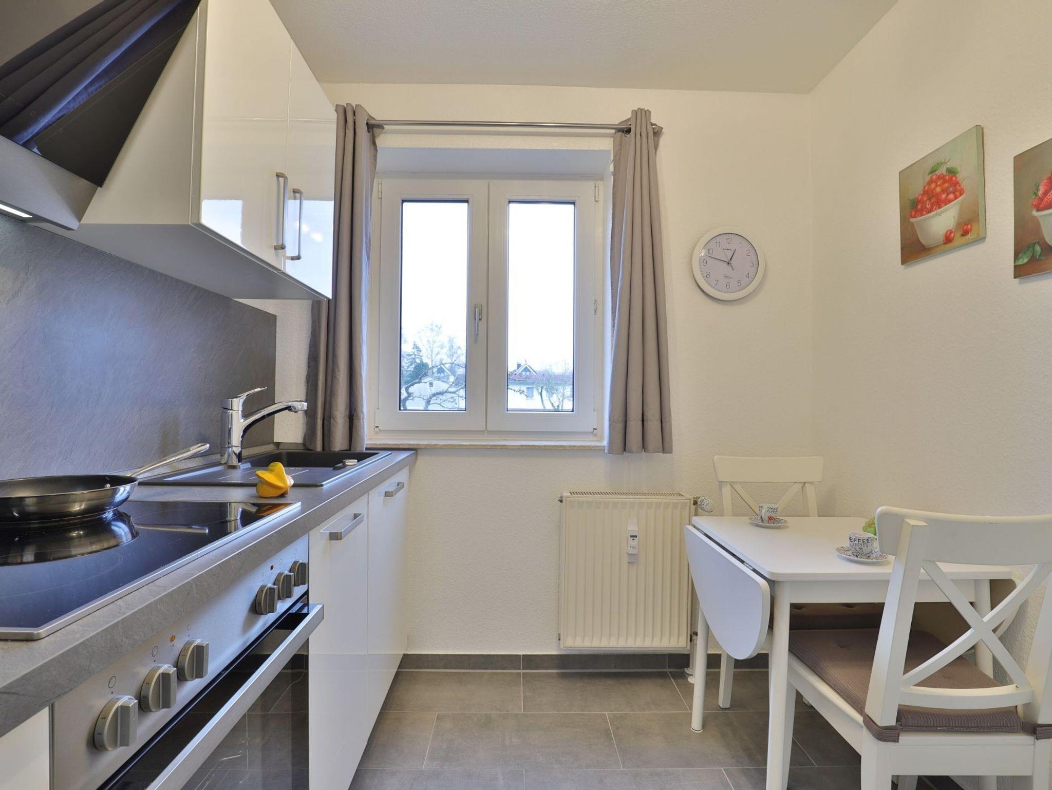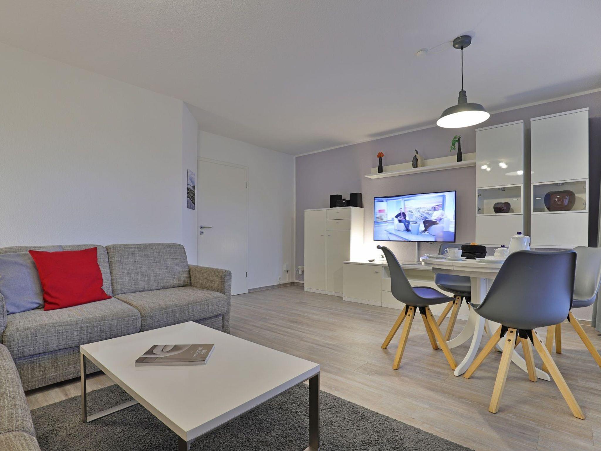 Im Hochparterre des Hauses empfängt Sie dieses modern eingerichtete 2- Zimmer Appartement mit einer Wohnfläche von 50qm sowie Terrasse. Mit bis zu 4 Personen können Sie in der hellen Ferienwohnung einen schönen Urlaub verbringen. Im Wohn-Essbereich steht ein bequemes Sofa, das als ausziehbare Schlafgelegenheit zwei zusätzliche Schlafmöglichkeiten bietet. Zudem befindet sich im Wohnzimmer ein Esstisch mit 4 Stühlen sowie Fernseher und Musikanlage. WLAN nutzen Sie kostenfrei. Vom Wohnbereich betreten sie die saisonal möblierte Terrasse. Die Küche ist separat und bestens ausgestattet mit Ceranfeldherd, Backofen, Dunstabzug, Kühlschrank mit Frostfach, Spülmaschine, Kaffeemaschine, Wasserkocher, Toaster usw. Erholsame Nächte verbringen Sie im komfortabel möblierten Schlafzimmer mit Doppelbett und Kleiderschrank. Familien mit Kleinkind freuen sich über einen bereitstehenden Kinderhochstuhl und Kinderbett sowie Waschmaschine und Bügeleisen.