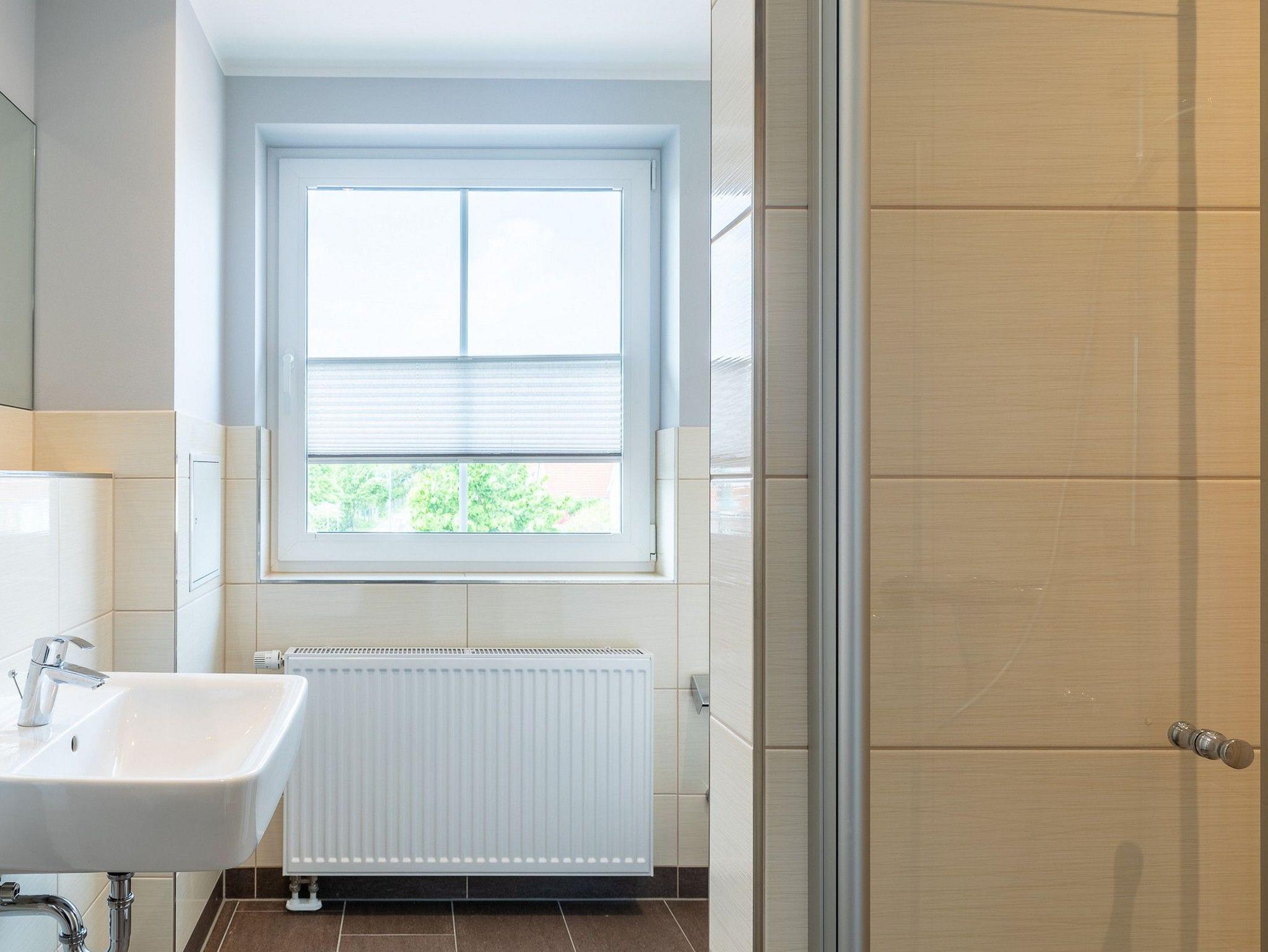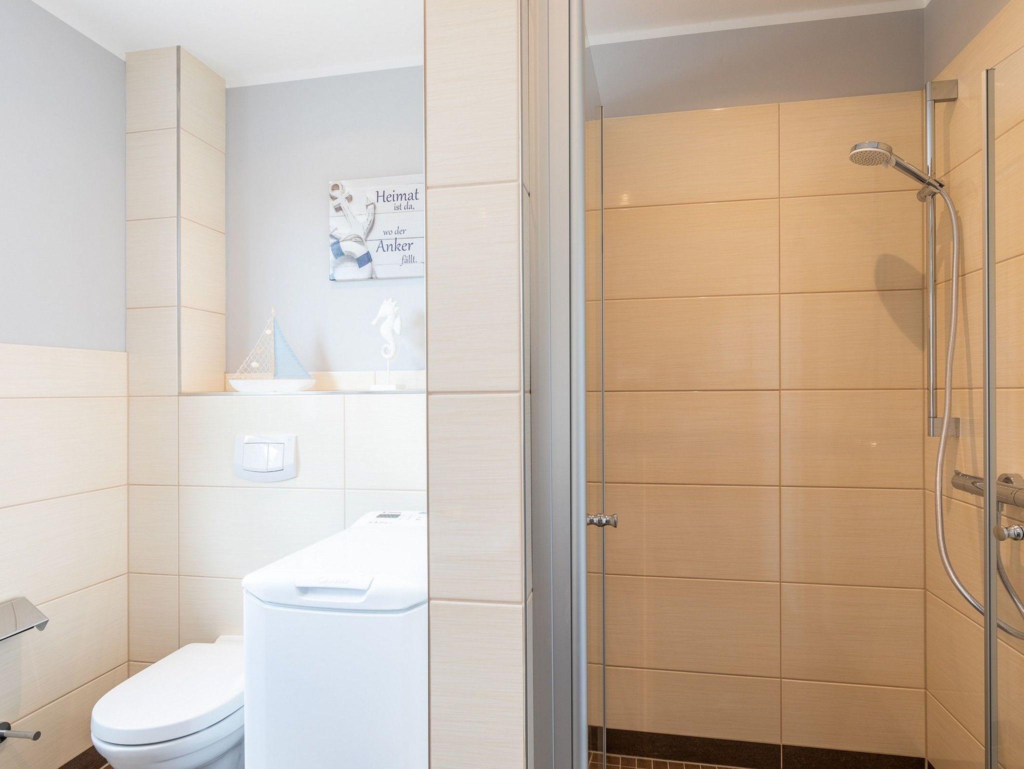 Das moderne Bad mit Tageslicht bietet eine barrierefreie Dusche, Waschbecken, WC und auch eine Waschmaschine.