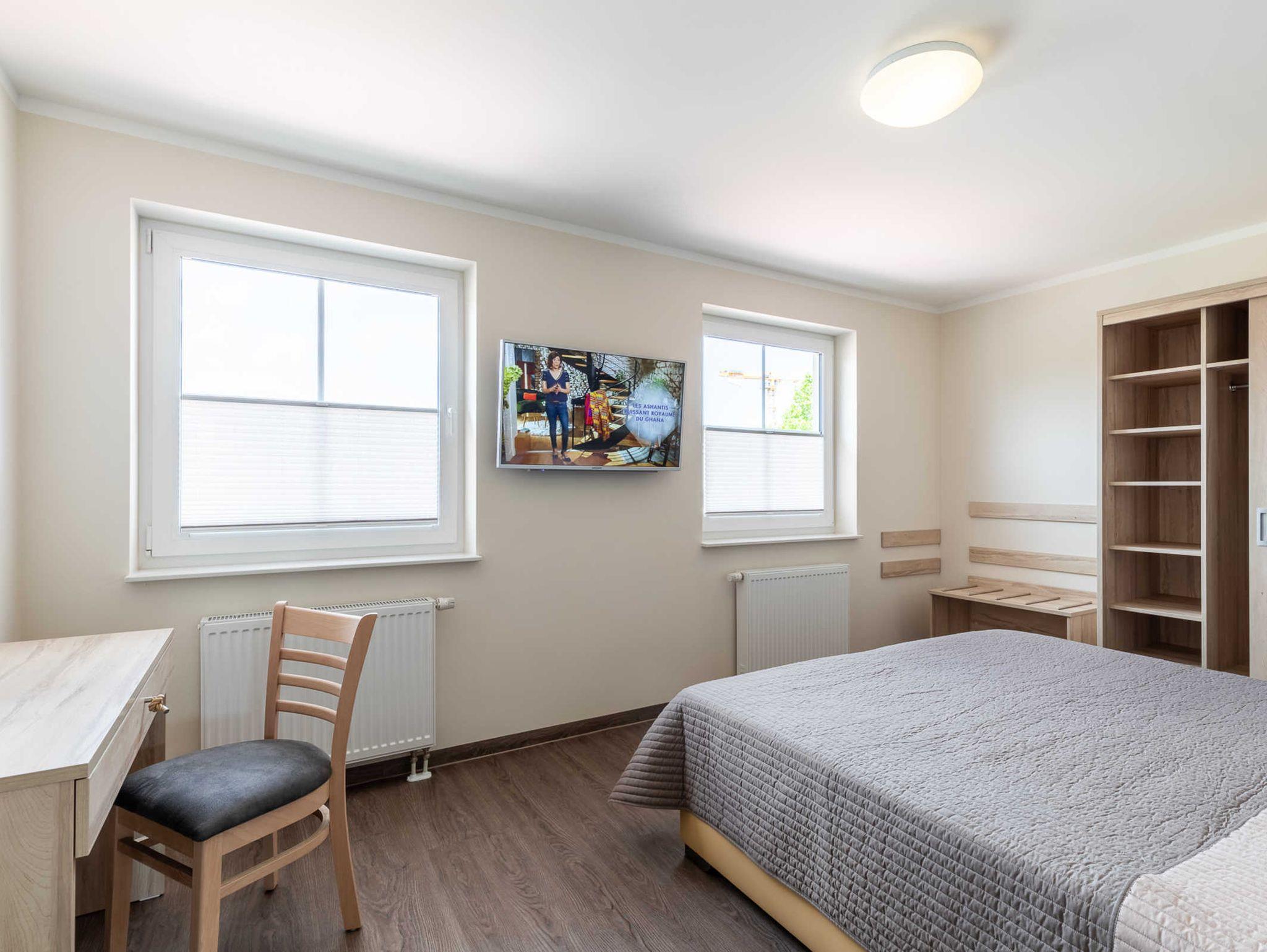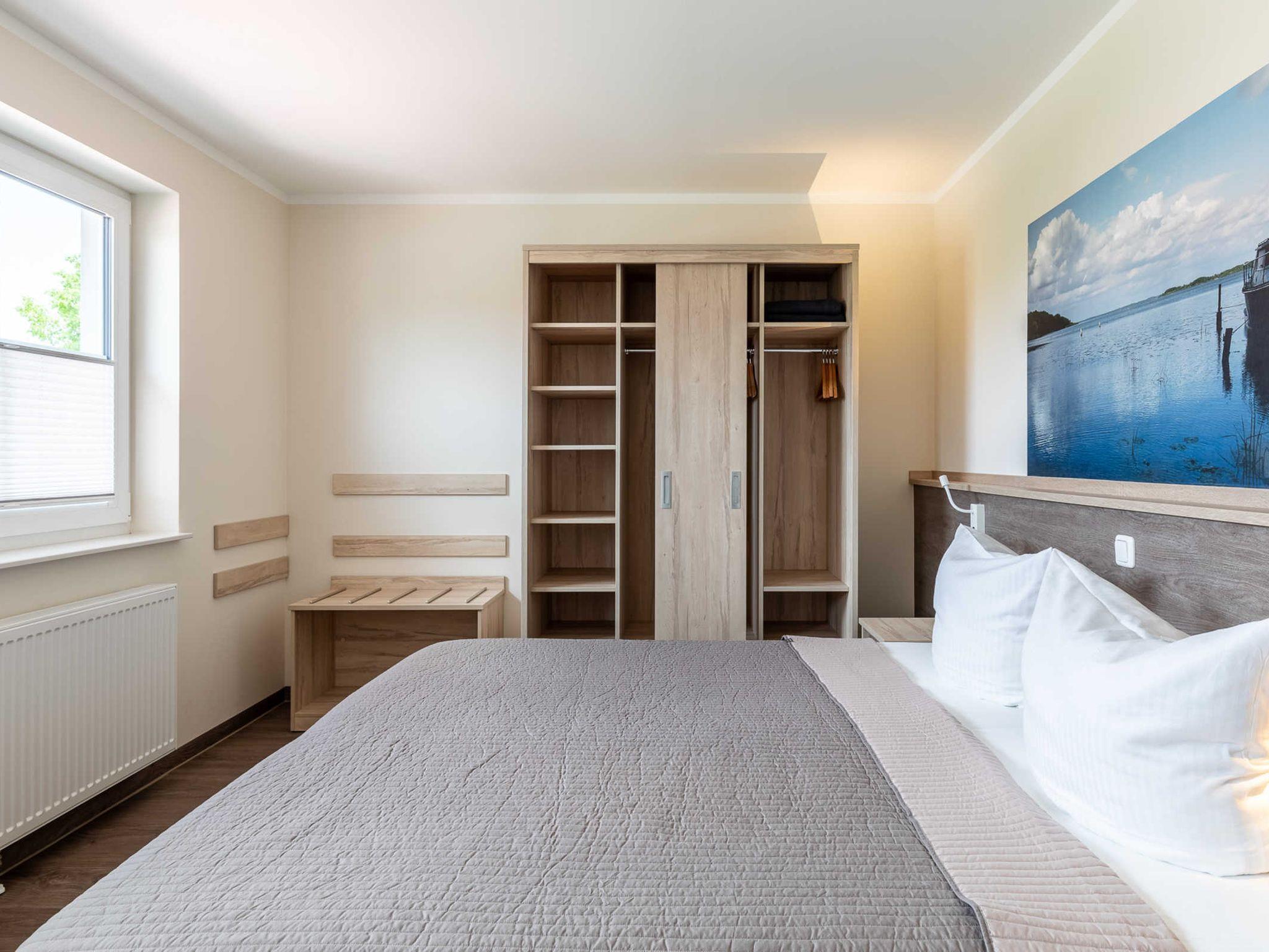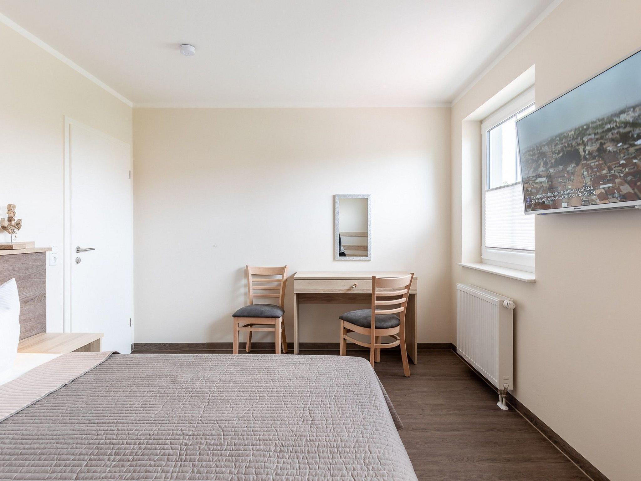Das Schlafzimmer ist mit einem Doppelbett und einem geräumigen Kleiderschrank ausgestattet. Ein TV ist an der Wand angebracht. Am ebenfalls hier vorhandenen Schreibtisch können Sie bequem z.B. Ihre Urlaubspost schreiben...