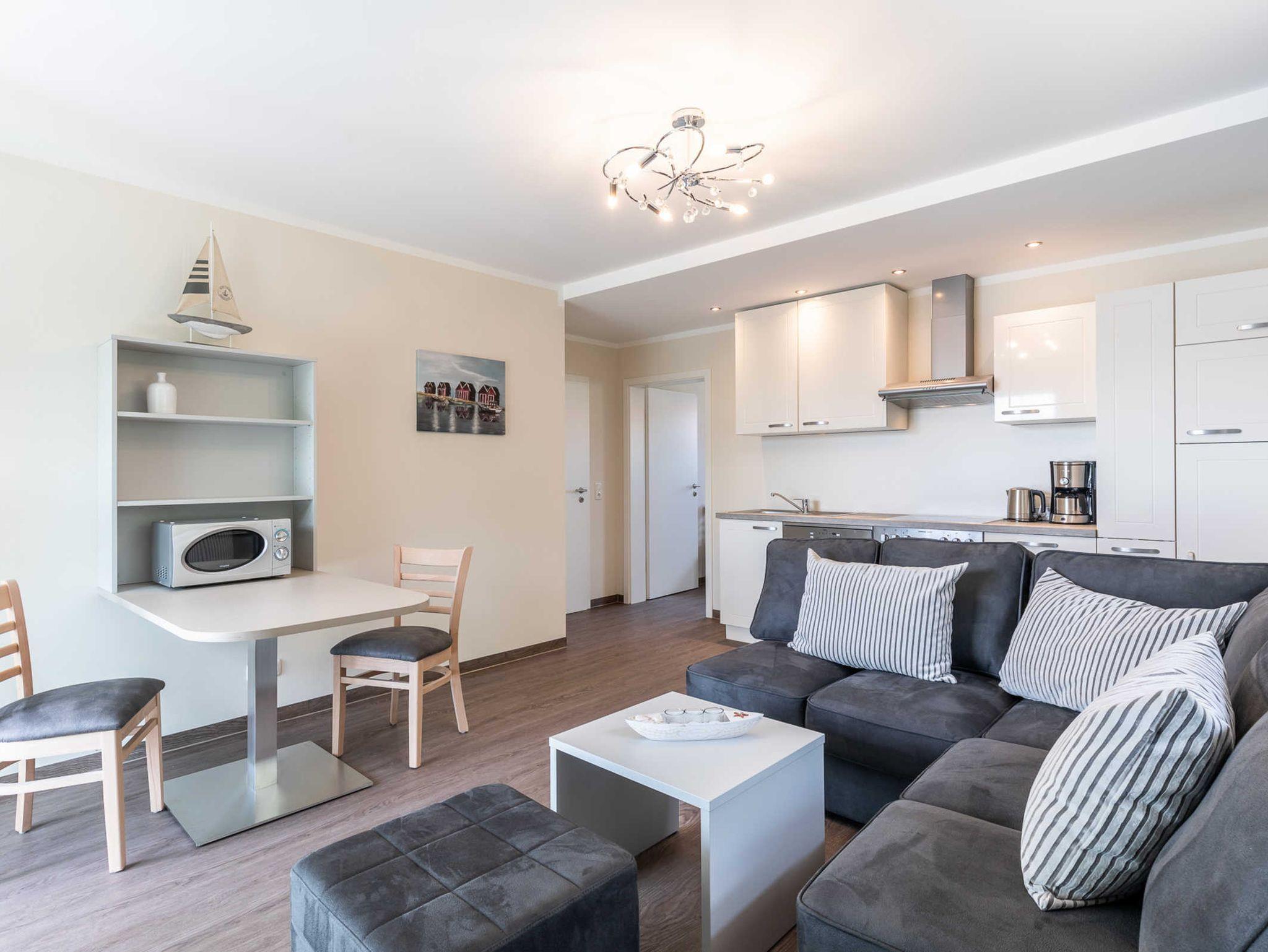 Die hell und modern eingerichtete 2-Zimmer-Ferienwohnung befindet sich im 1.OG und bietet auf rund 58qm Wohnfläche über eine hervorragende Ausstattung für einen unvergesslichen Ostseeurlaub zu Zweit.