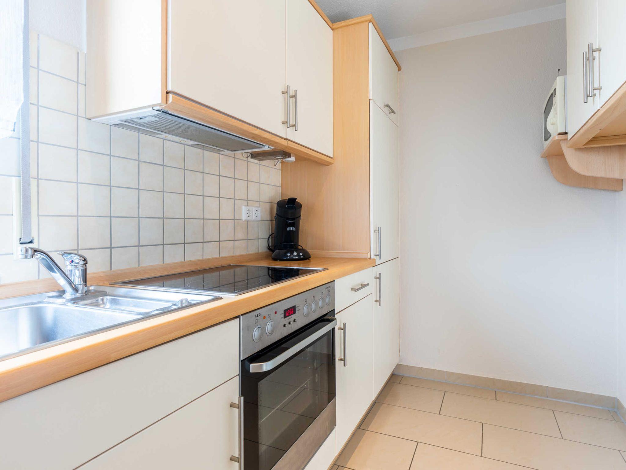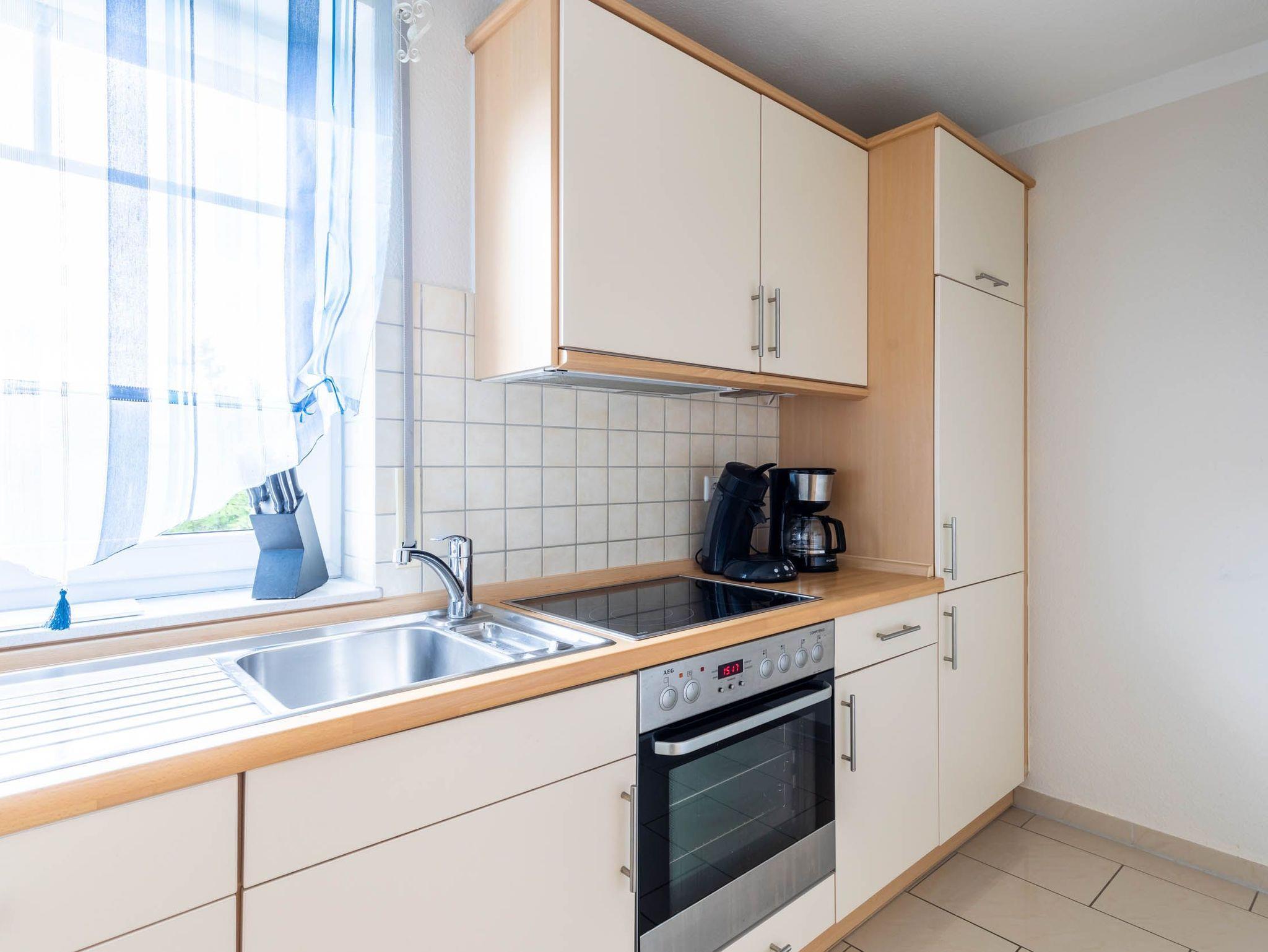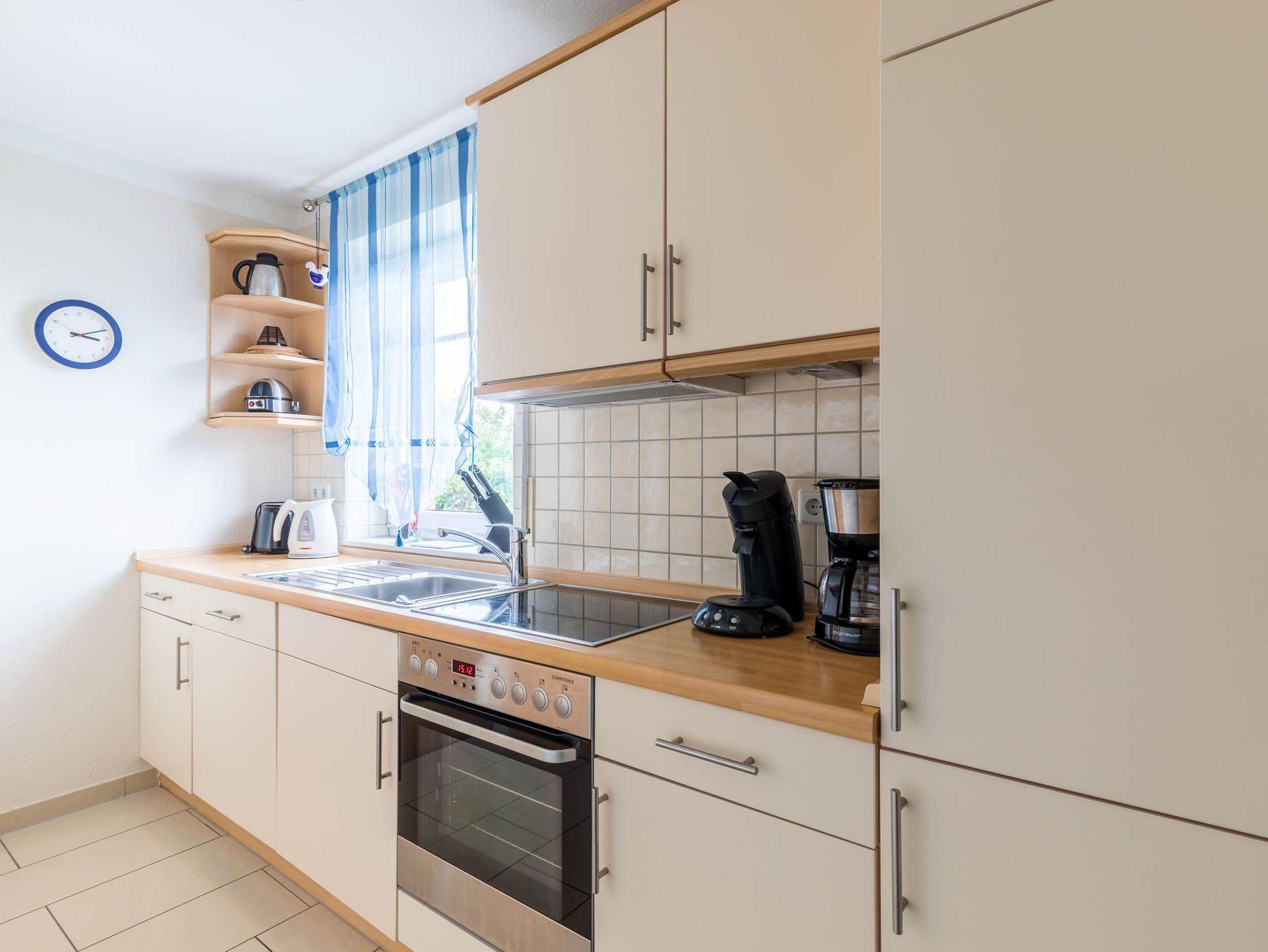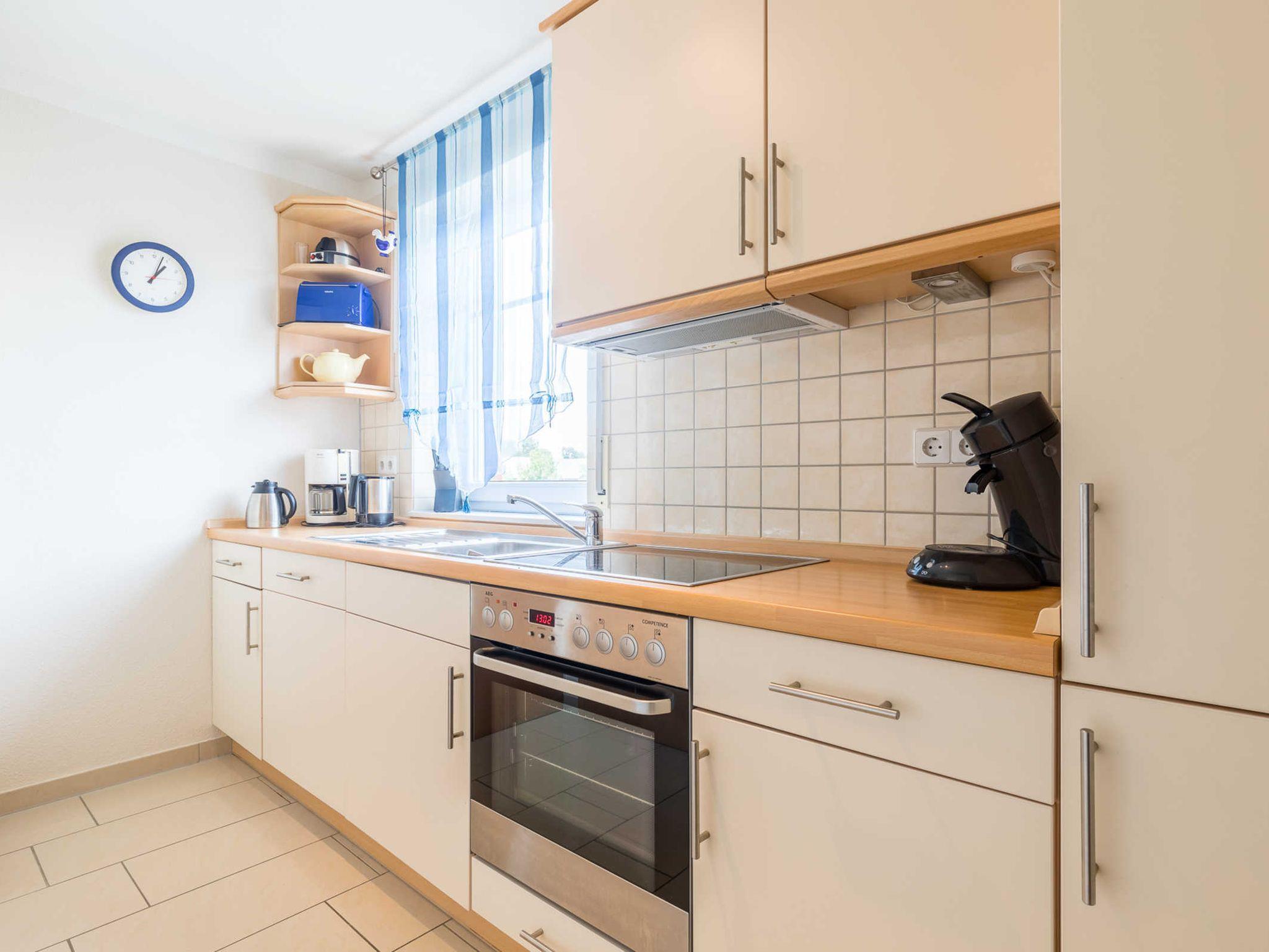 Die separate Küche ist modern mit Kühlschrank mit Gefrierfach, Herd/ Ceranfeld, Backofen, Geschirrspüler, Mikrowelle, Elektrokleingeräte sowie ausreichend Geschirr [&] Co. ausgestattet.