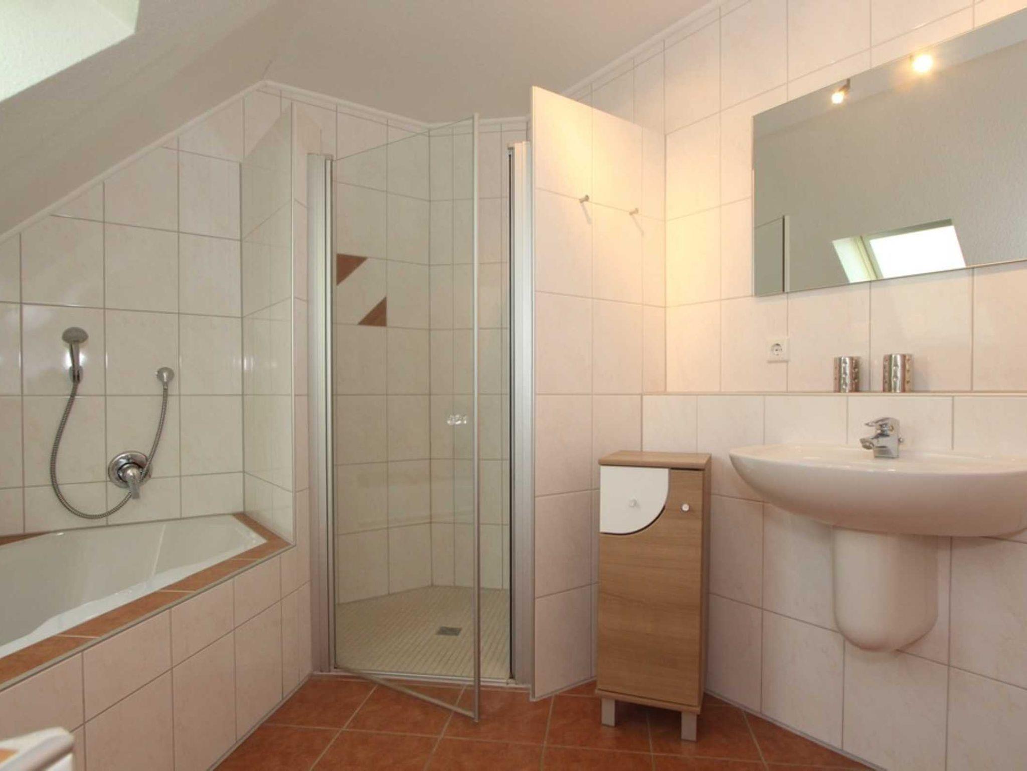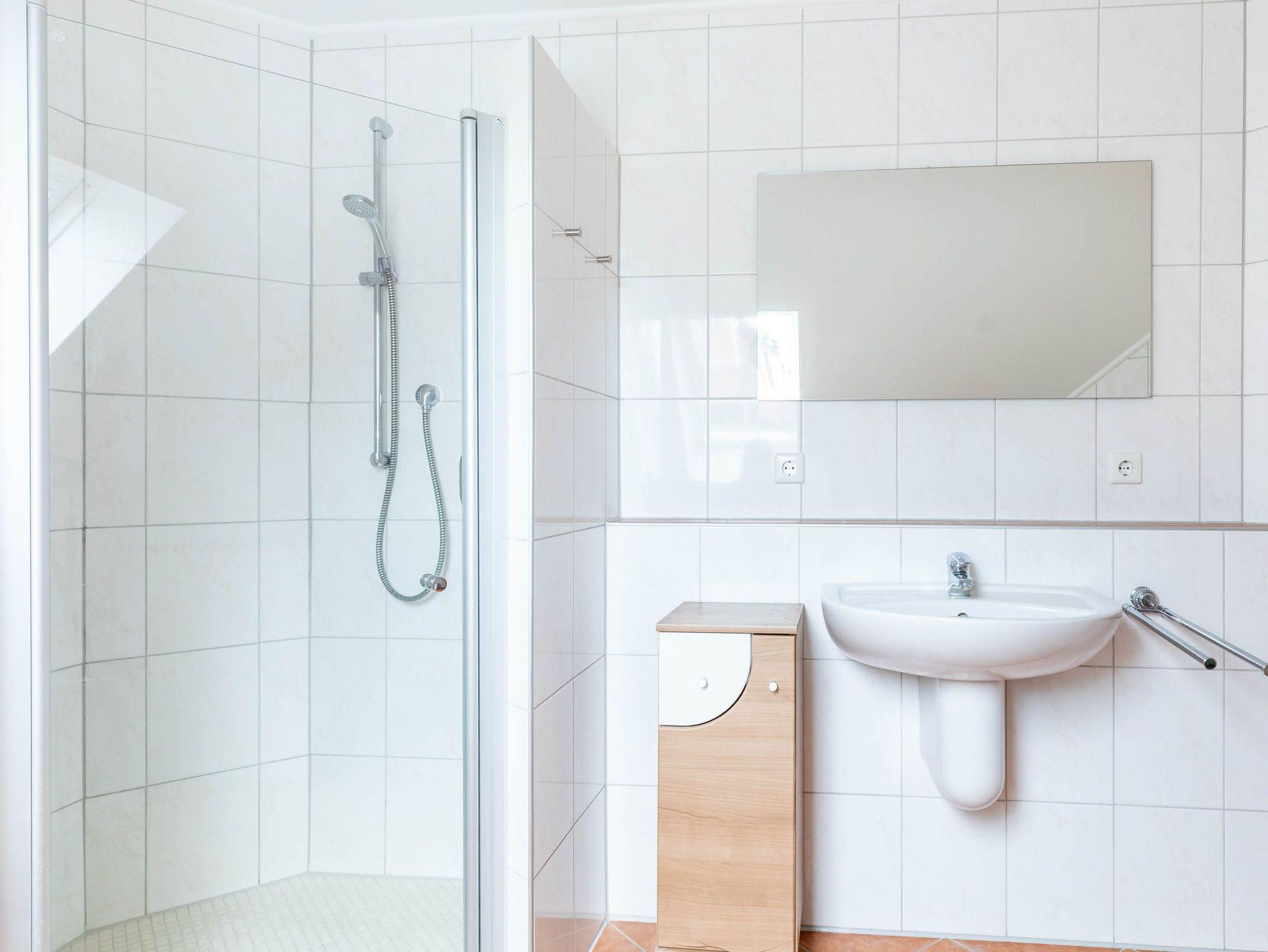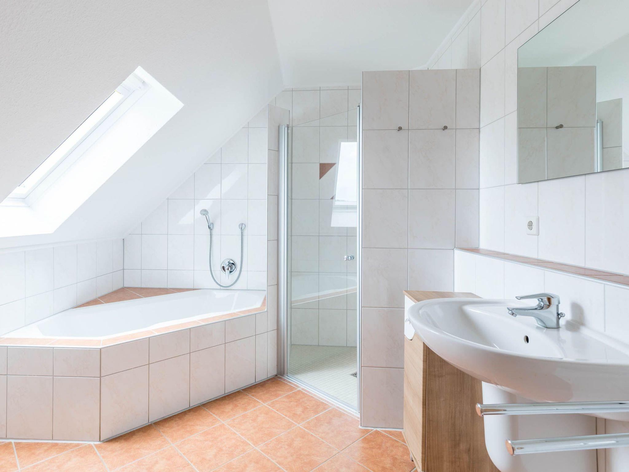 Ein großes Bad mit barrierefreier Dusche, Eckbadewanne und Waschtisch, getrennt vom separaten WC-Raum, ermöglichen hier zu jeder Zeit auch bei voller Belegung einen stressfreien Ablauf.