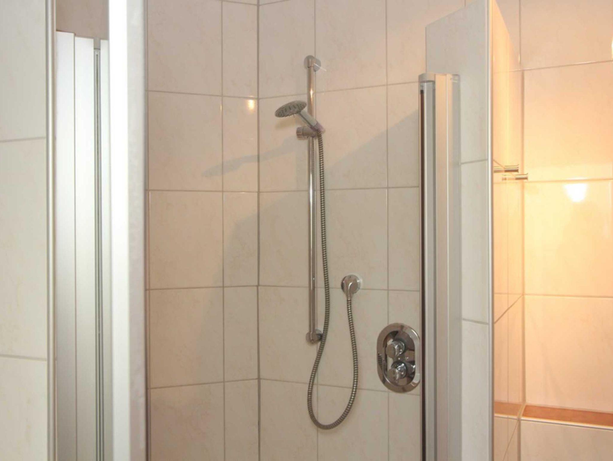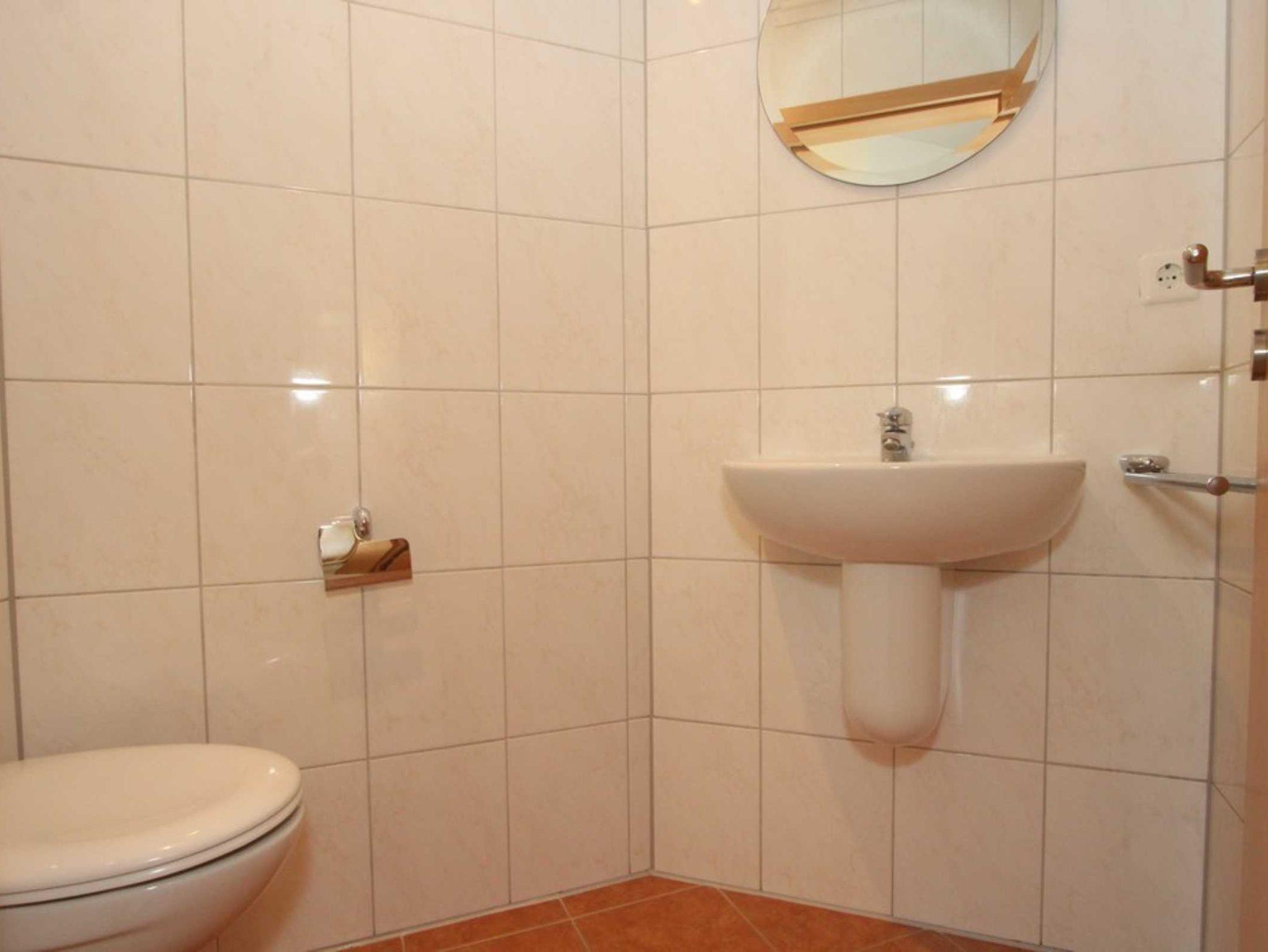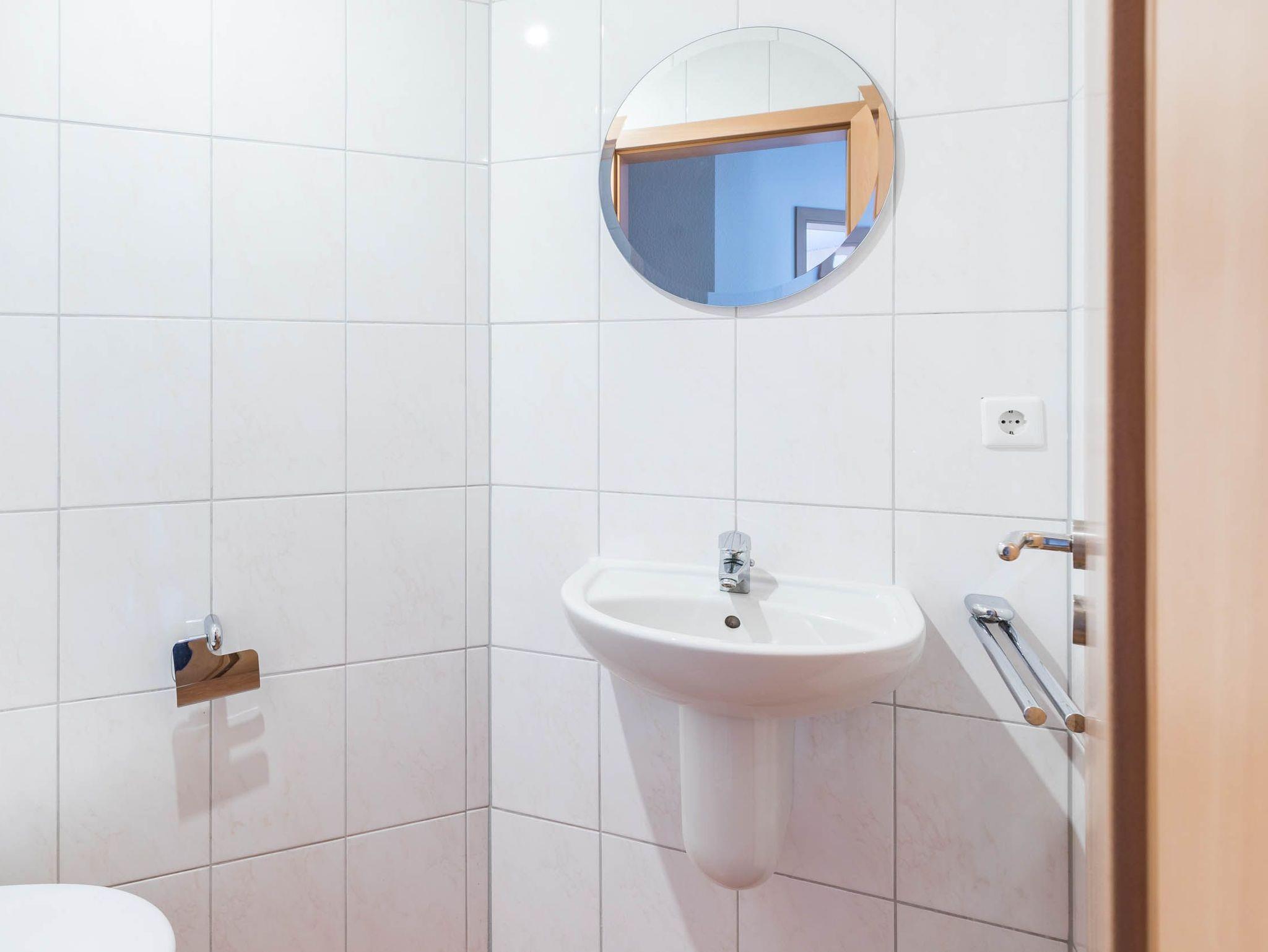 Ein großes Bad mit barrierefreier Dusche, Eckbadewanne und Waschtisch, getrennt vom separaten WC-Raum, ermöglichen hier zu jeder Zeit auch bei voller Belegung einen stressfreien Ablauf.
